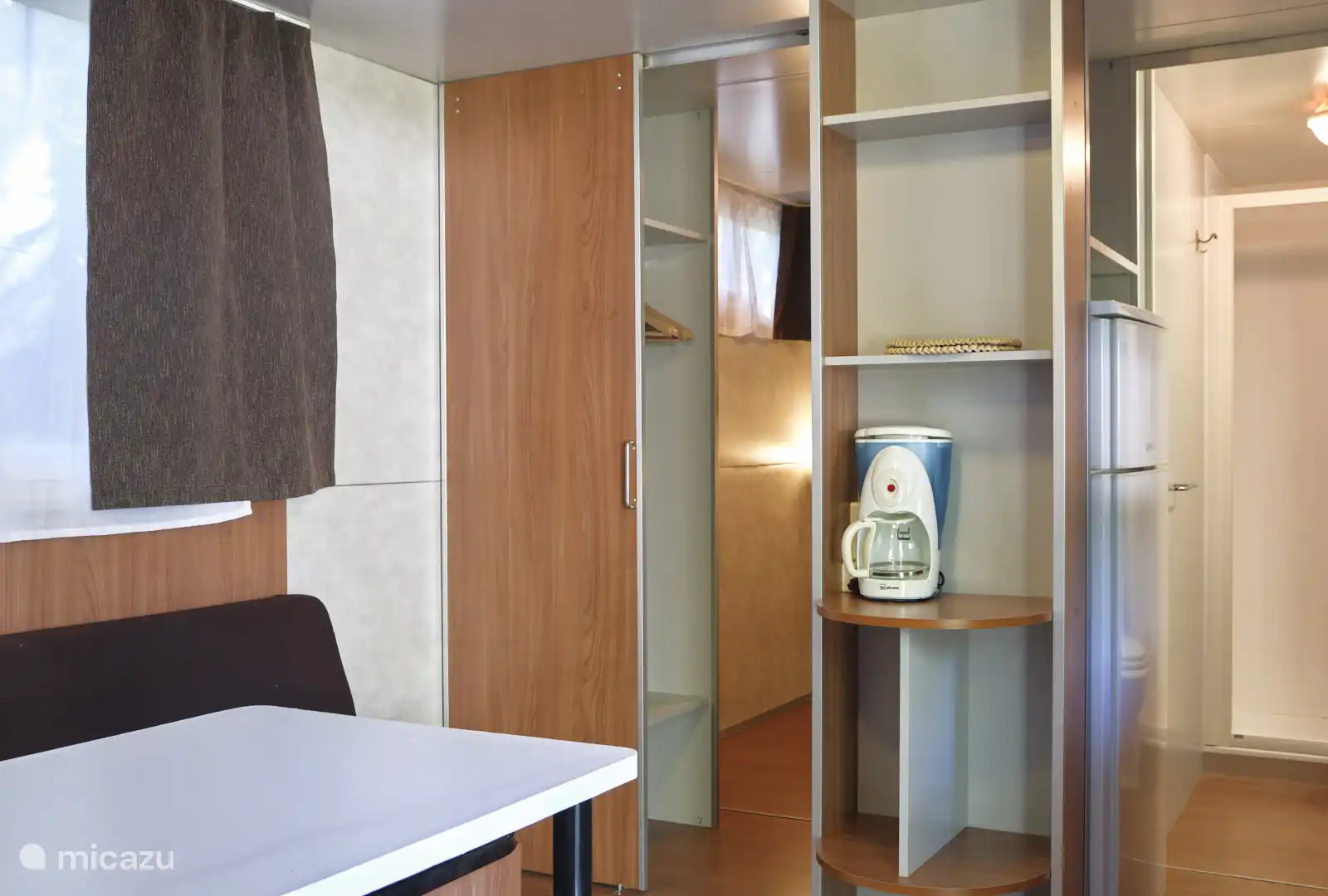 Een van de grootste troeven van deze mobilhome is het prachtige overdekte terras dat over de volledige lengte loopt.
