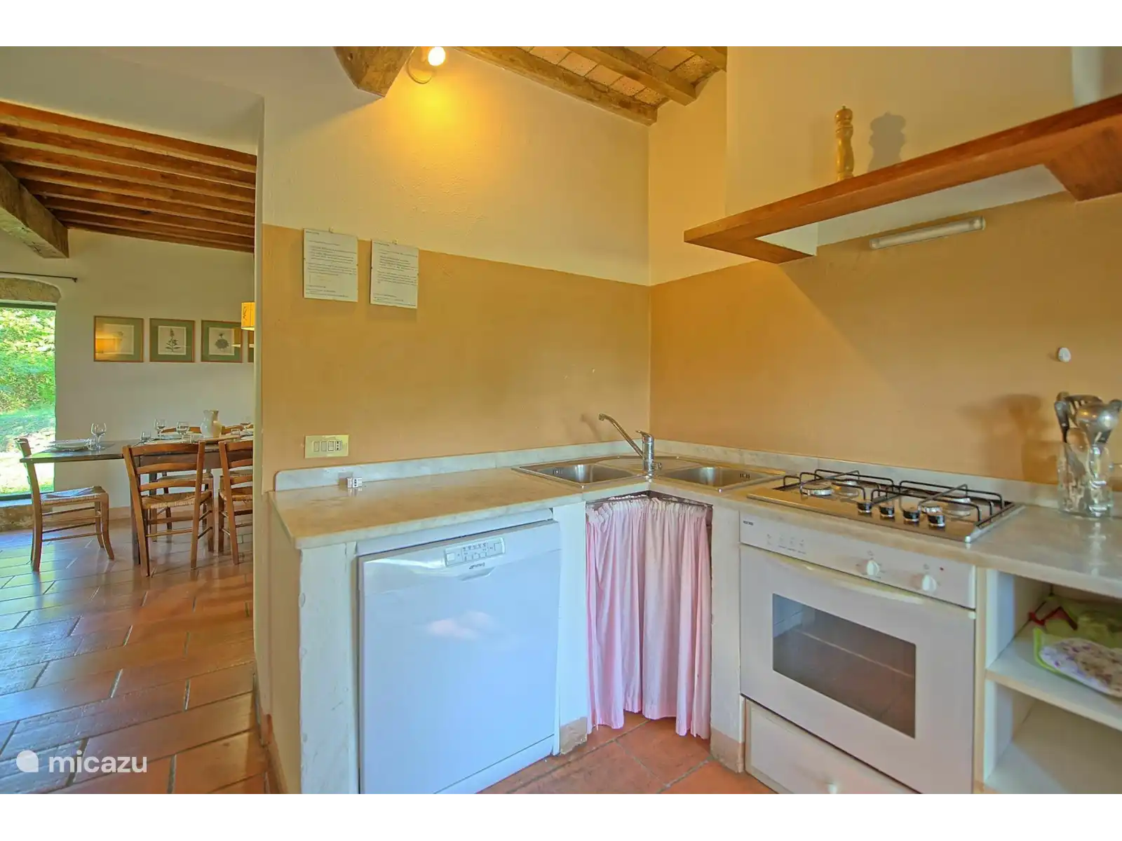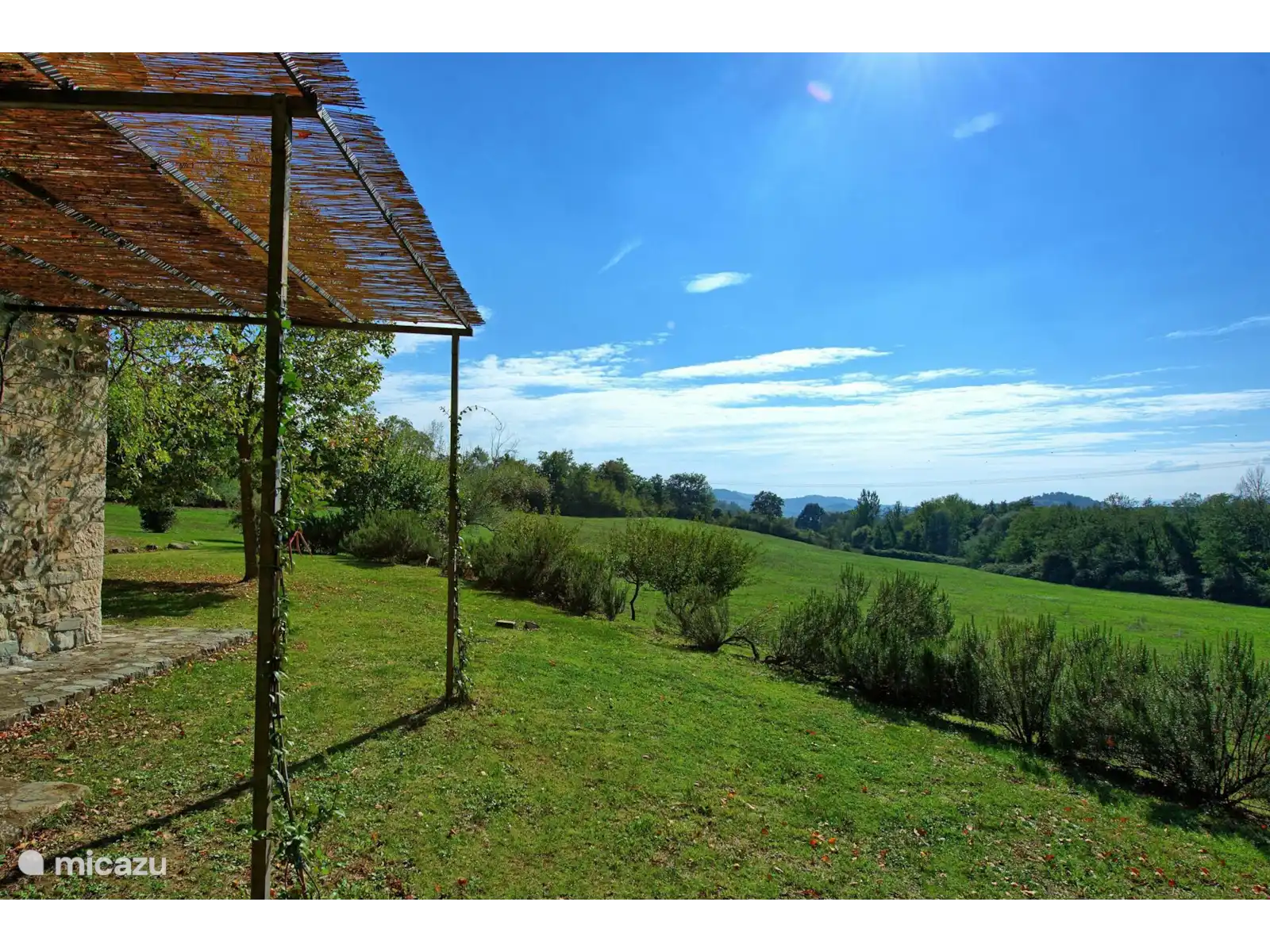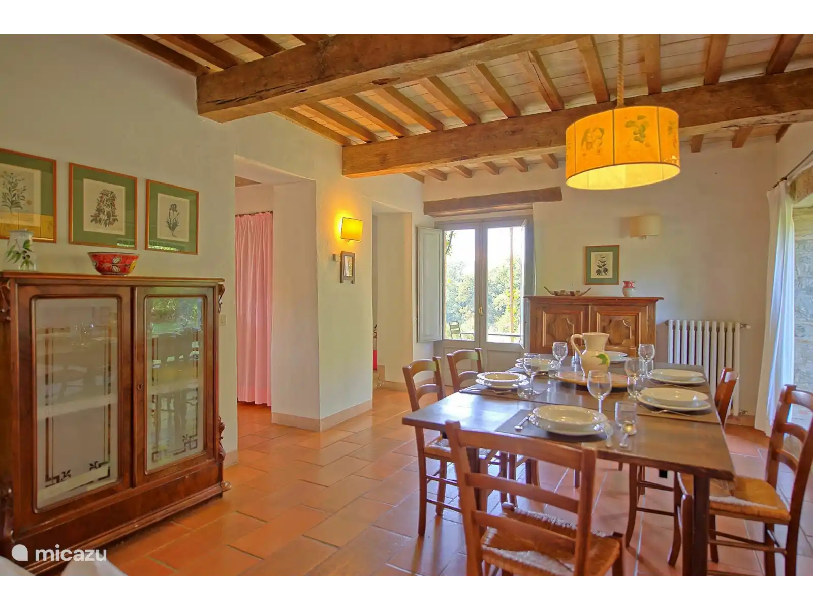 Een mooie eethoek buiten, ingericht met tafels, stoelen en een verplaatsbare barbecue, is beschikbaar voor de gasten om te genieten van al-fresco maaltijden overdekt door een pergola. Dit vakantiehuis is perfect om een authentieke vakantie in Toscane door te brengen, het huis is omringd door bomen en natuur en biedt een adembenemend panoramisch uitzicht over de heuvels en het landschap.