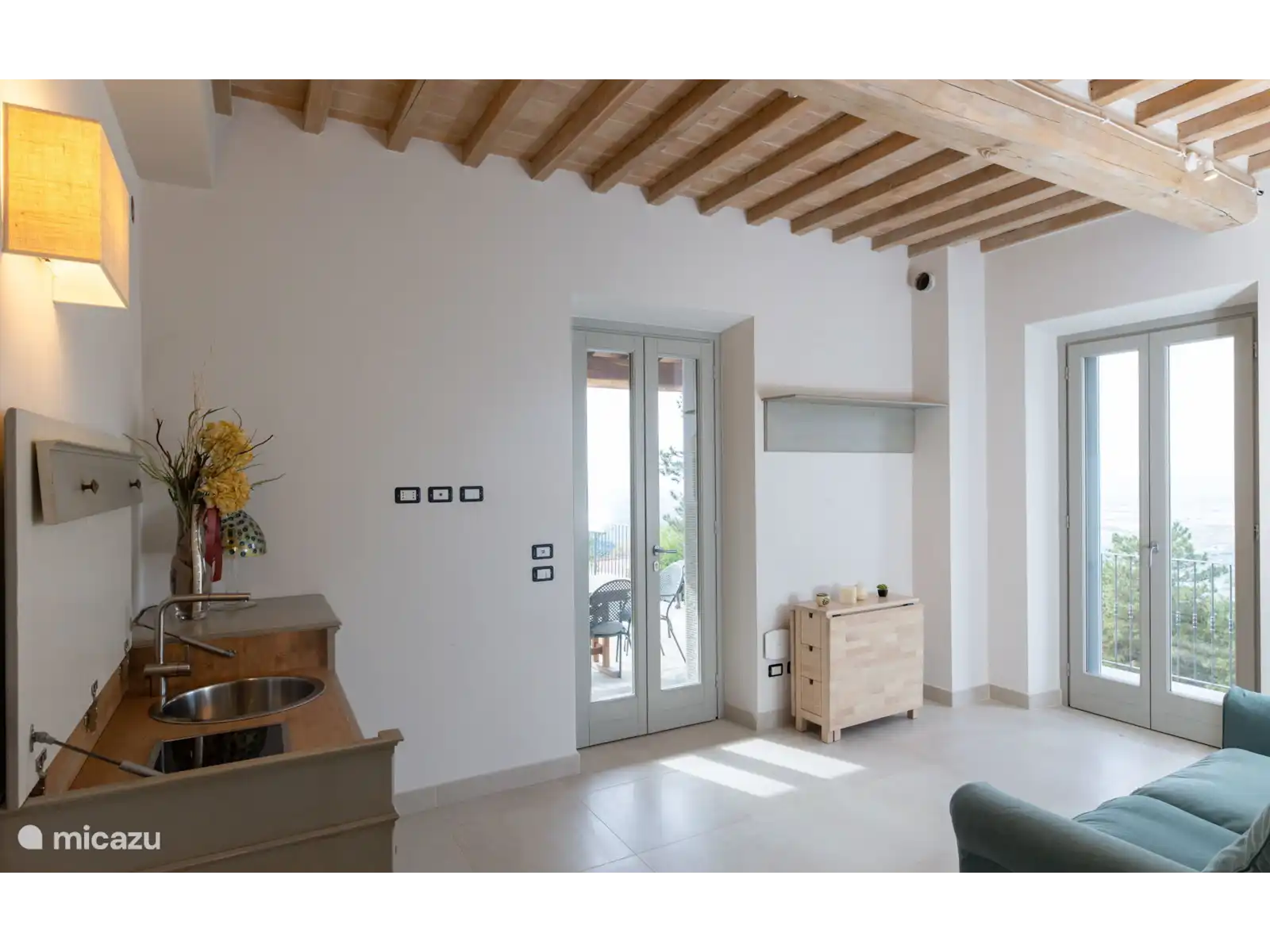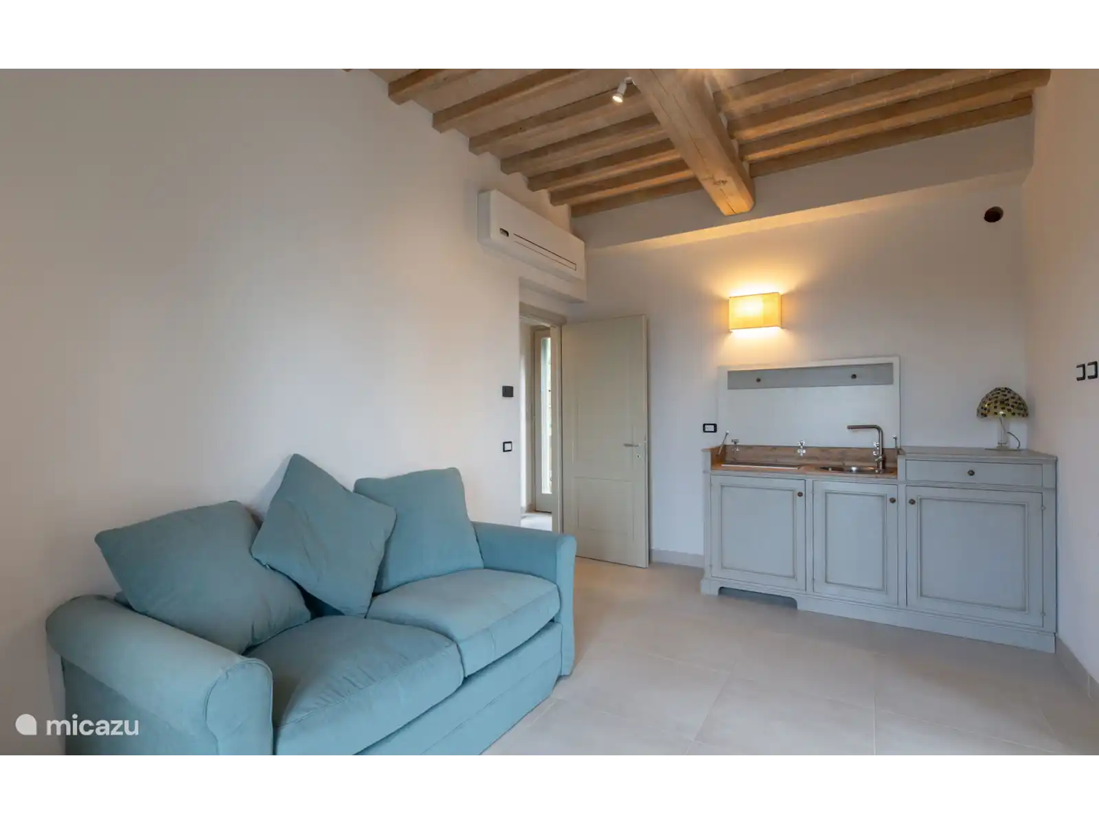 - Een woonkamer met bank en een verborgen kitchenette met inductie, gootsteen, koelkast. Directe uitgang naar de veranda en het tuin-/zwembadgebied