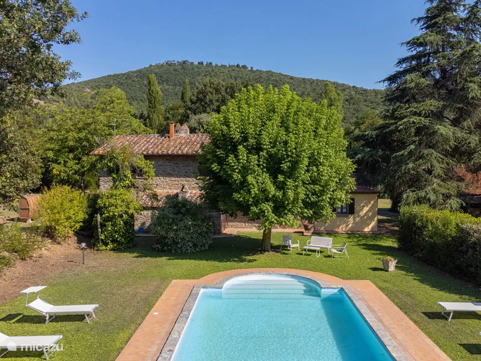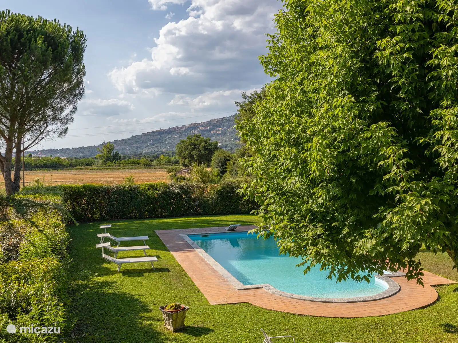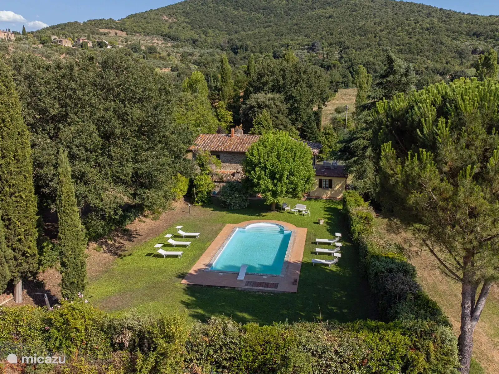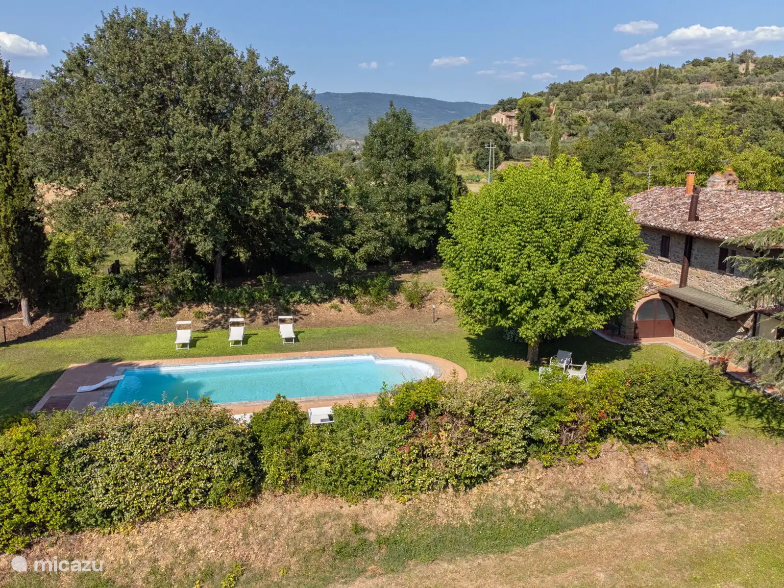 Het zwembad (10x5 meter, minimaal 1.230 tot 1,80 meter) is compleet met ligstoelen en overdag goed blootgesteld aan de zon en geniet van een prachtig uitzicht op Cortona. Voor de keuken staat een pergola waar je een grote tafel kunt vinden om buiten te eten. Op het terrein heb je ook ruimte om je auto te parkeren.
