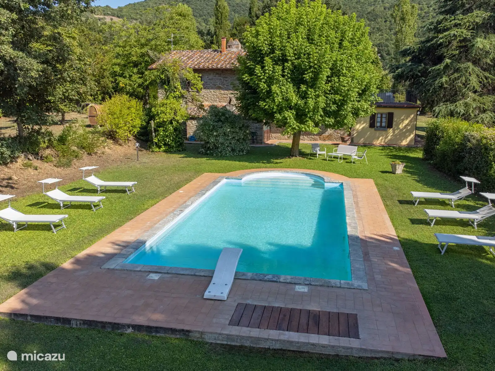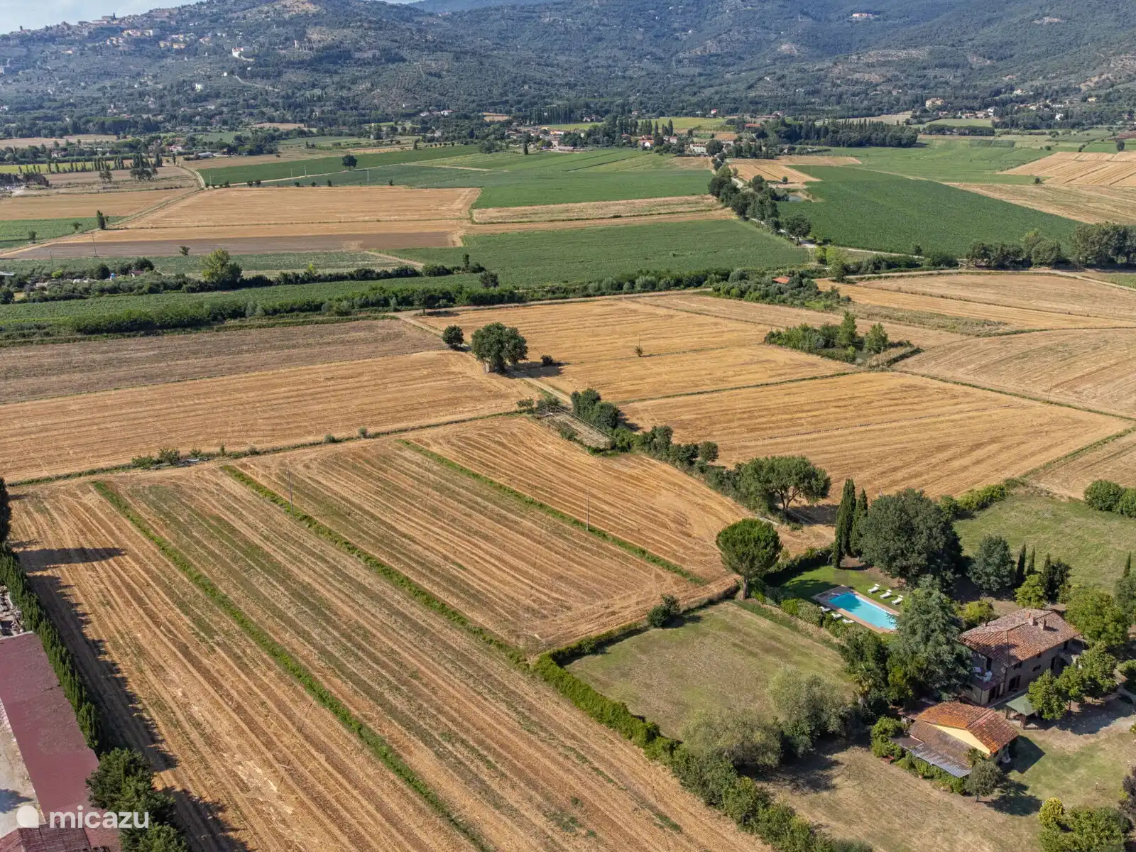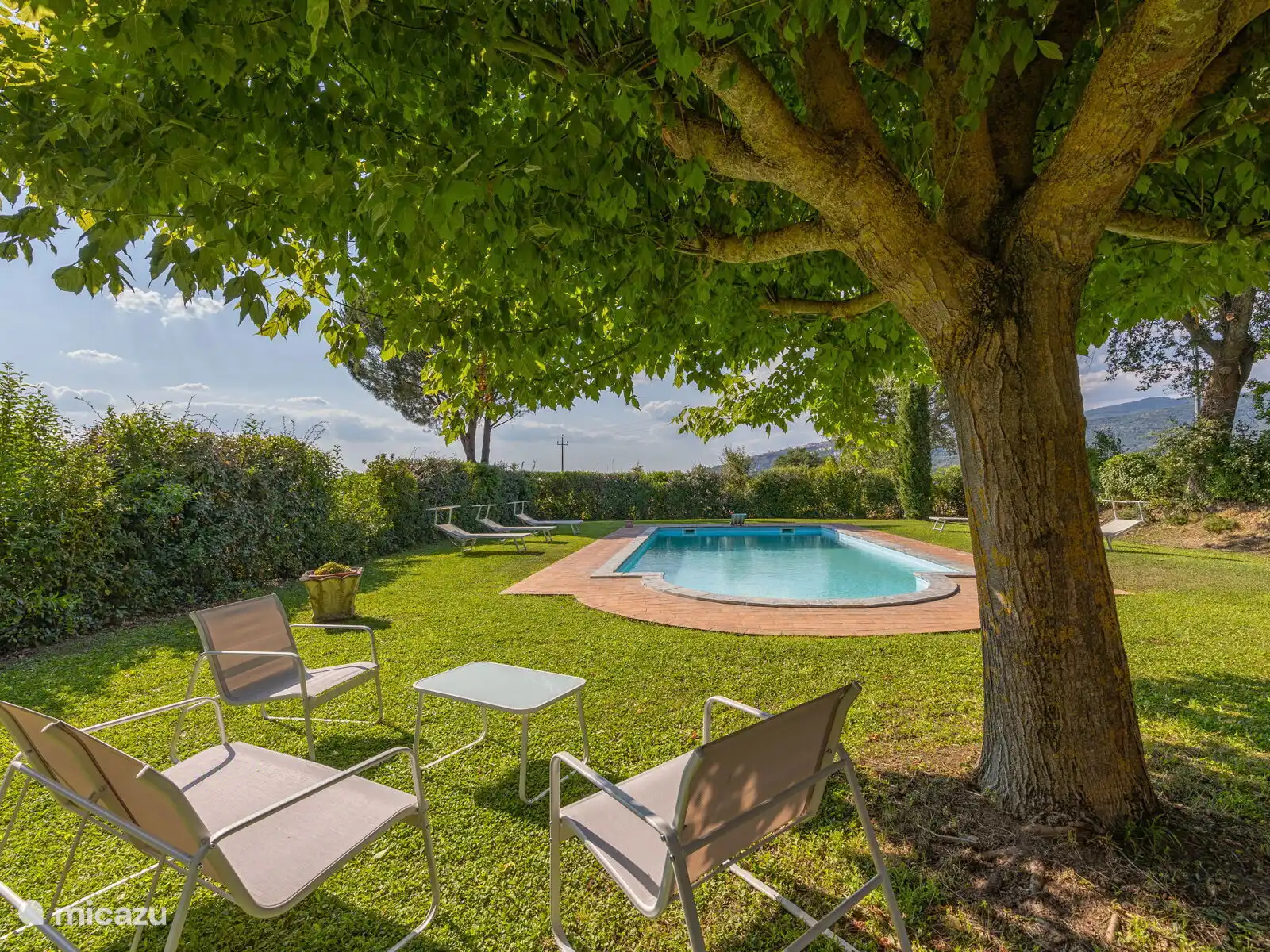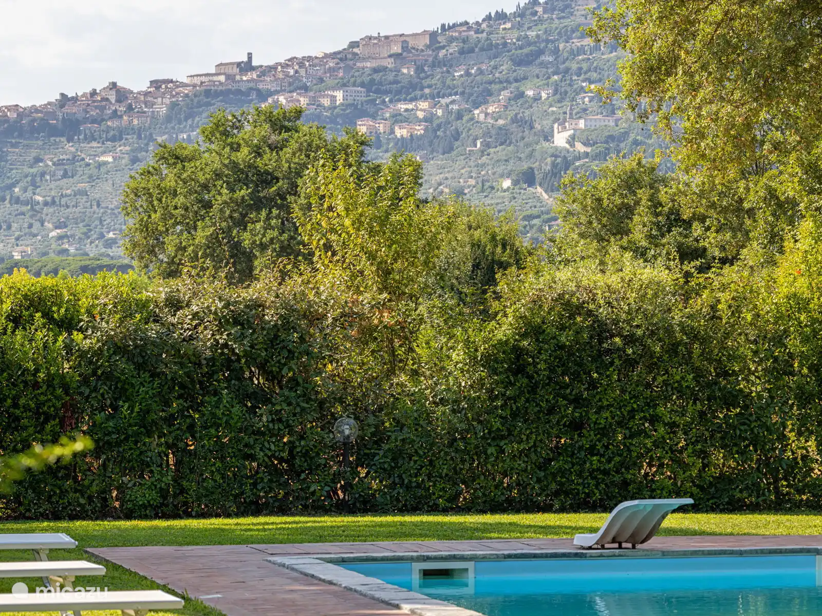Het zwembad (10x5 meter, minimaal 1.230 tot 1,80 meter) is compleet met ligstoelen en overdag goed blootgesteld aan de zon en geniet van een prachtig uitzicht op Cortona. Voor de keuken staat een pergola waar je een grote tafel kunt vinden om buiten te eten. Op het terrein heb je ook ruimte om je auto te parkeren.