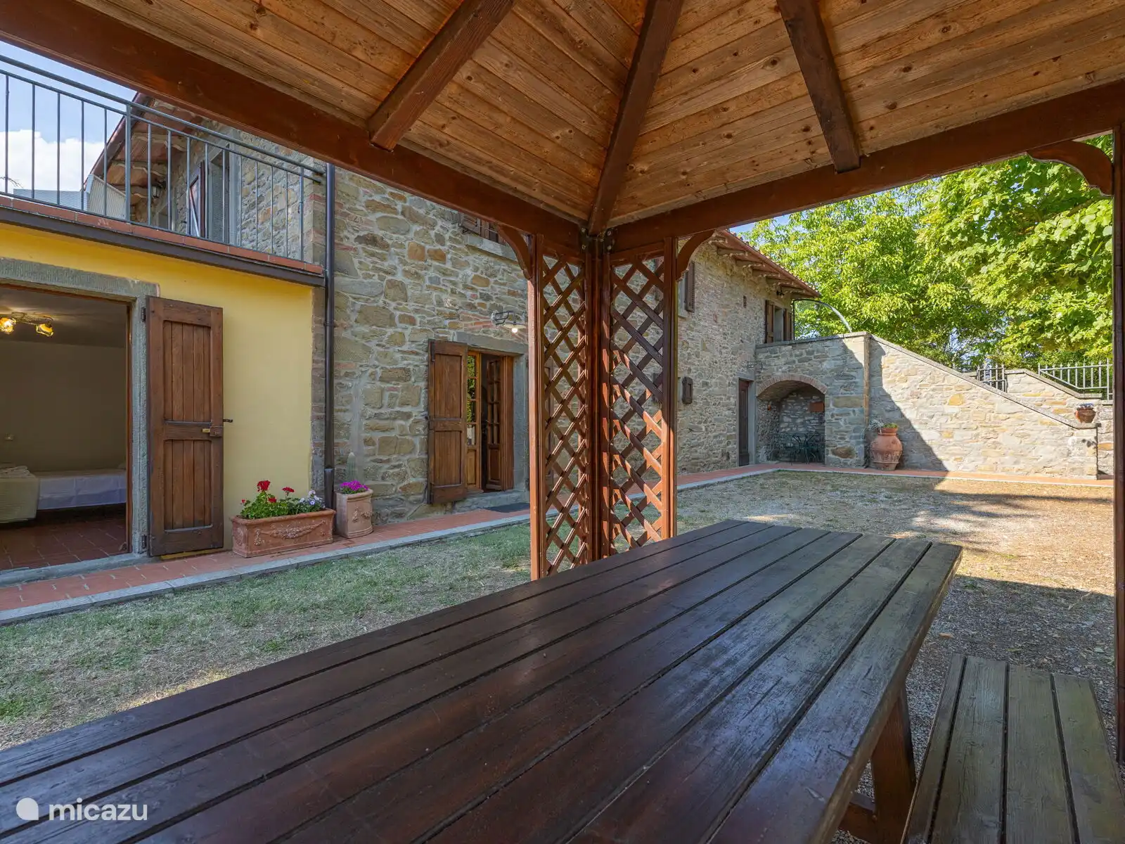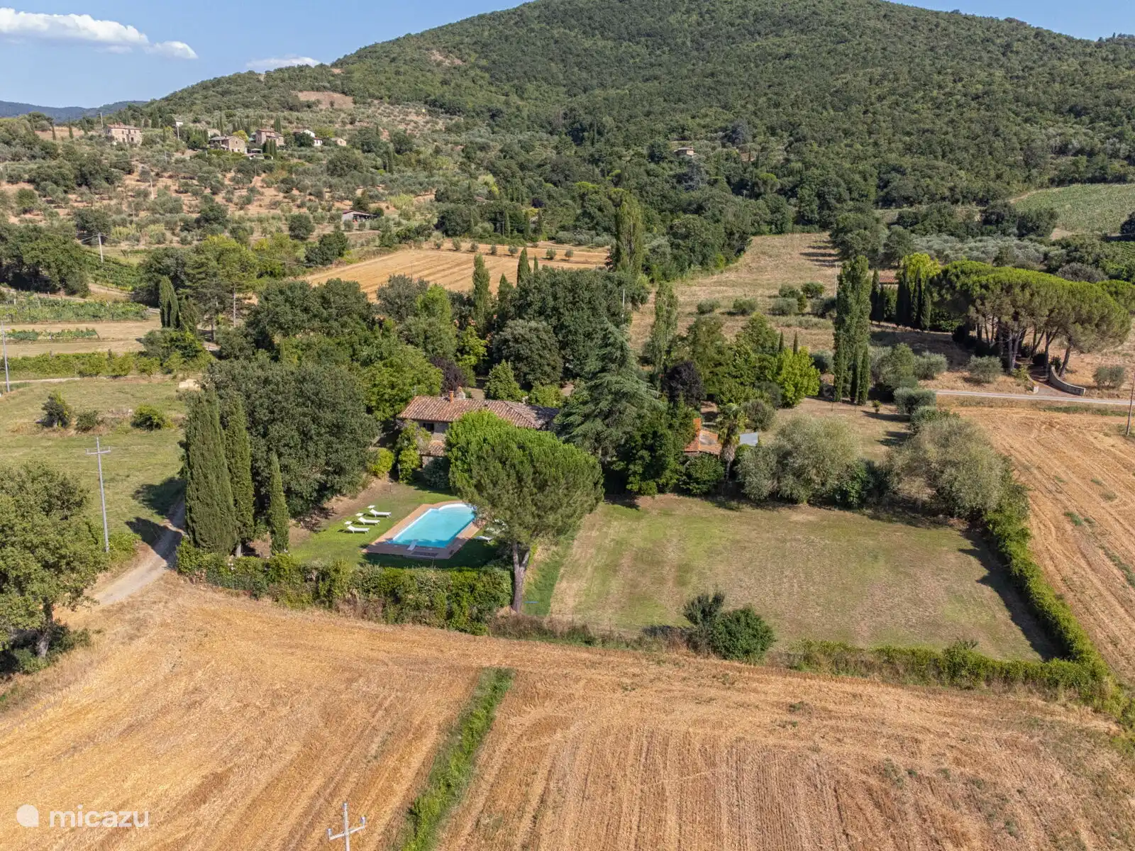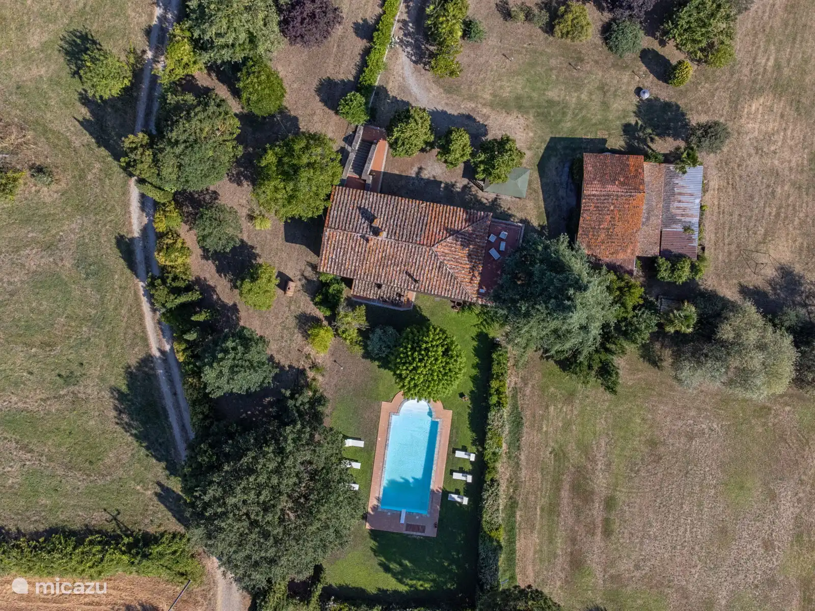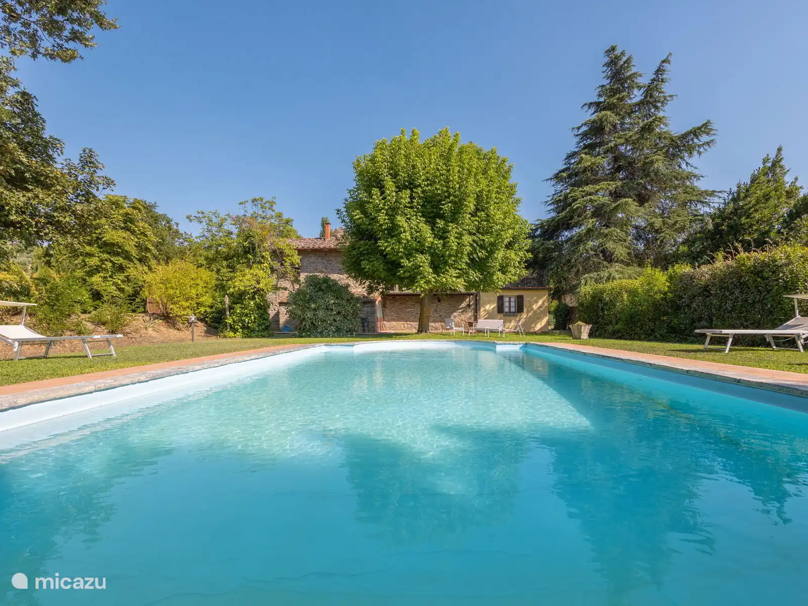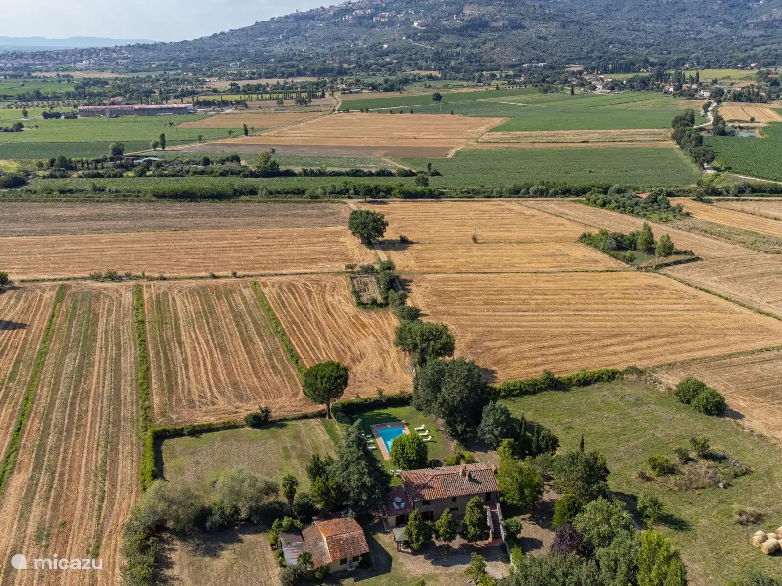 Het zwembad (10x5 meter, minimaal 1.230 tot 1,80 meter) is compleet met ligstoelen en overdag goed blootgesteld aan de zon en geniet van een prachtig uitzicht op Cortona. Voor de keuken staat een pergola waar je een grote tafel kunt vinden om buiten te eten. Op het terrein heb je ook ruimte om je auto te parkeren.