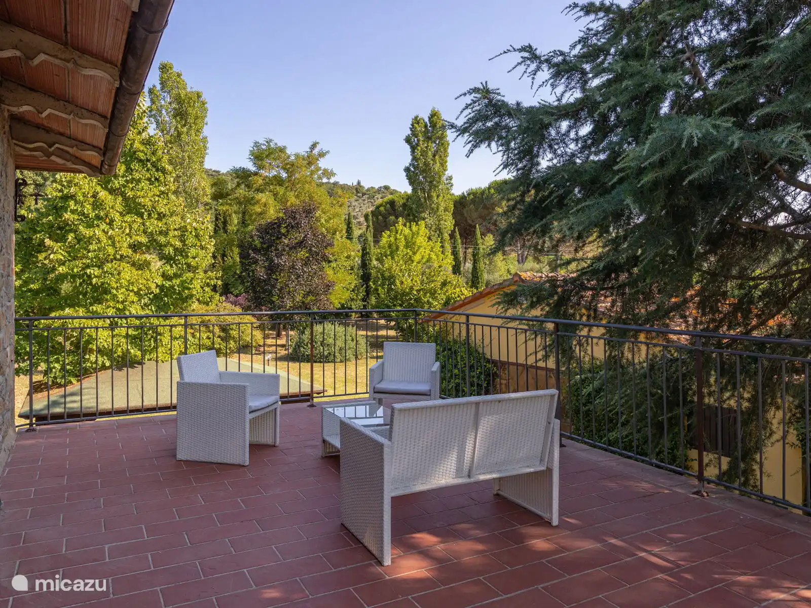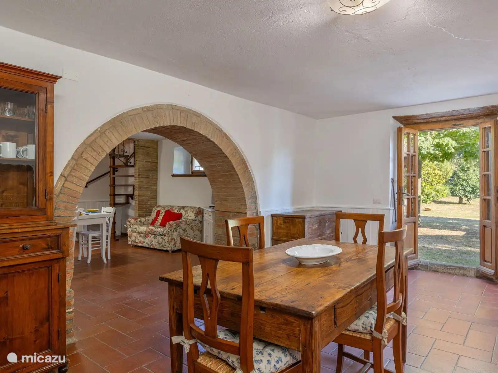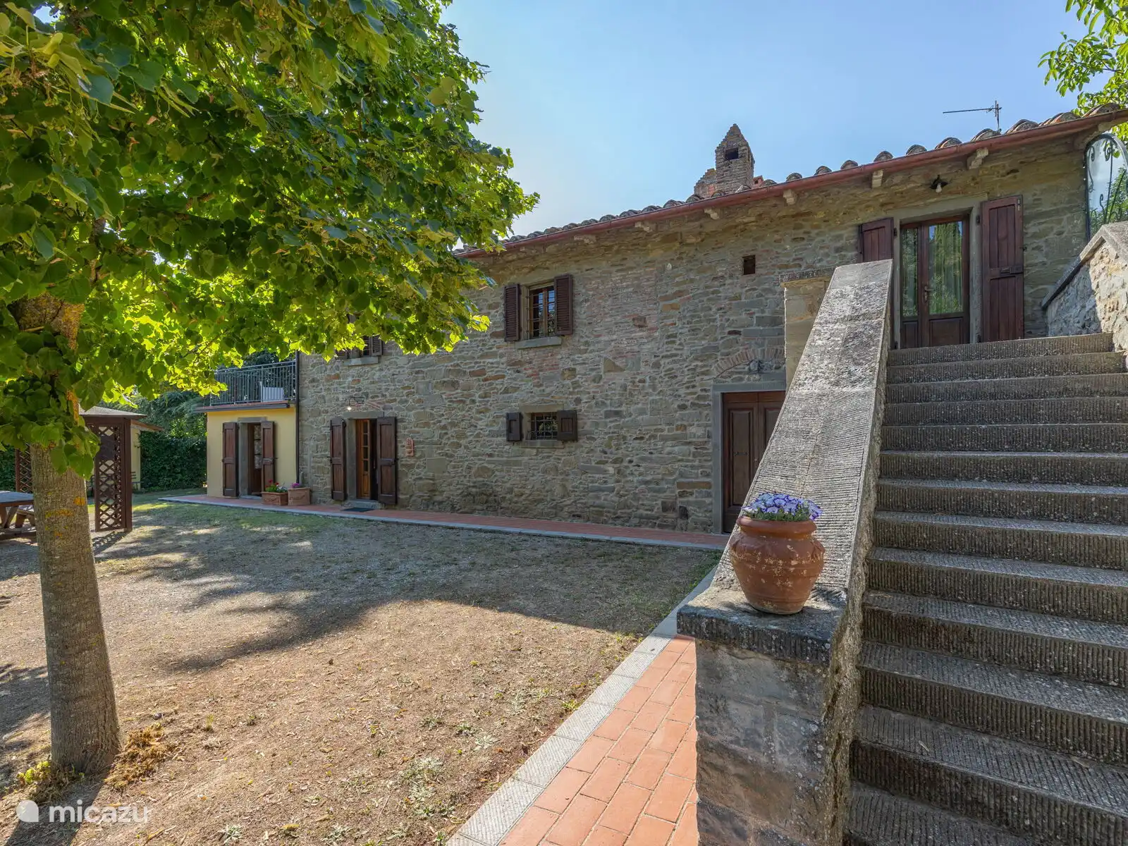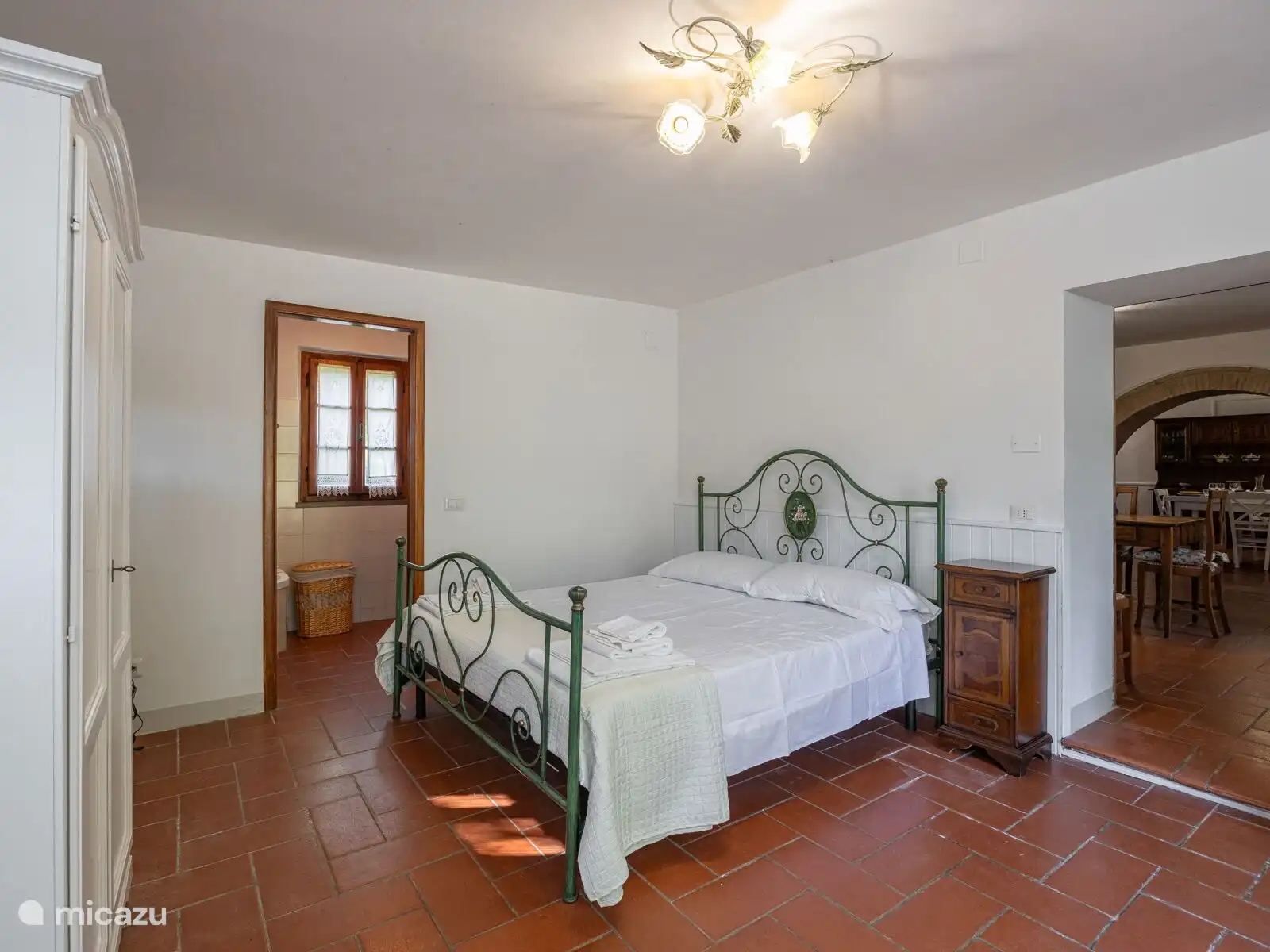 Het zwembad (10x5 meter, minimaal 1.230 tot 1,80 meter) is compleet met ligstoelen en overdag goed blootgesteld aan de zon en geniet van een prachtig uitzicht op Cortona. Voor de keuken staat een pergola waar je een grote tafel kunt vinden om buiten te eten. Op het terrein heb je ook ruimte om je auto te parkeren.
