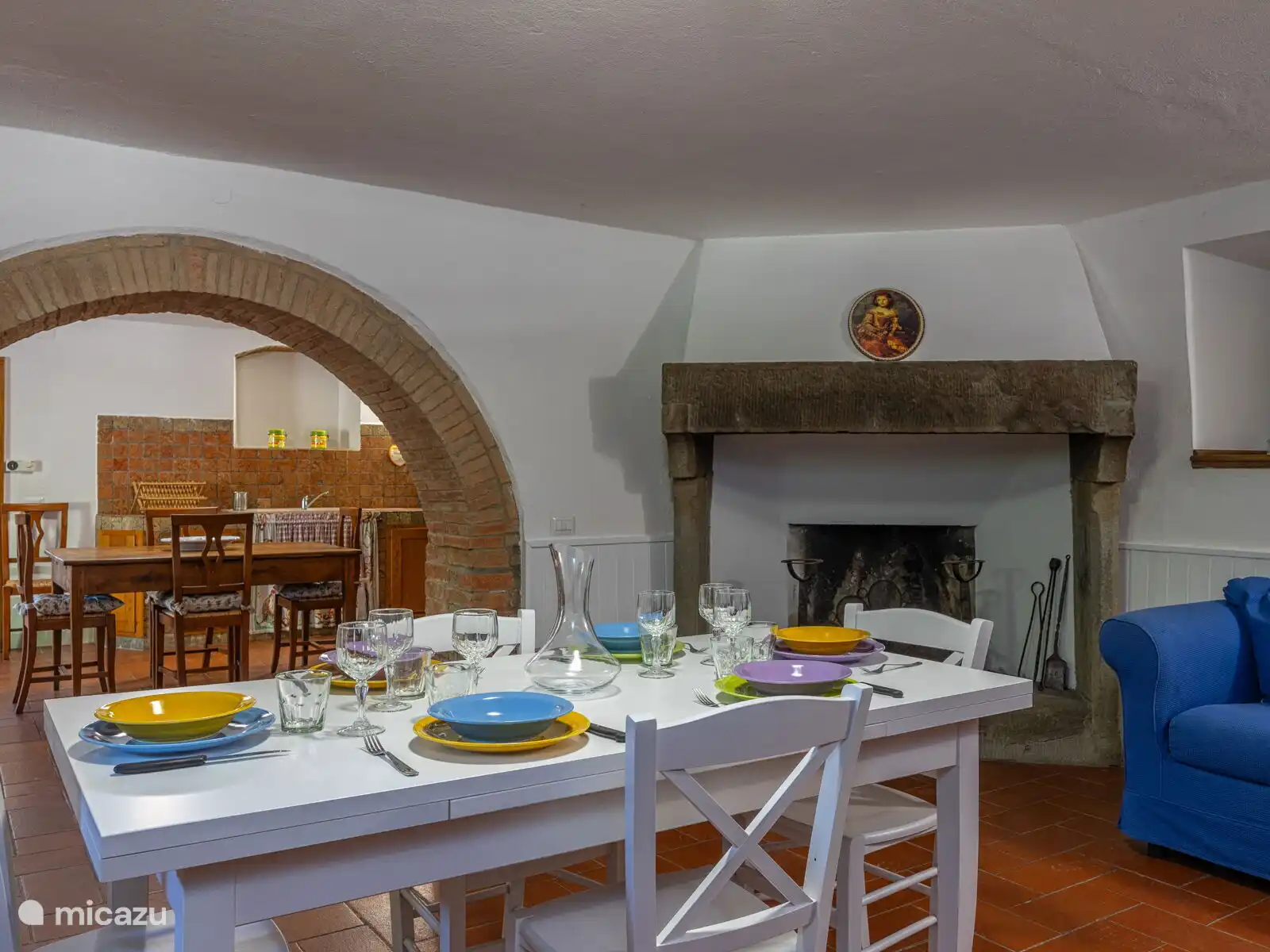 • woonkamer met bank, open haard en kitchenette
