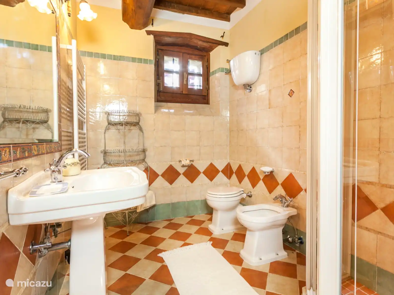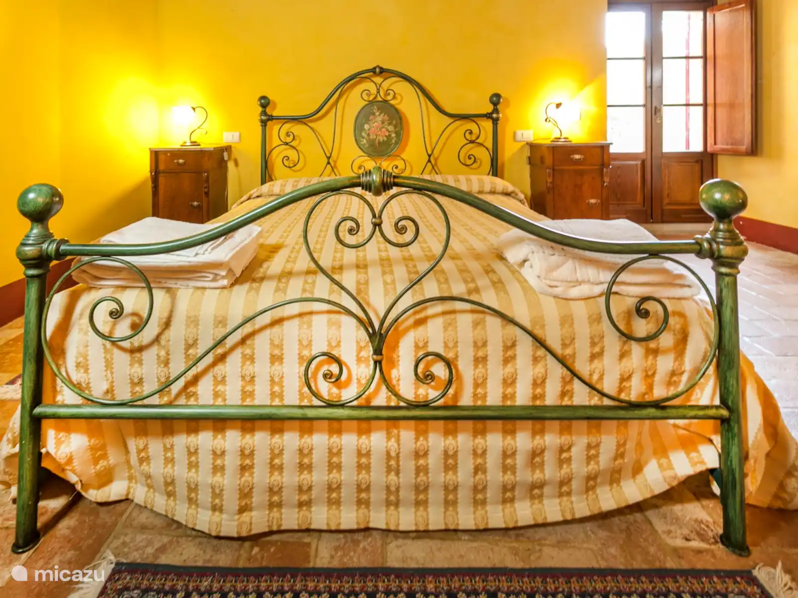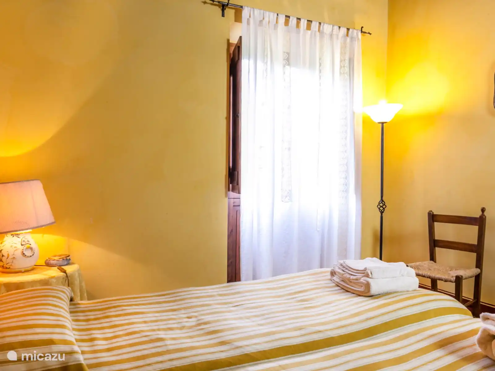 Vanuit de woonkamer bereikt u via een prachtige houten trap de bovenste dubbelkamer, de grootste en mooiste van het huis, die ook een kleine zitkamer/studeerkamer en een eenpersoonsbed heeft, en de beneden-tweepersoonskamer op de begane grond, eveneens gekenmerkt door een directe uitgang naar de tuin op de begane grond met een badkamer. De villa wordt voorzien van airconditioning tegen betaling (meterverbruik).
