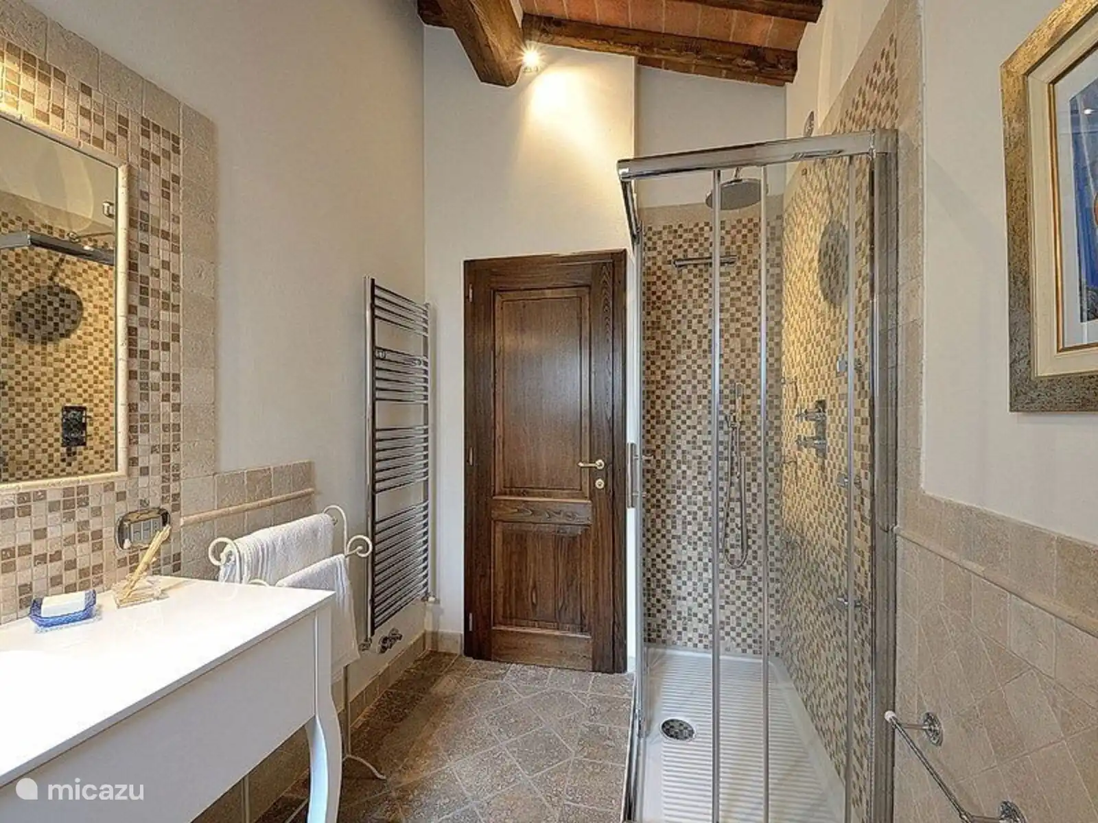 Vanuit de keuken leidt een prachtige stenen trap naar de derde tweepersoonskamer met een privébadkamer en douche. Vanuit de woonkamer leidt er echter een trap naar de kelder, waar je een studeerkamer/woonkamer met badkamer en douche vindt en een tweede kamer met een grote professionele keuken en een eettafel. Vanuit deze tweede keuken kun je ook direct de buitenkant bekijken.