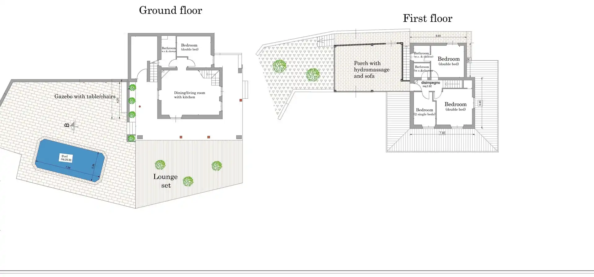 Op de eerste verdieping bevindt zich een slaapkamer met een tweepersoonsbed en een en-suite badkamer (toilet en douche), een slaapkamer met twee eenpersoonsbedden, een andere slaapkamer met een tweepersoonsbed en een gedeelde badkamer met douche en toilet. Op dezelfde verdieping is er een groot overdekt terras met panoramisch uitzicht, een bank en een jacuzzi voor 6 personen.