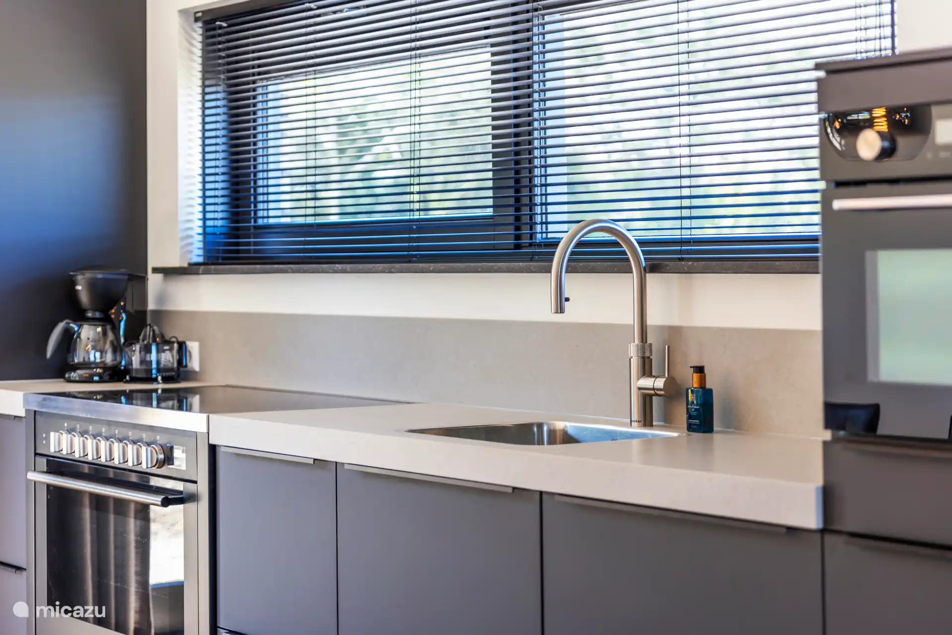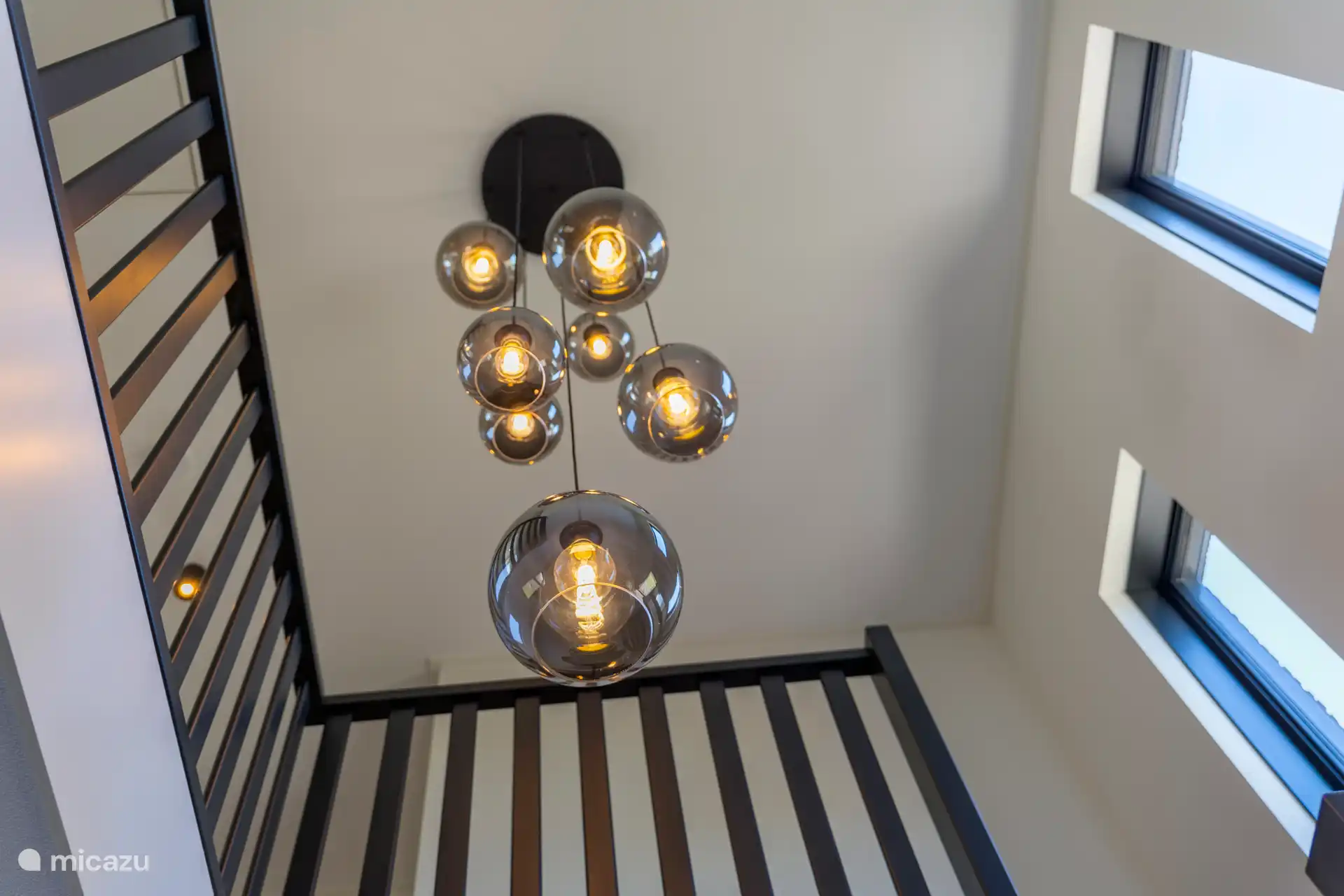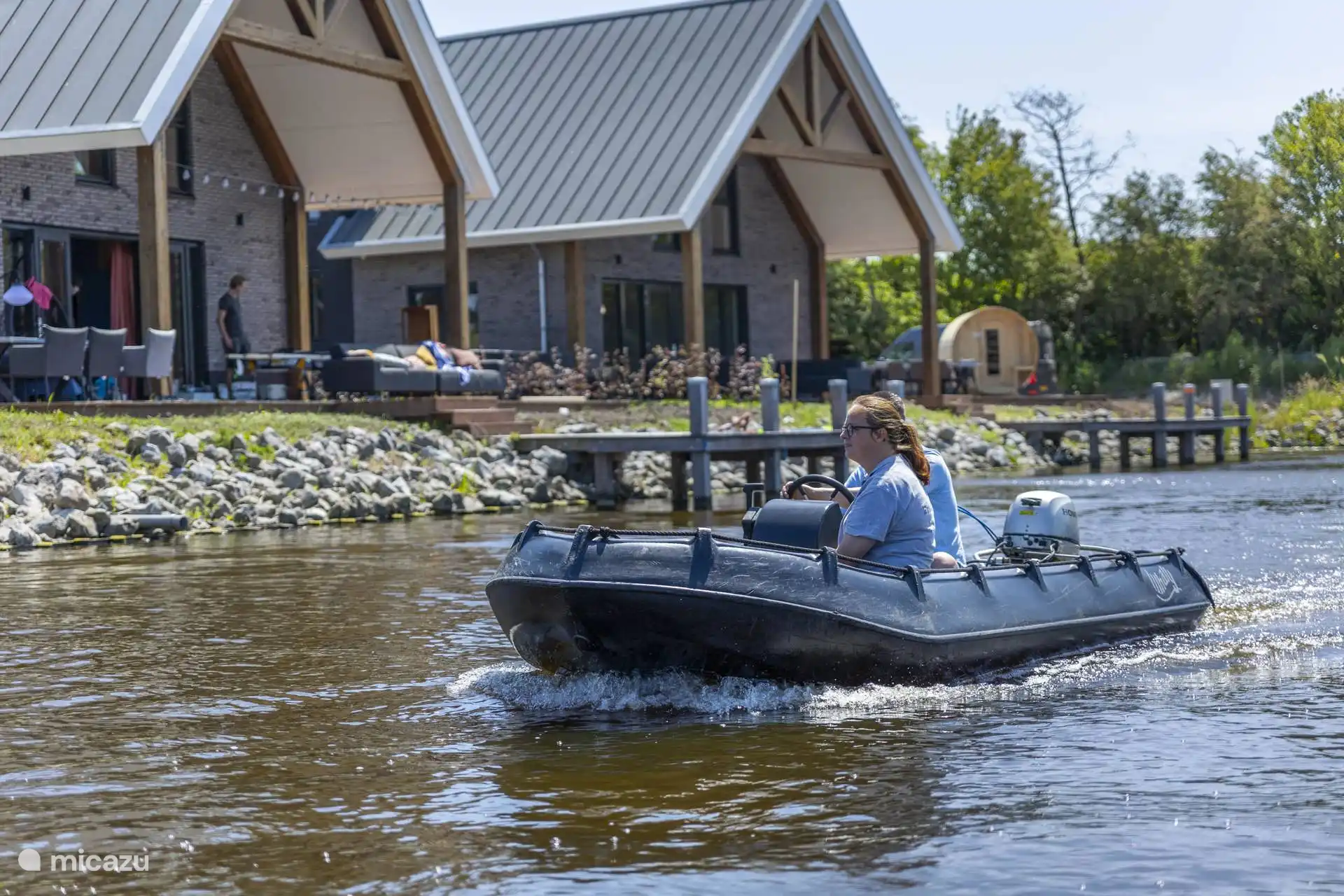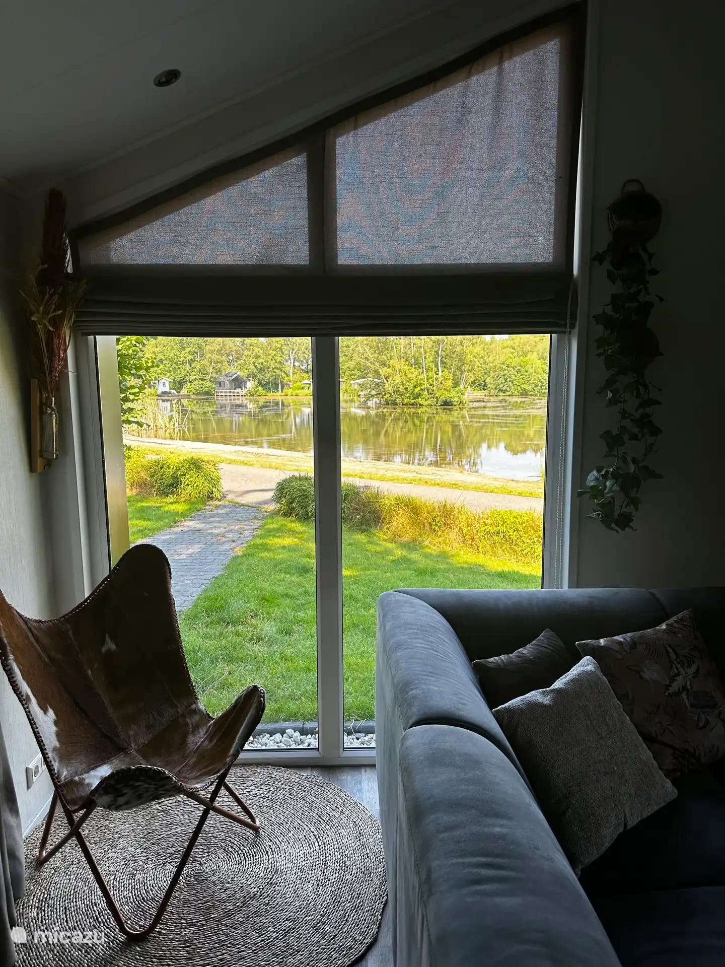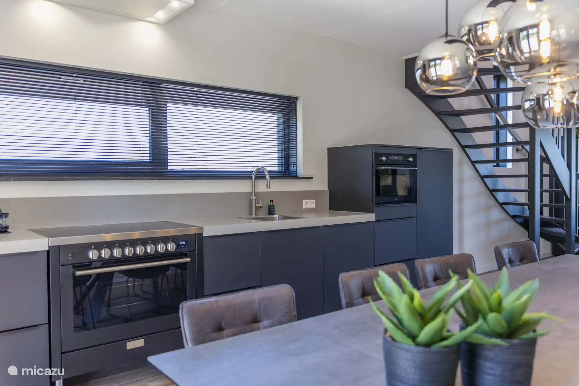 **Begane grond:** Zij-entree met meterkast (extra groepen) en toiletruimte met zwevend toilet geeft toegang tot het woongedeelte. Het U-vormige woongedeelte straalt een warme, luxe sfeer uit door de combinatie van lichte wanden, een houtlook PVC vloer en stijlvolle meubels. Vanuit de woonkamer en keuken heeft u een prachtig uitzicht op de tuin, het terras en het open water. De ruime keuken is volledig uitgerust met moderne inbouwapparatuur en een stijlvolle bar, perfect voor een ontspannen ontbijt. Het bijgebouw schuin achter de woning is voorzien van een inloopdouche en een wastafel. U kunt dit gebied gebruiken zoals u wilt; een vierde slaapkamer of een spa. De infraroodsauna is al beschikbaar. Of wil je werk en vrije tijd combineren? Dit is een uitstekend kantoor.
