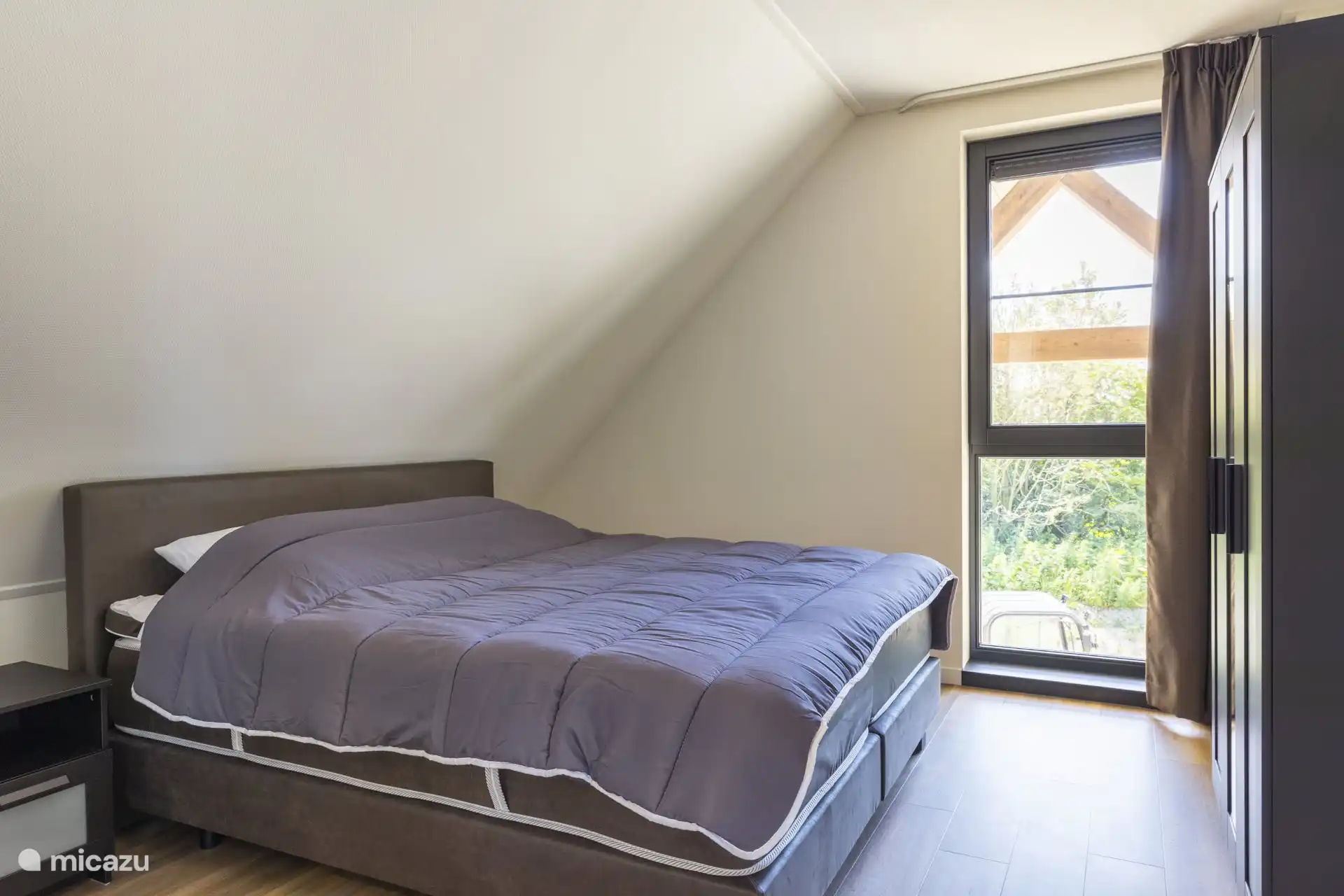 **Eerste verdieping:** Op de eerste verdieping bevinden zich drie stijlvolle slaapkamers, afgewerkt in een stijlvolle combinatie van wit en warm hout. De badkamer is gemoderniseerd en voorzien van een inloopdouche met glazen wand, ligbad, wastafel en tweede toilet.
