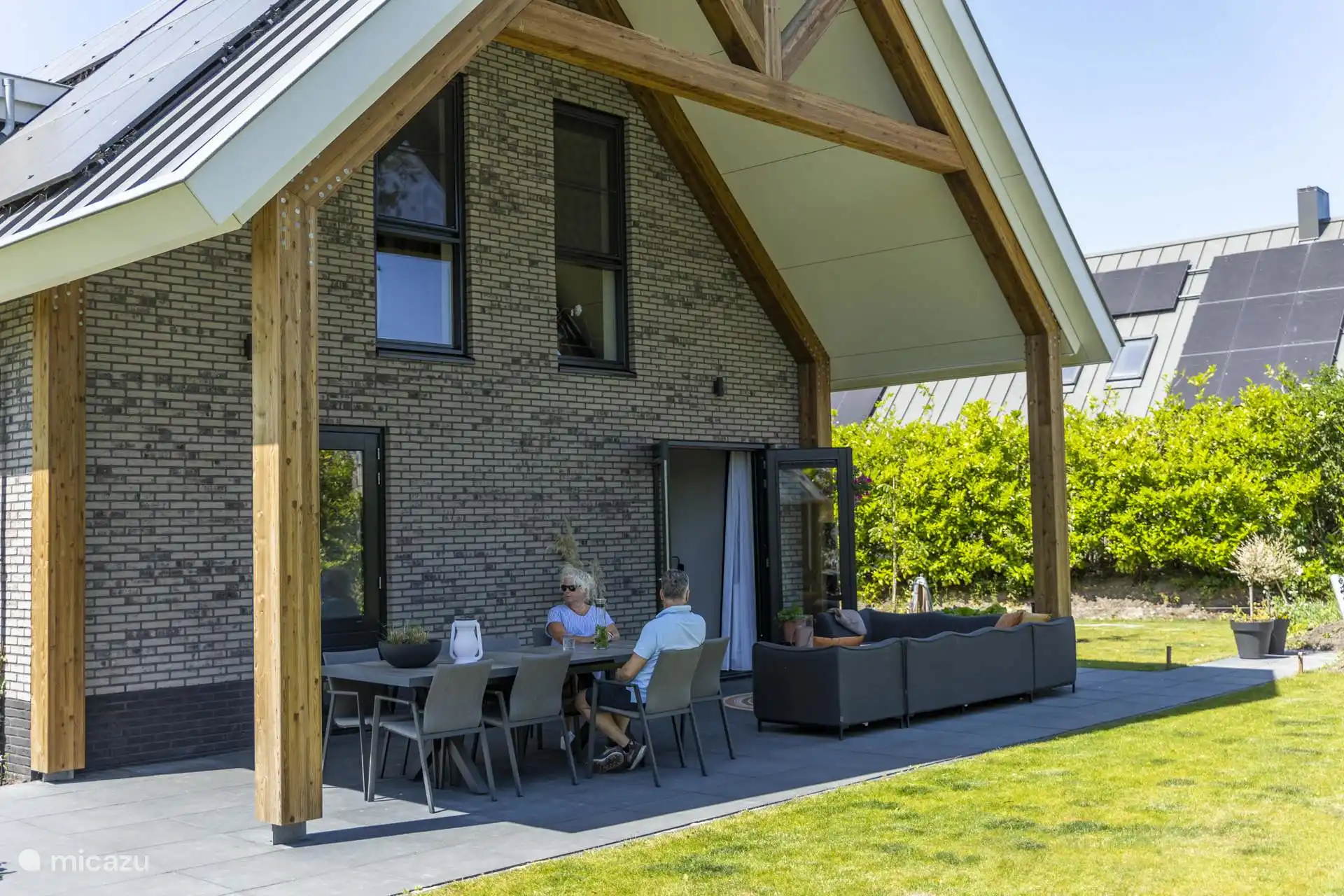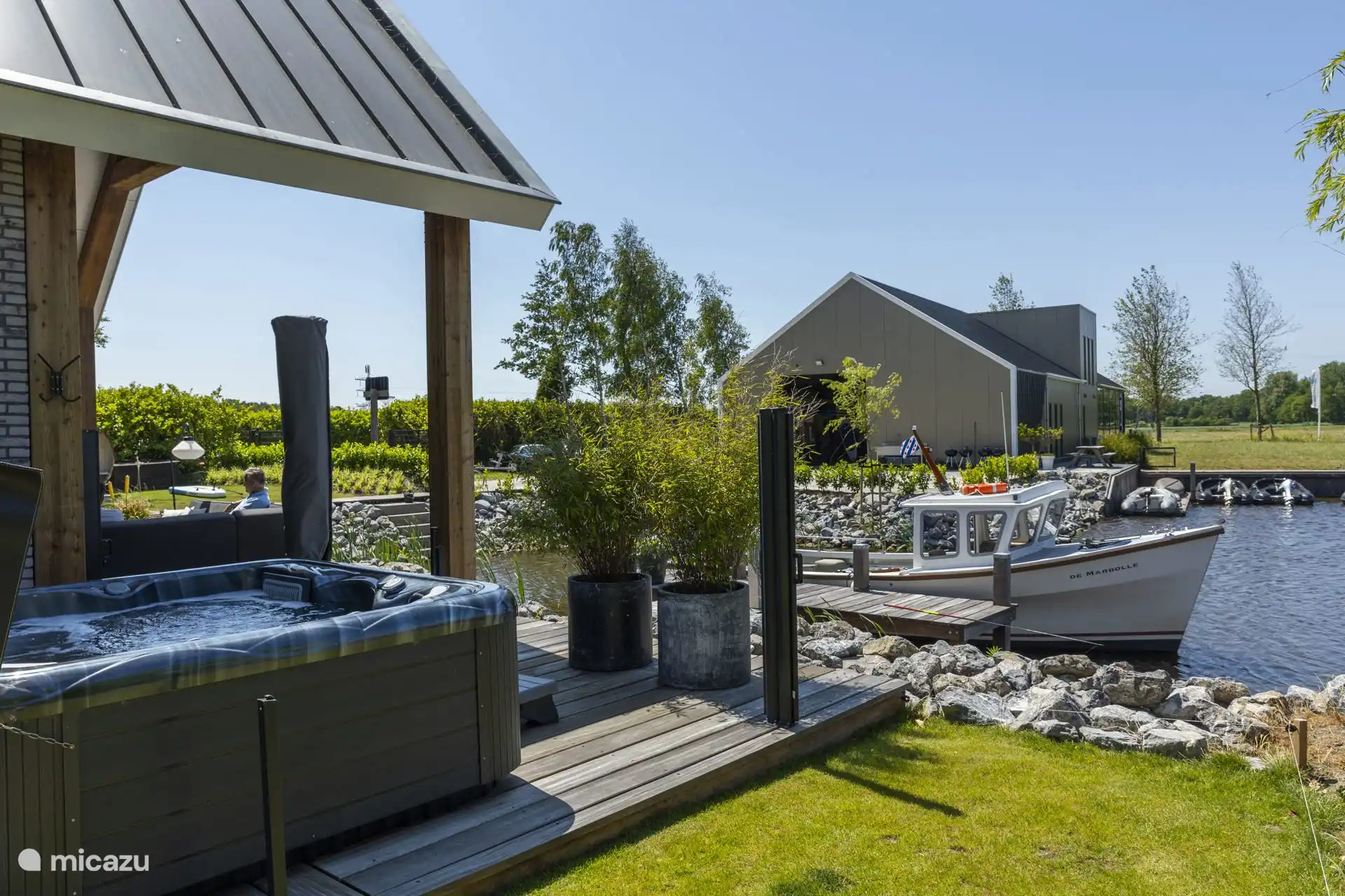 **Exterieur:** De villa is gunstig gelegen op het royale perceel van 515 m² eigen grond, waardoor er aan de oost-, zuid- en westzijde een ruim en beschut terras is ontstaan. Geniet 's ochtends van de zon aan het water of barbecue 's avonds terwijl de zon langzaam ondergaat op het terras op het westen. Of direct in de zon in de loungehoek aan de zuidkant. En als het regent, houdt de glazen luifel je droog. De tuin is voorzien van een hardhouten steiger. De boot brengt u direct het IJsselmeer op.