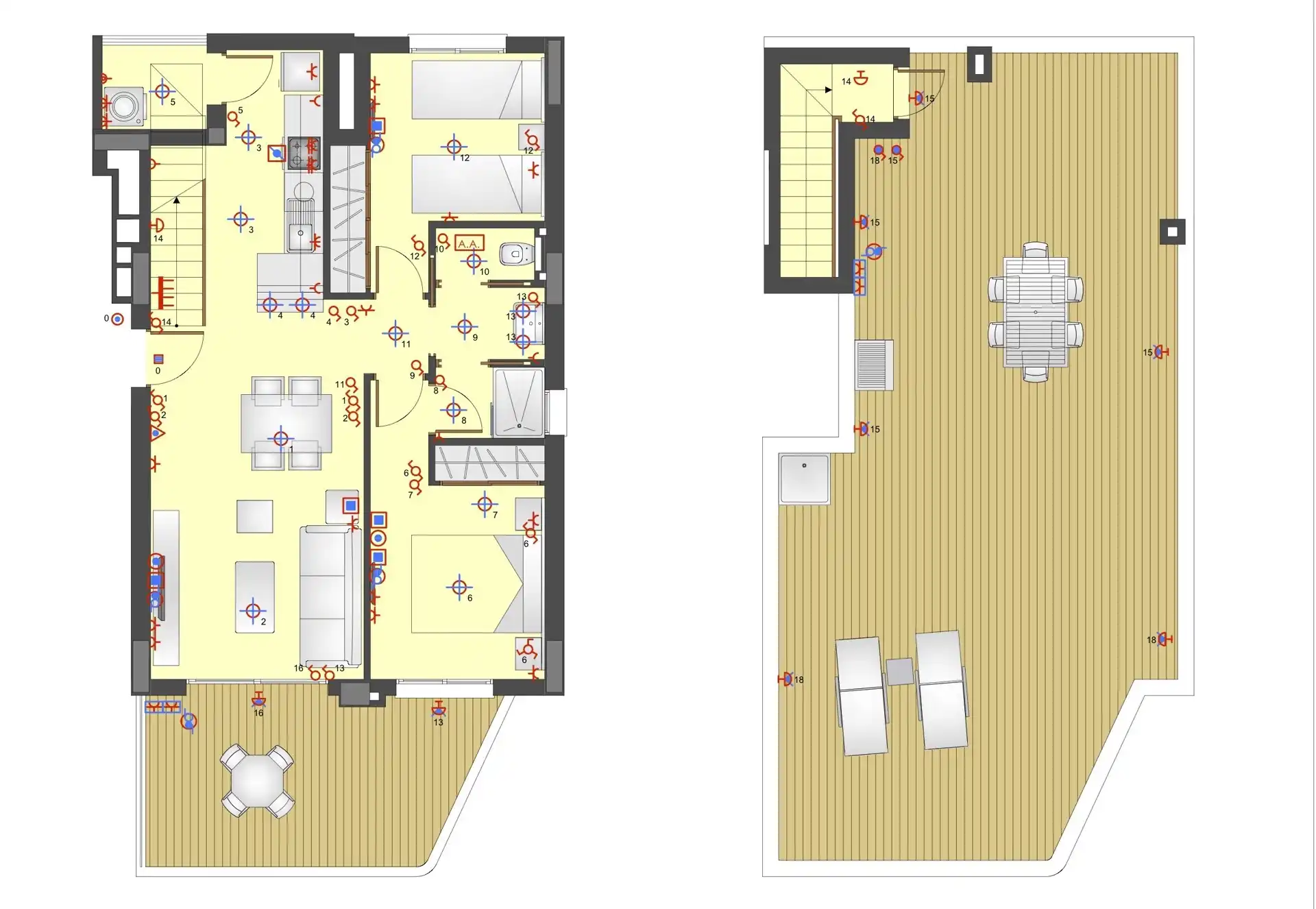 Het penthouse (op de vijfde verdieping) ligt op 350 m van de boulevard, is licht en ruim (75m2) met 2 slaapkamers en 1 badkamer met apart toilet en ruim balkon met (schuifbare) glasgordijnen. Het ligt op het zuiden waardoor de zon in de winter vanaf 9.00 uur naar binnen schijnt en het balkon door de glasgordijnen lekker warm is. In de zomer schijnt de zon niet naar binnen waardoor het lekker koel blijft. Het privé dakterras (6e verdieping) met tuinameublement is 70m2 groot. Vanaf daar heeft u een schitterend uitzicht over het werelderfgoed Clot de Galvany.