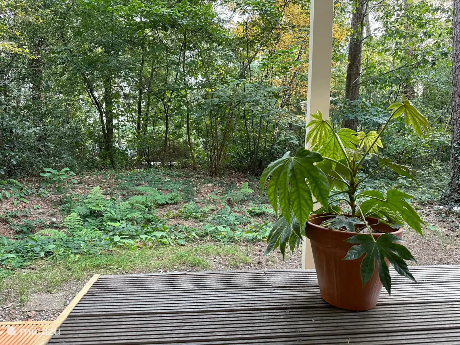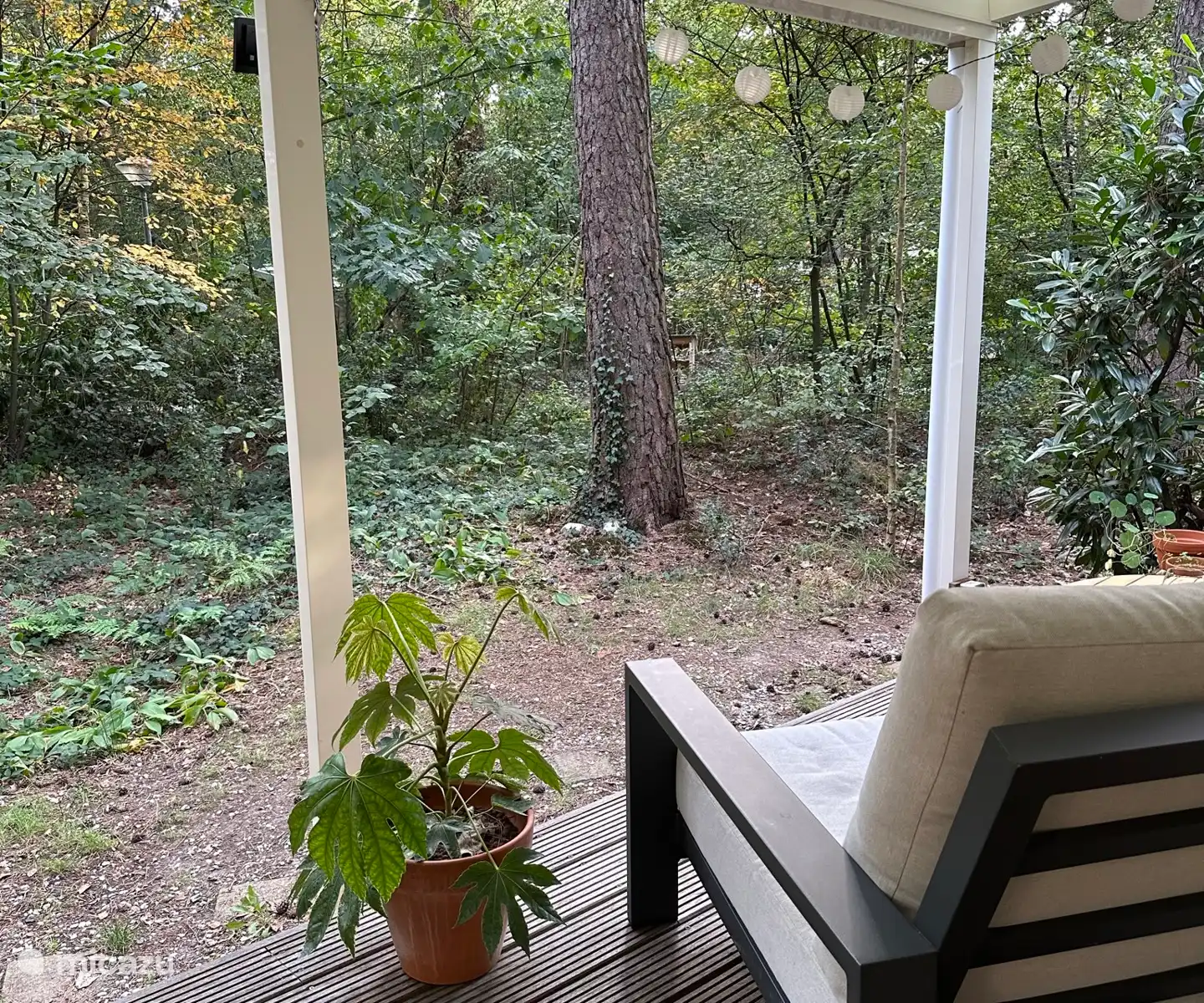 Binnen is het heerlijk vertoeven. De sfeervolle woonkamer heeft een fijne bank waar je lekker kunt lezen of tv kijken. Op de veranda vind je 2 comfortabele loungestoelen voor een ontspannen middag. Dankzij het overdekte terras zit je ook buiten altijd droog en dichtbij de natuur. Tussen de bomen vind je ook een lekker plekje om te relaxen in de hangmat. Er zijn altijd wel vogels te zien in de bostuin en de eekhoorntjes komen ook regelmatig langs.