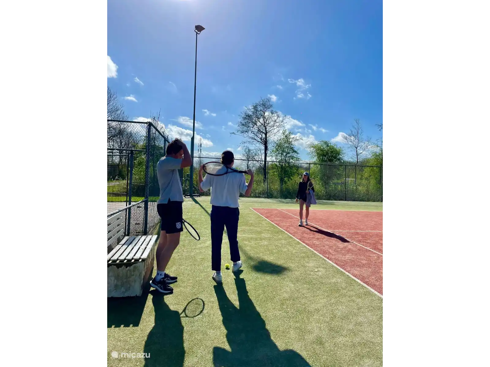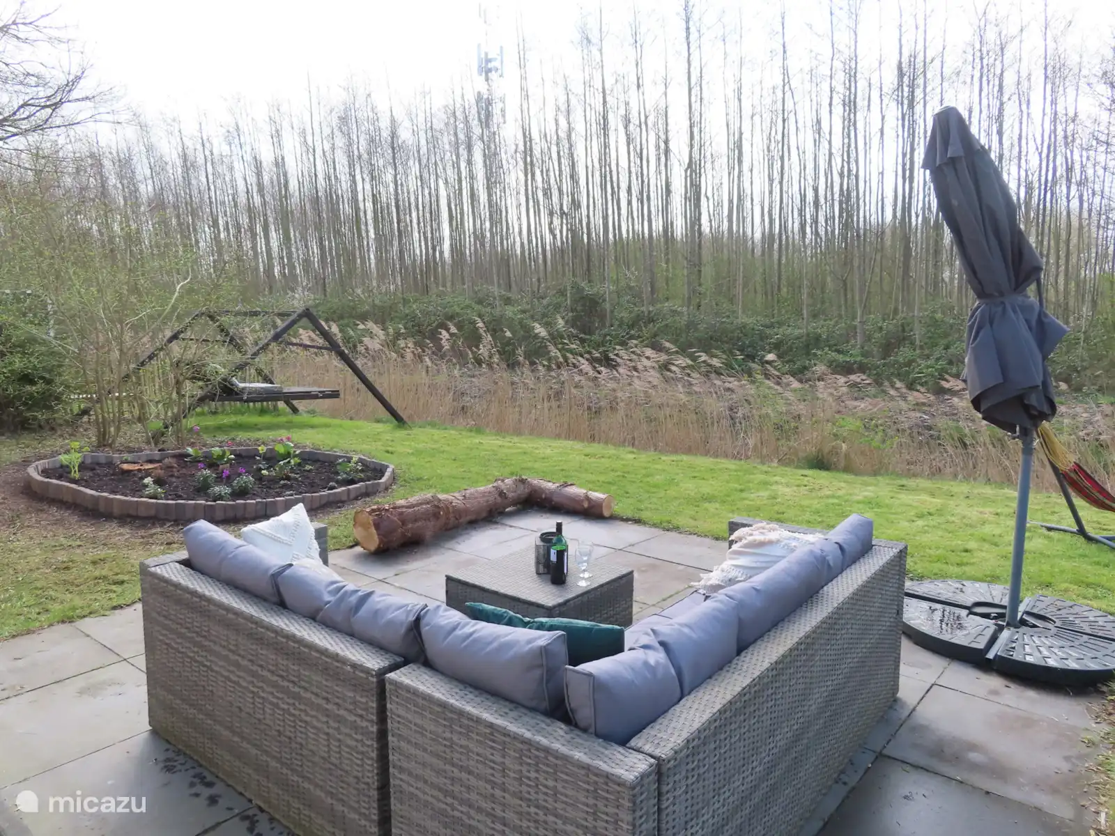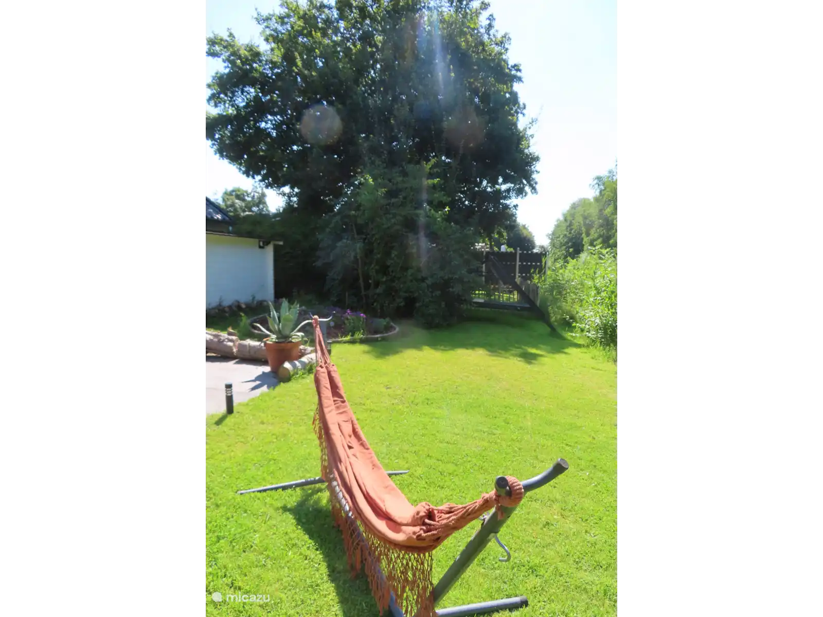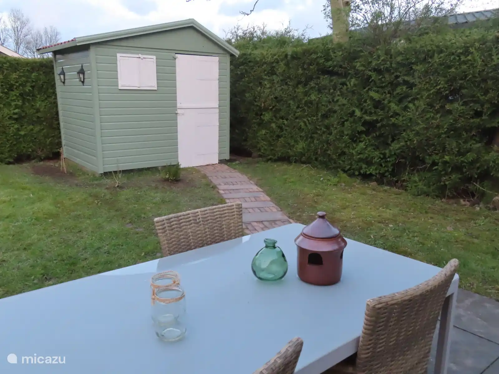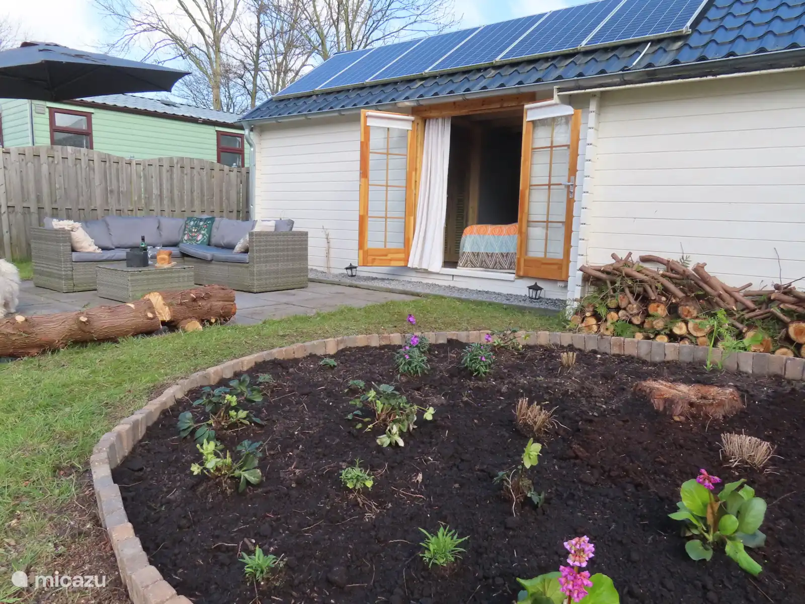 Om het huisje ligt rondom een ruime tuin, welke met heggen en een hekje zijn omheind. Er zijn 2 gratis parkeerplaatsen. En bij de receptie staan 2 laadpalen. Het zwembad, speeltuin en tennisbanen kunnen gratis worden gebruikt.
