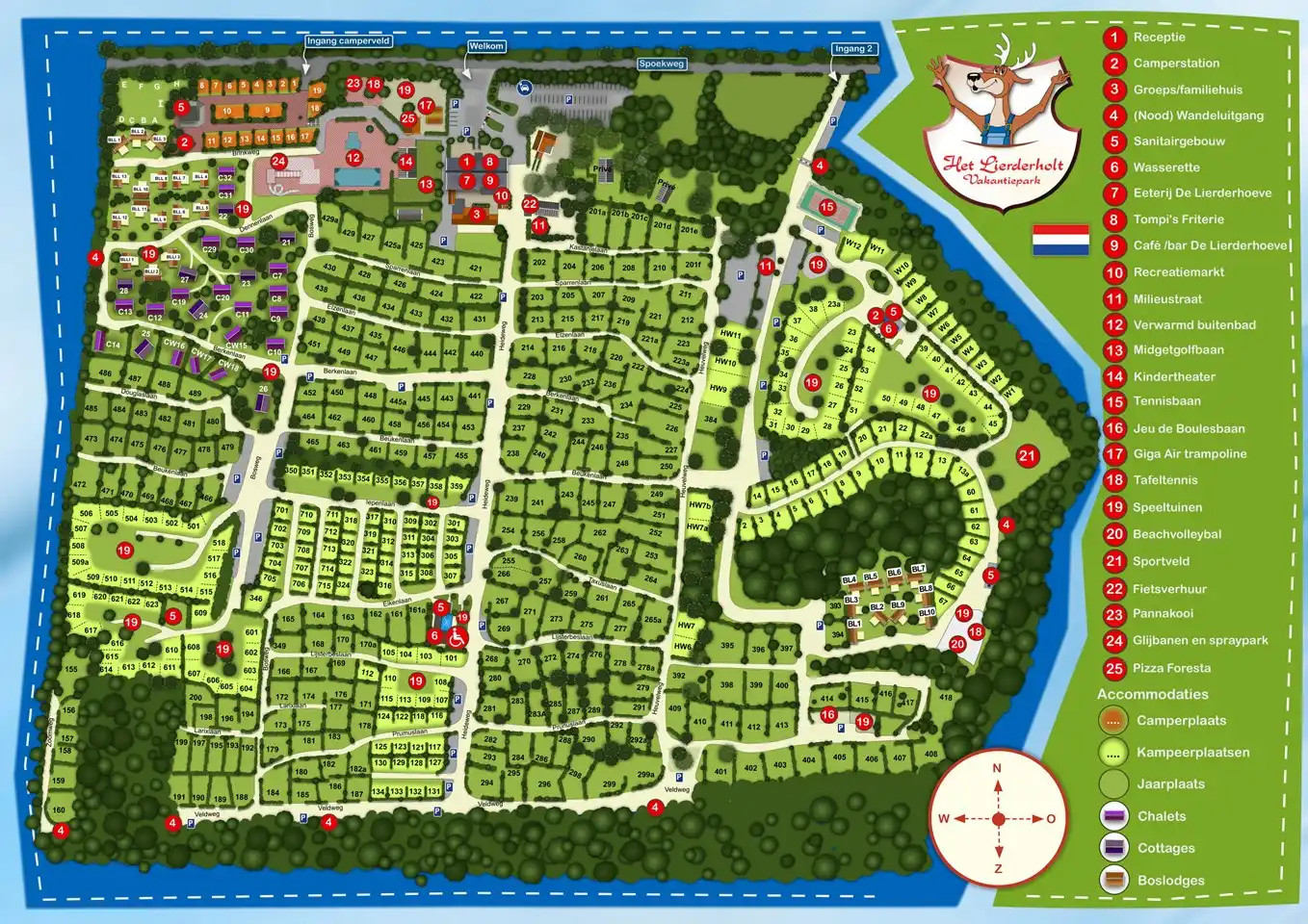 Vakantiepark Het Lierderholt biedt diverse voorzieningen zoals: Receptie, restaurant met gezellig buitenterras, bar, eetcafé/snackbar, pizzeria, winkeltje, wasserette, fietsverhuur, grote speeltuin met springkussen, panna veld, tafeltennistafels, treintje, kindertheater, voetbalveld, tennisbaan en zwembad. Het verwarmde kinderzwembad zit vol waterpret met een leuke glijbaan, waterspuiten en fonteintjes. Voor de groteren is er een zwembad met een boomdouche, waar je je lekker kan uitleven. Voor nog meer uitdaging beklim je de glijbaantoren waar je maar liefst kan kiezen uit 3 glijbanen. Van een familie glijbaan tot een gave glijbaan van wel 80 meter lang en de fantastische Crazy Cone van 70 meter, waar je uiteindelijk heen en weer wordt geslingerd in een trechter. Vergeet ook niet af te koelen in het spraypark van 200m2. Het zwembad is bij goed weer geopend vanaf de meivakantie tot september. Animatie wordt in alle reguliere basisschoolvakanties (m.u.v. de krokus- en kerstvakantie), Pasen, Hemelvaart en Pinksteren verzorgd door een enthousiast team.