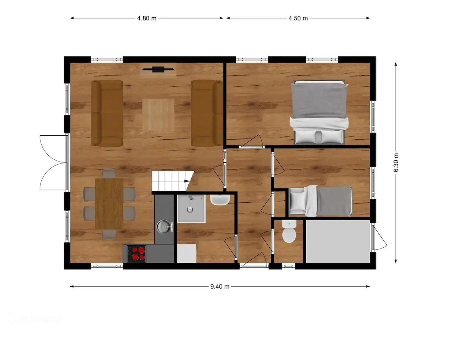 De woning is in 2021 volledig gemoderniseerd en heeft een tuin van bijna 400 m2. Via de entree kom je in de woonkamer met zit- en eethoek, hoog plafond met houten balken en openslaande deuren naar het terras, gericht op het zuiden. In de zithoek bevindt zich een 43 inch TV met Netflix en Disney apps (inloggen via jouw eigen account) en een JBL bluetooth speaker. De open hoekkeuken is voorzien van een elektrische kookplaat, koel-vriescombinatie en combimagnetron (geen vaatwasser). Er is een Nespresso machine en waterkoker aanwezig. De ouderslaapkamer bevindt zich op de begane grond en heeft twee boxsprings die door middel van een ‘topping’ standaard als Kingsize zijn opgedekt (180x200 cm). Op aanvraag is dit als twee losse bedden op te dekken. Verder bevindt zich op de begane grond een eenpersoonskamer (bed 80x200 cm), badkamer met regendouche, wastafel, was- droogcombinatie, aparte toiletruimte en een inpandige berging. In de woonkamer kom je via een smalle, steile open trap op de vide met toegang tot de derde slaapkamer. In deze ruime, maar lage slaapkamer bevinden zich twee eenpersoonsbedden (80x200 cm). Op aanvraag is dit als Queensize op te dekken met een ‘topping’ (160x200 cm). Woning heeft glasvezel met wifi. In de tuin staat een speeltoestel en jeu de boules baan. In de berging staat een barbecue, buitenspeelgoed en een opblaas zwembadje. De twee mountainbikes (nieuw in 2022) kunnen gehuurd worden.