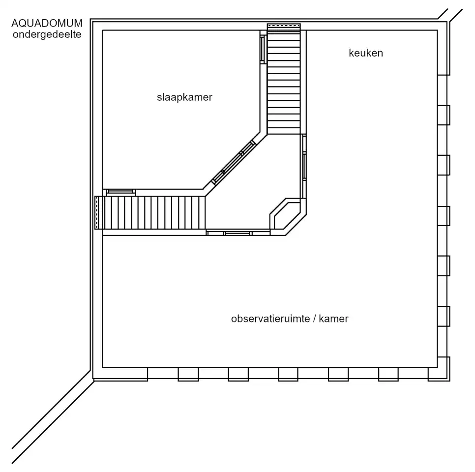 De woonkamer is gelegen op de benedenverdieping en heeft 12 grote ramen, onder de waterspiegel van de vijver. Daardoor kunt u vanuit de woonkamer het onderwaterleven bewonderen. Het huis staat op een omheind perceel van 3,5 hectare groot met een grasveld, een natuurvijver en een privé bos. Door het bos loopt een wandelpad van ruim een kilometer. Op het perceel lopen enkele damherten rond. Op de momenten dat ze zich onbespied wanen kunt u ze observeren.