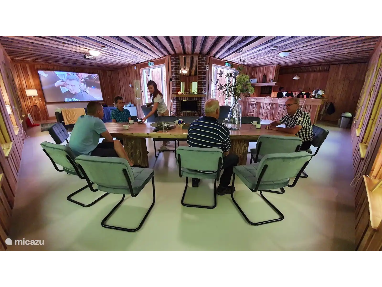 De grote L-vormige woonkamer met open keuken heeft een oppervlakte van 75m². De zithoek heeft 2 banken en een tv. Ook kun je tv kijken op en groot bioscoopscherm. Verder is er een apart zitje met een houtkachel en 2 relax-fauteuils. Een grote boomstamtafel biedt voldoende ruimte om met 12 personen gezellig bij elkaar te kunnen zitten of samen te eten. Een kinderstoel is aanwezig.