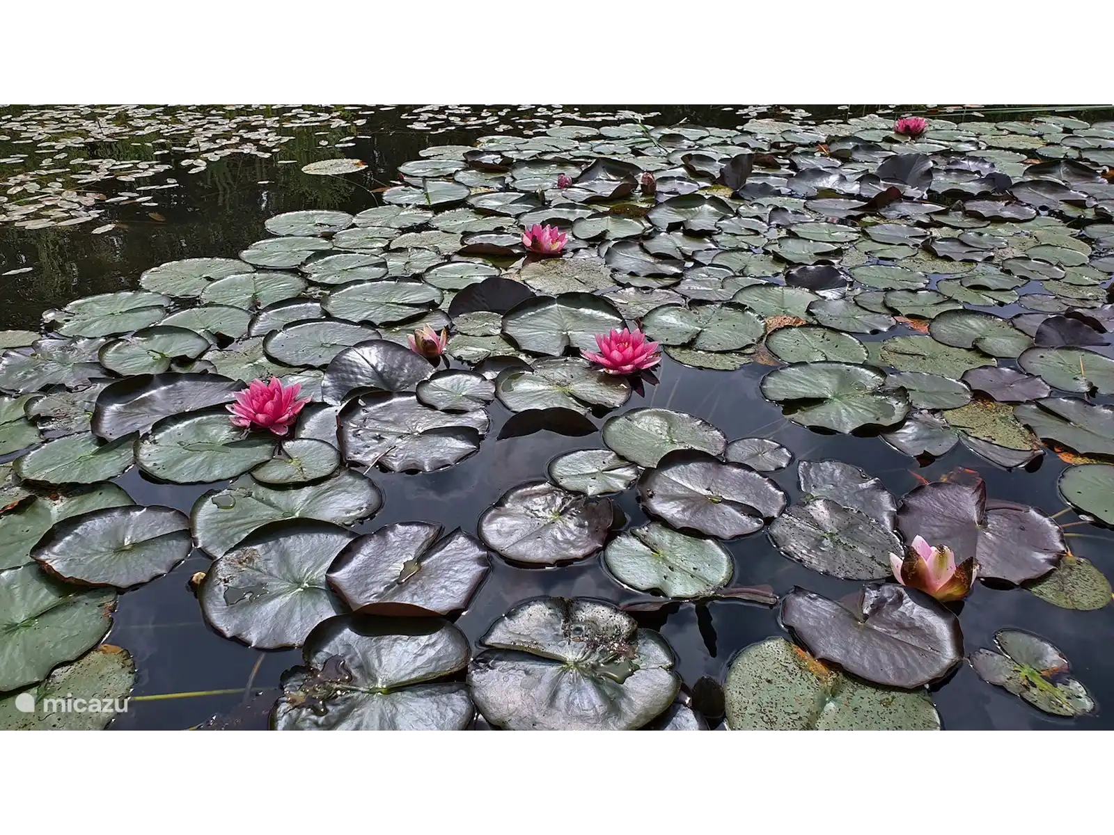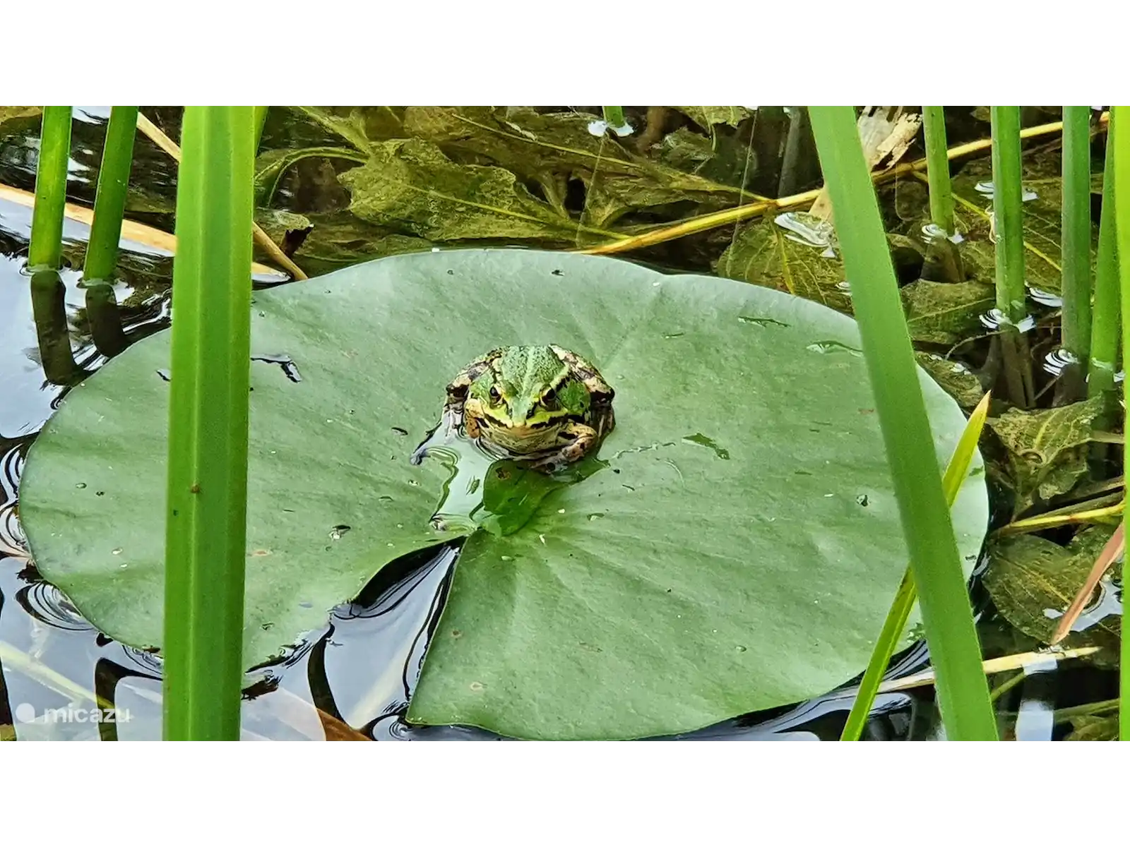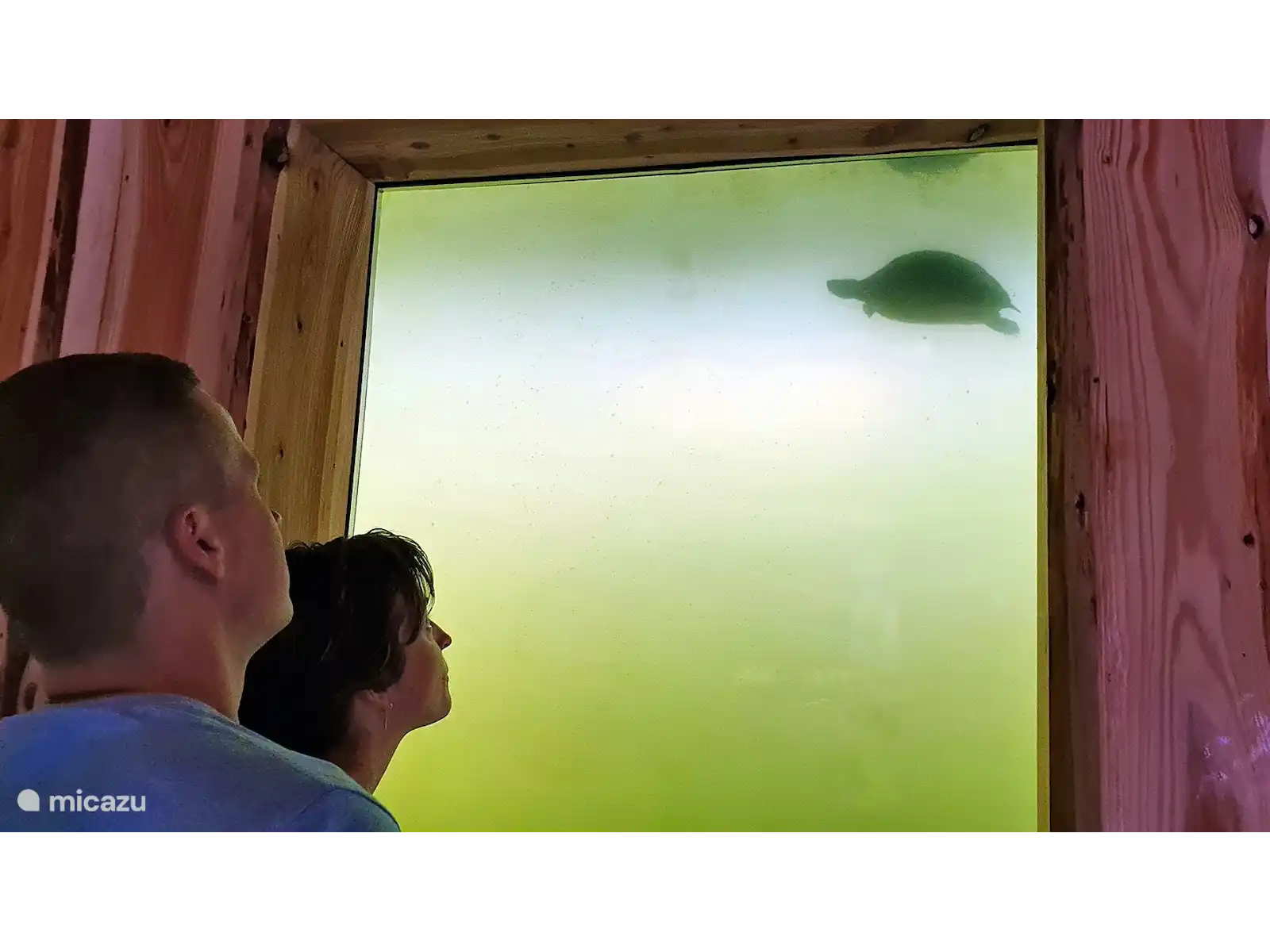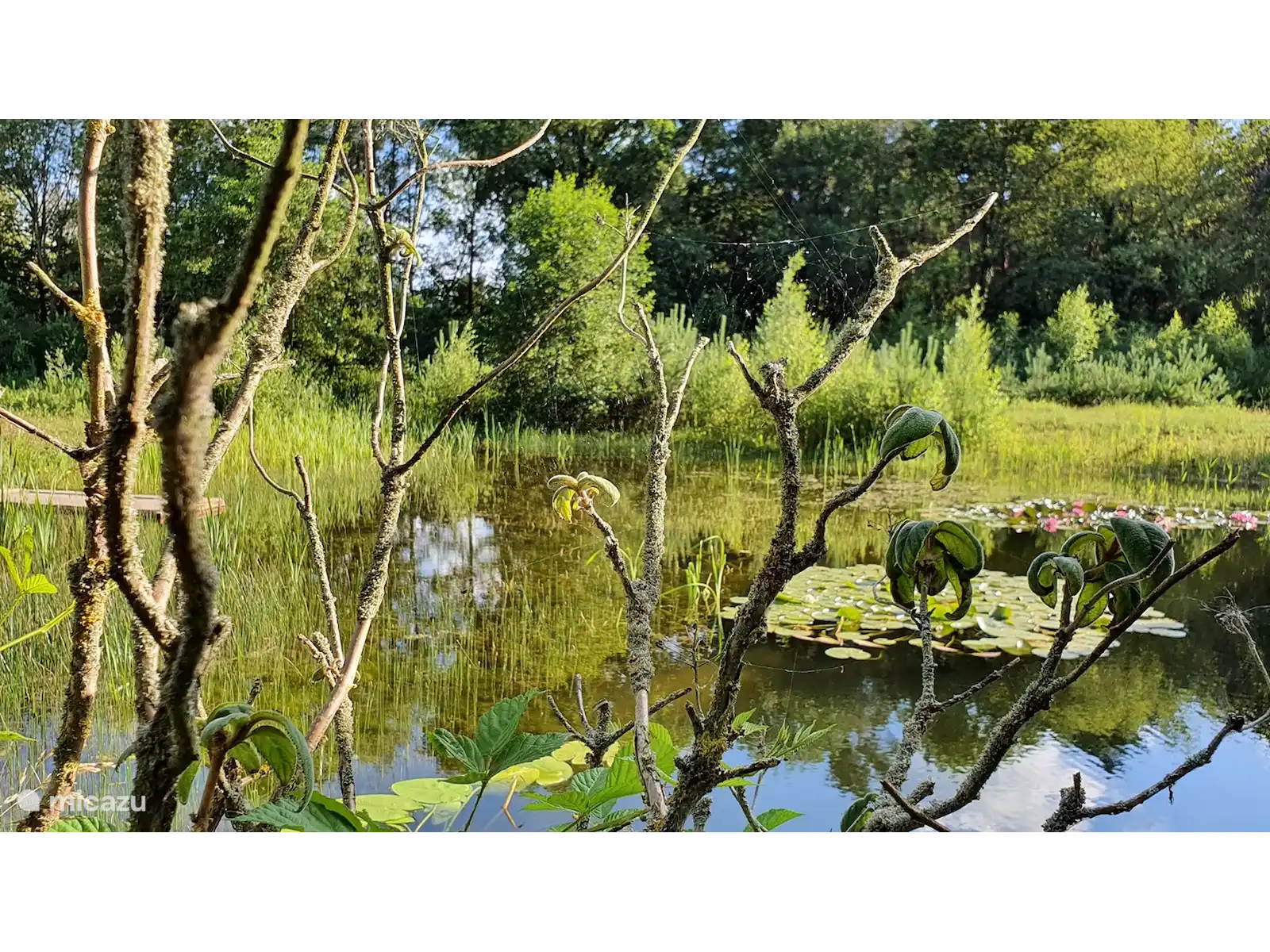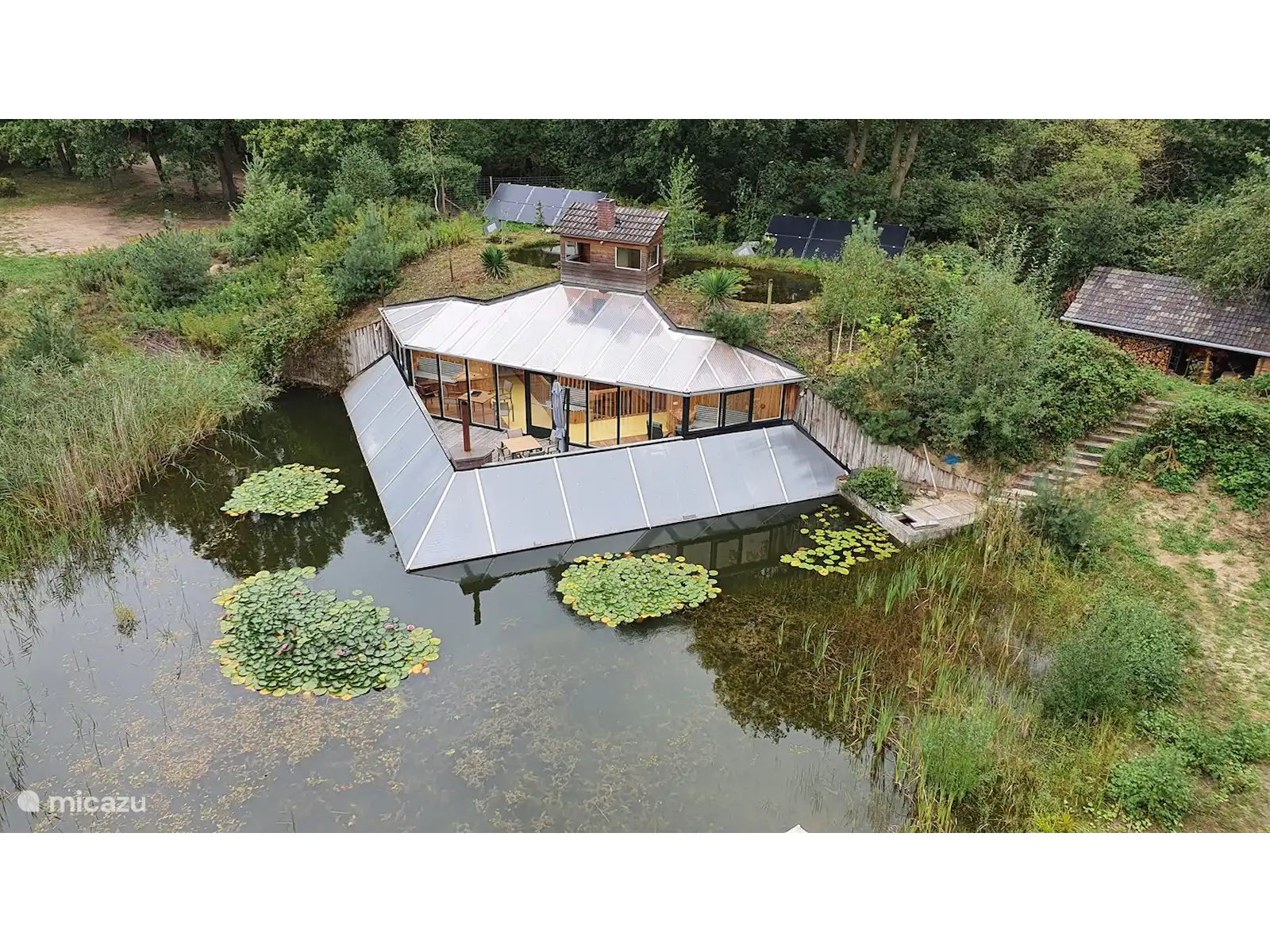 De woonkamer is gelegen op de benedenverdieping en heeft 12 grote ramen, onder de waterspiegel van de vijver. Daardoor kunt u vanuit de woonkamer het onderwaterleven bewonderen. Het huis staat op een omheind perceel van 3,5 hectare groot met een grasveld, een natuurvijver en een privé bos. Door het bos loopt een wandelpad van ruim een kilometer. Op het perceel lopen enkele damherten rond. Op de momenten dat ze zich onbespied wanen kunt u ze observeren.