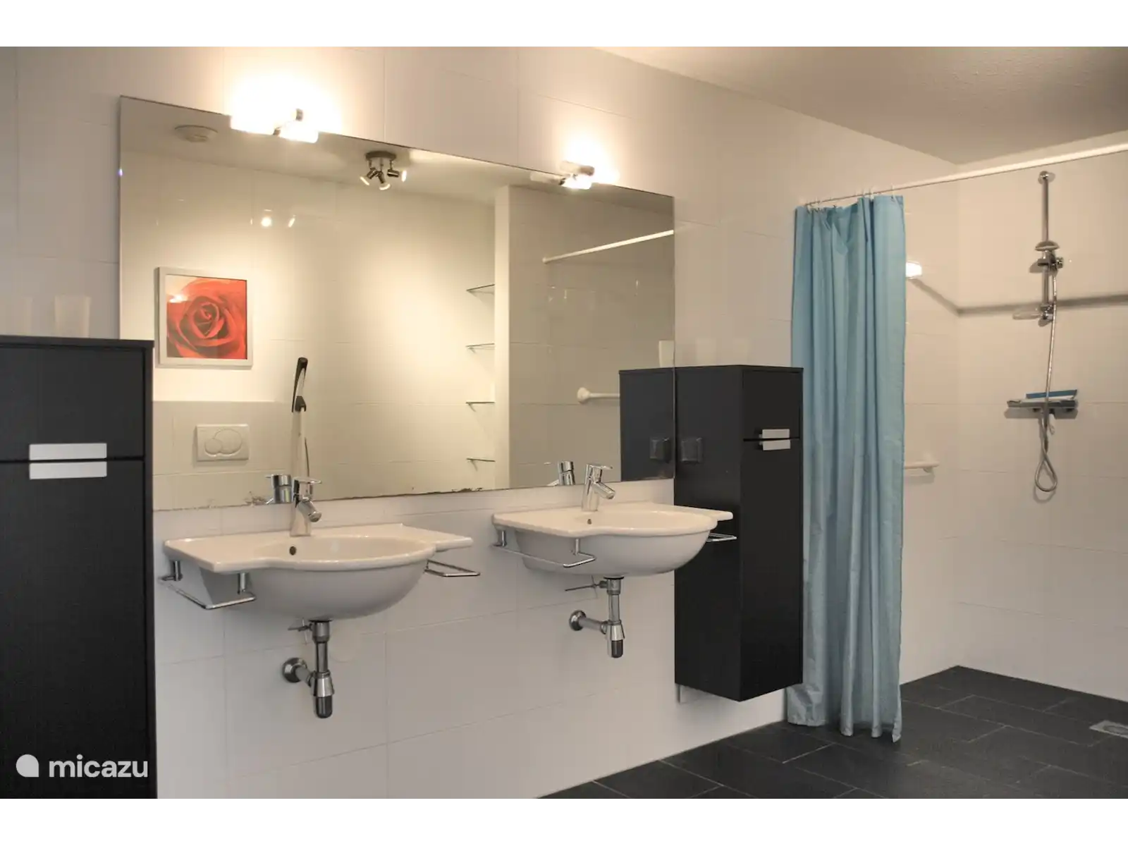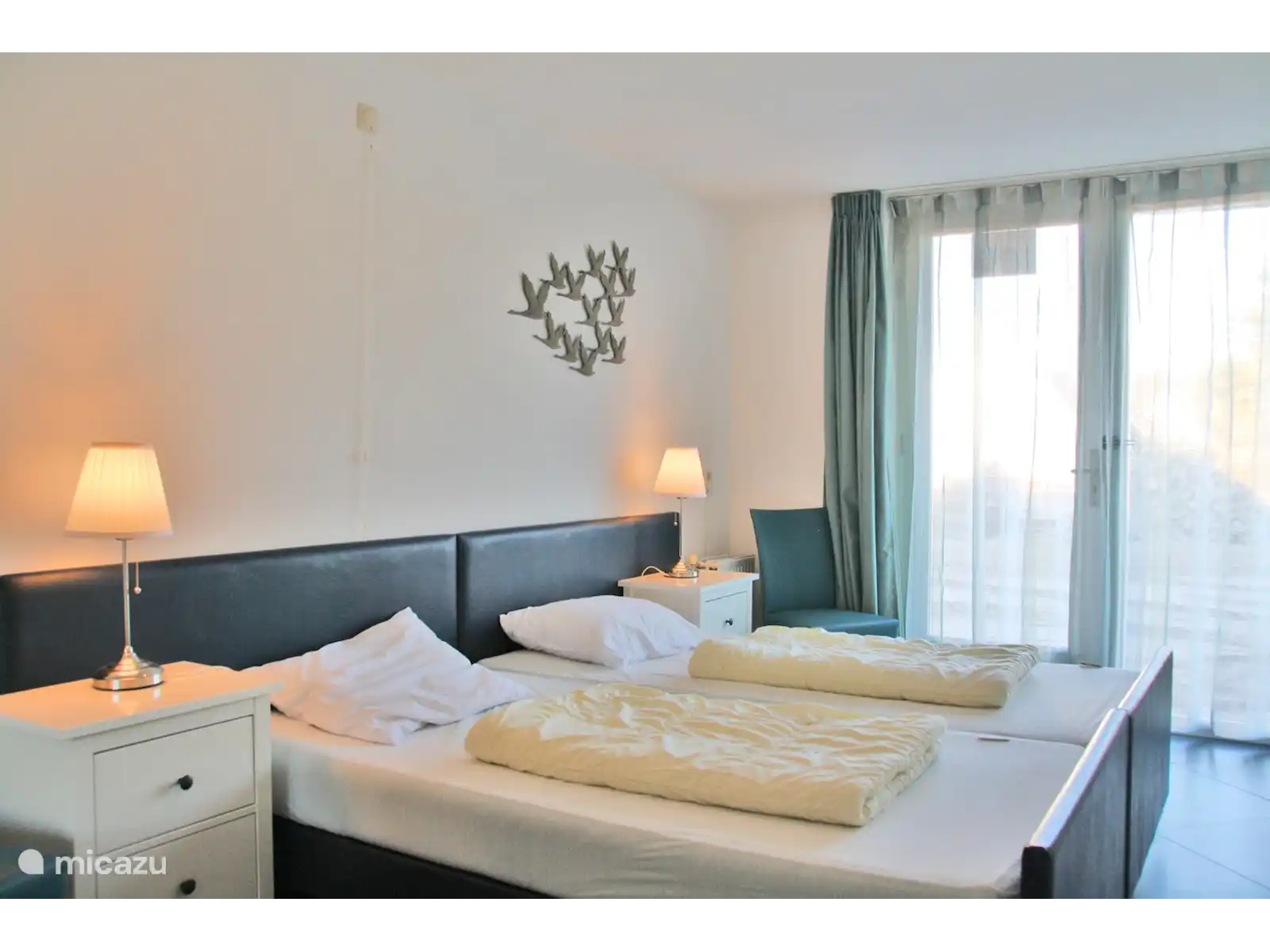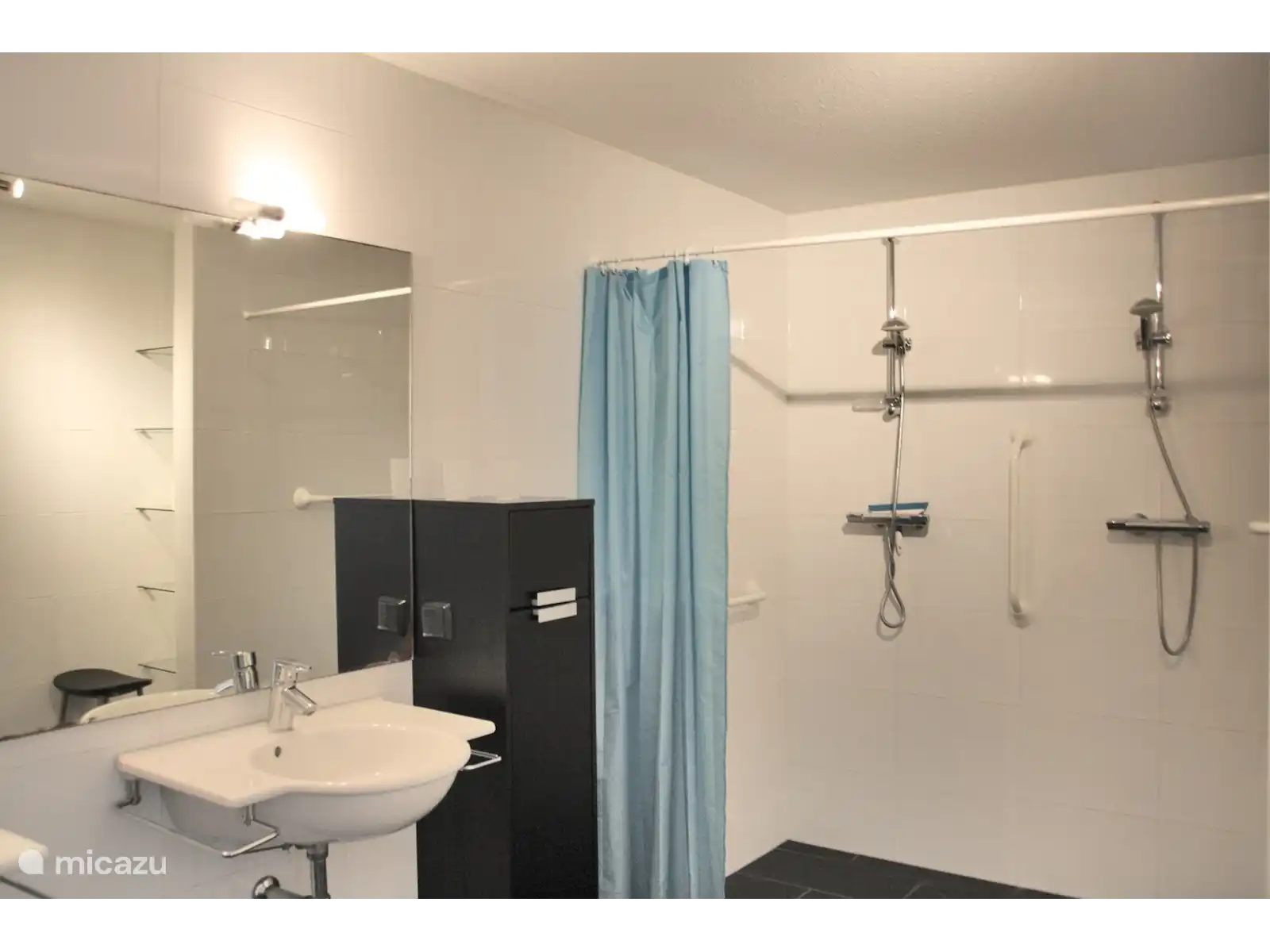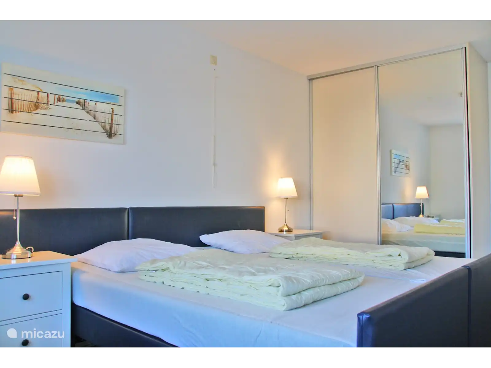 Het appartement heeft 2 grote slaapkamers en is geschikt voor 4 personen. Beide slaapkamers hebben eenpersoons boxspringbedden. Er is een ruime rolstoel vriendelijke badkamer met 2 douches wc en 2 wasbakken. Tevens is er een gasten toilet.
