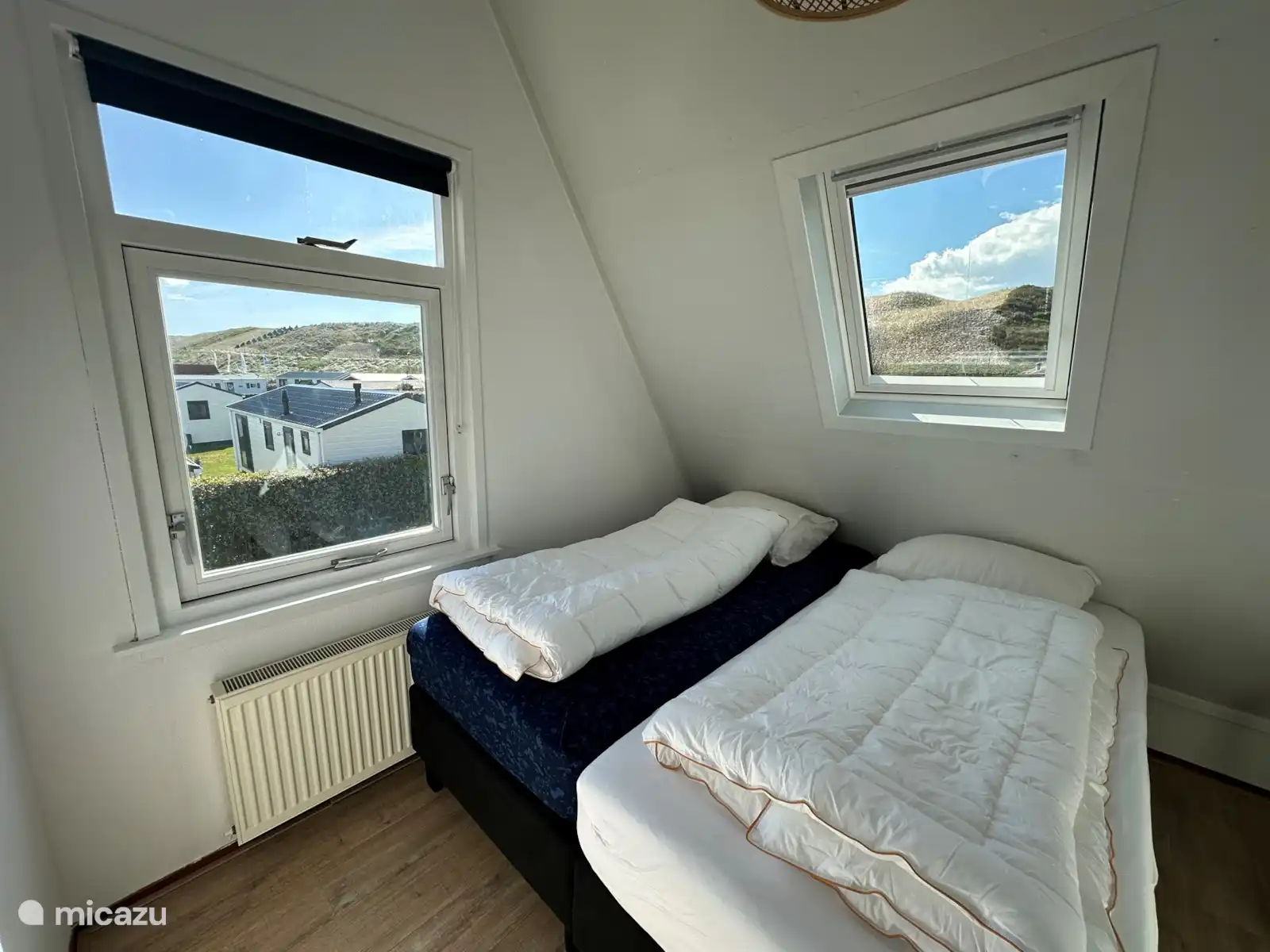 De vrijstaande bungalow ligt op een mooie locatie aan de rand van het park en heeft prachtig uitzicht op de duinen. Deze gezellig ingerichte bungalow heeft een open keuken in de woonkamer met schuifpui naar de tuin. In de woonkamer is een openhaard die u heerlijk kunt opstoken in de koudere maanden. De keuken is voorzien van een koelkast met vriesvak, vaatwasser, Nespresso, magnetron en inductiekookplaat. Boven zijn er 2 slaapkamers die beide 2 losse éénpersoonsbedden tegen elkaar hebben staan, die dus eventueel ook uit elkaar te zetten zijn. Op de begane grond is de 3e met ook 2 éénpersoonsbedden tegen elkaar aan.