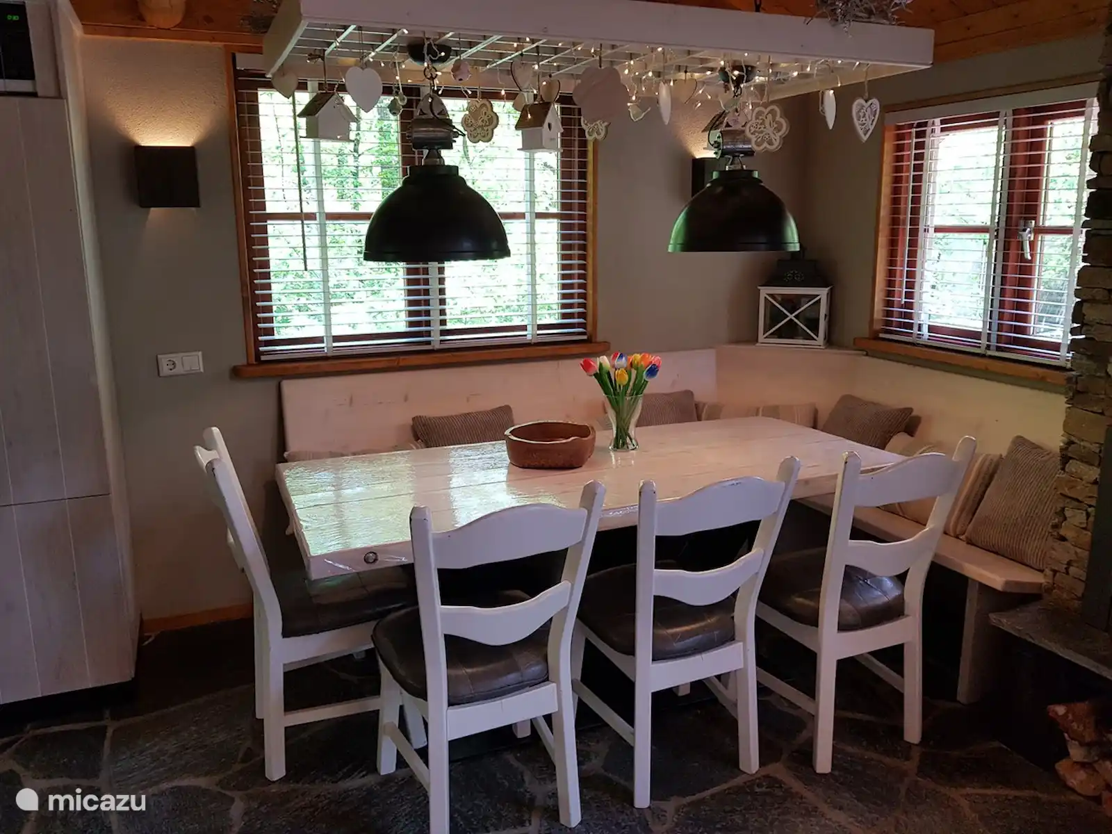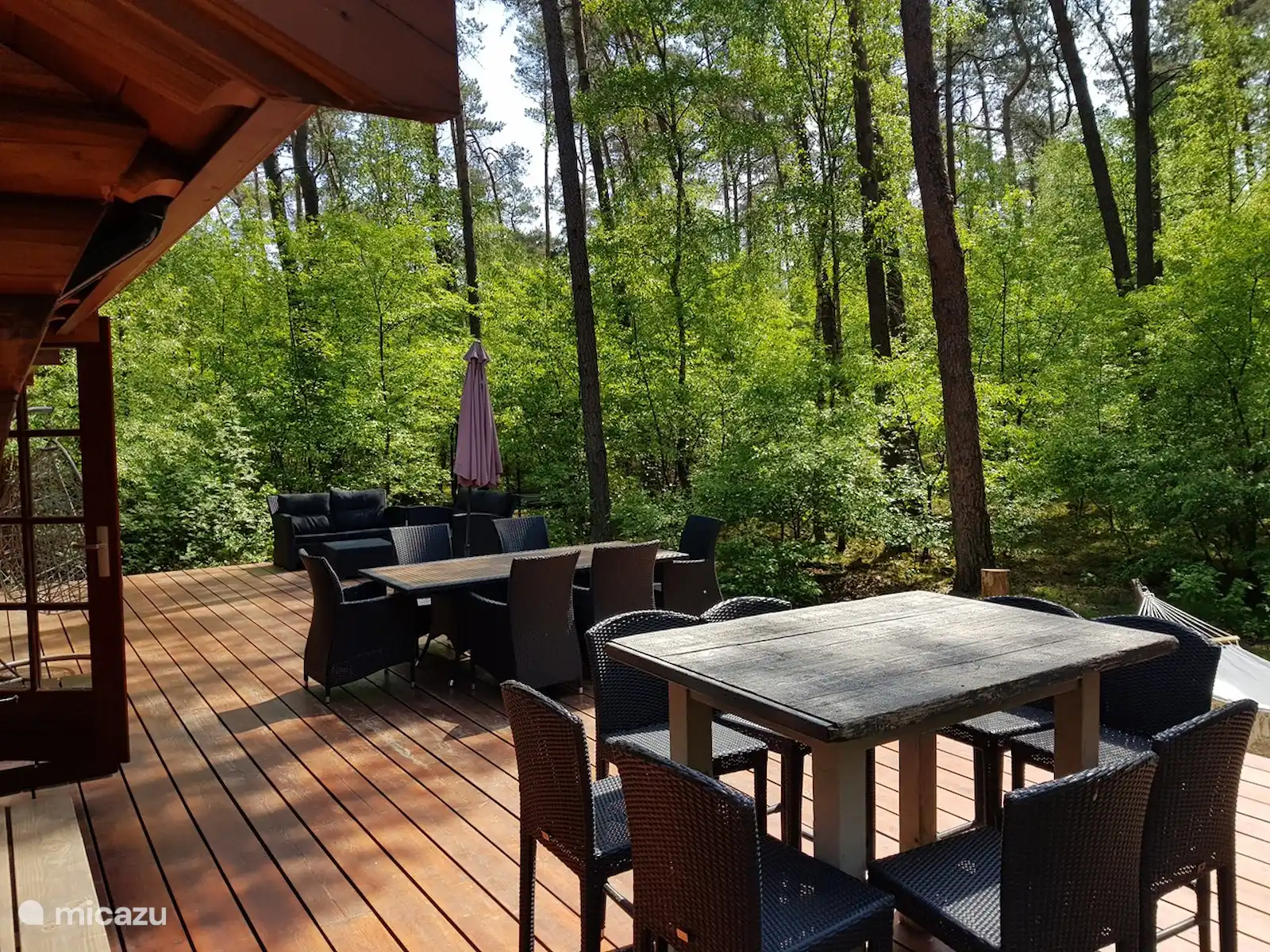 Op de vide in deze kamer (bereikbaar via een trapje) is nog een eenpersoons slaapplek. Tussen de slaapkamers ligt de badkamer met twee waskommen, ruime douche met stortkraan en whirlpool met lichttherapie. Naast de woonkamer ligt een derde slaapkamer met tweepersoonsbed (1.40 meter) en de toegang via een trapje tot een vide, waar je eventueel ook kunt slapen. Deze vide staat in open verbinding met de woonkamer. Er is een gezellige woonkamer met houtkachel en zithoek voor 10 personen. Naast de zithoek een kleine, luxe keuken. Via de terrasdeuren in de woonkamer stap je op de veranda die volledig om het huis is gebouwd. Hier geniet je van het groen, de rust en de ruimte om je heen. In de houtgestookte hottub is het aangenaam vertoeven. De genoemde prijzen zijn gebaseerd op 6 personen inclusief alle bijkomende kosten zoals schoonmaak, bed- en badlinnen, opgemaakte bedden bij aankomst, hottub incl hout, maar exclusief toeristenbelasting €1,45 pppd en €200 borg. Voor een huisdier is er een toeslag van €25 en er is een toeslag voor meer dan 6 personen van €30 pp.