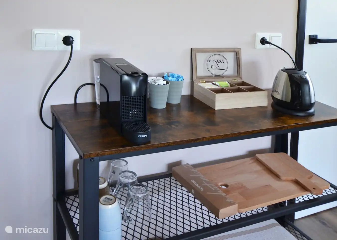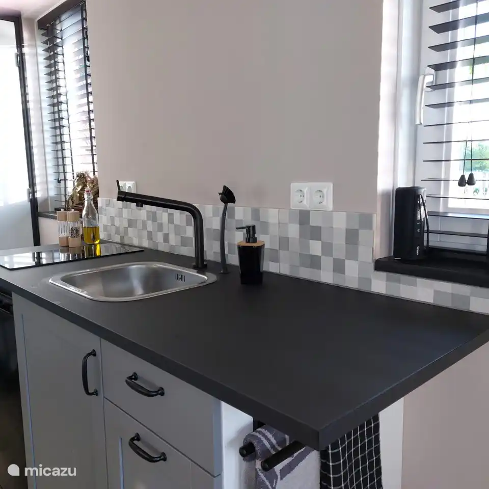 - Volledig uitgeruste keuken met een 2-pits inductiekookplaat, een koelkast, een nespresso koffie-apparaat en waterkoker