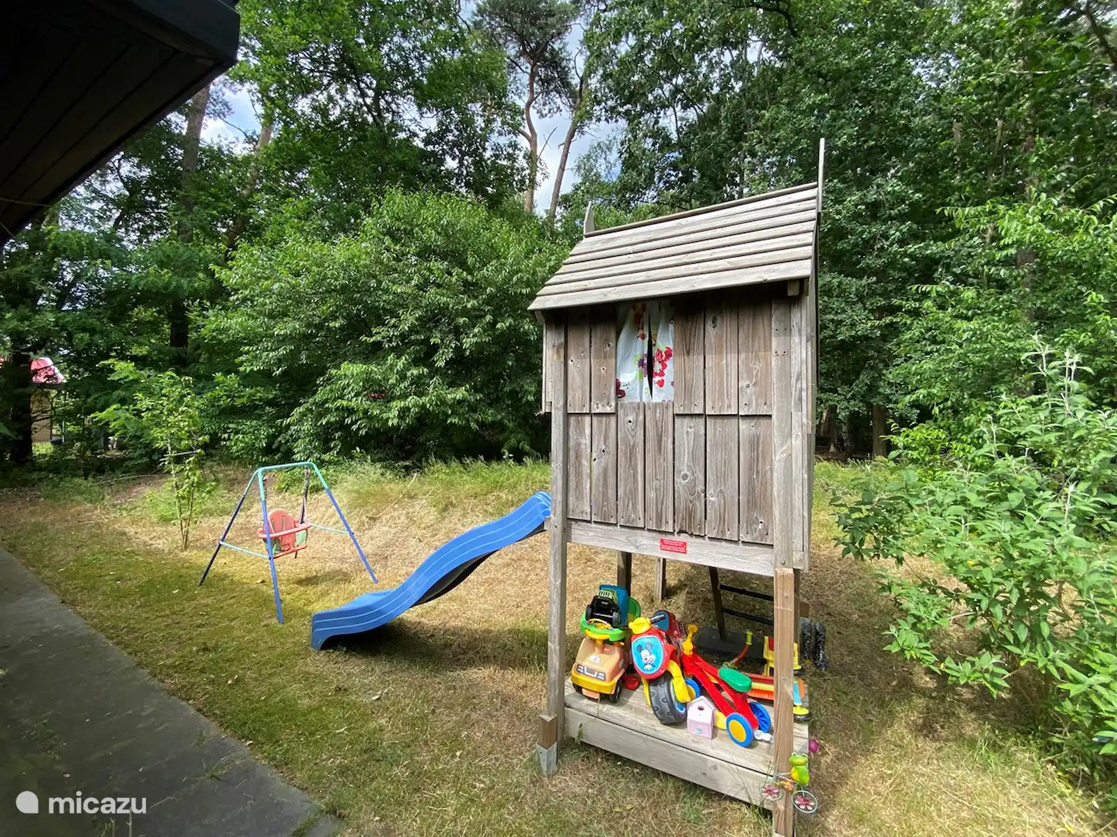 Onder een overkapping staat een tuinset met 4 comfortabele terrasstoelen, aan de zijkant van de woning staat een gezellige picknick tafel en aan de kant van het bos twee loungestoelen. Door de vele bomen rondom is er altijd wel een schaduwplek te vinden. Er is ruime parkeergelegenheid voor twee auto’s direct bij het huisje.