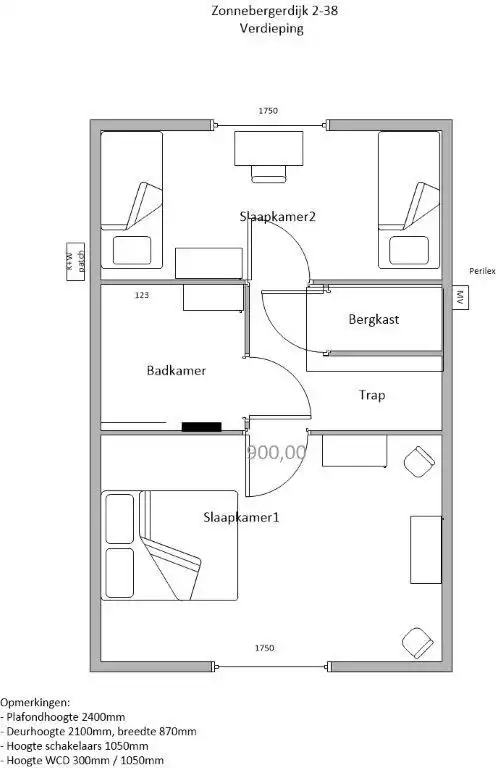 Dit is een kleinere slaapkamer met twee los geplaatste 90x200 eenpersoons boxsprings.