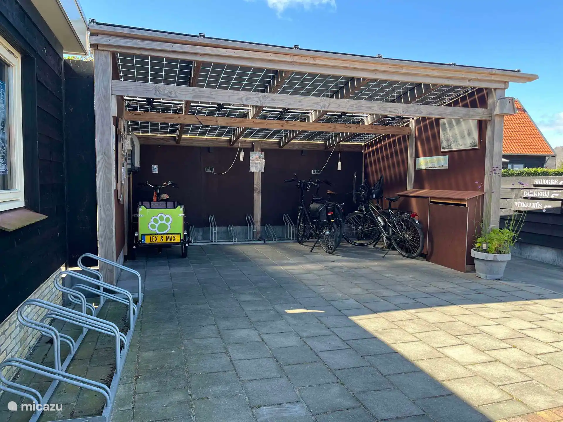 Het eigen terras grenst niet aan het appartement, maar aan de overkant van de eigen oprit. Het terras biedt veel beschutting tegen de wind en heeft tot in de late uurtjes zon.