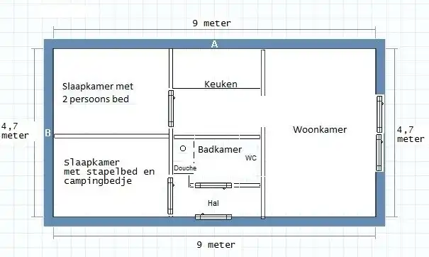De woning staat op ruim perceel met voor- en zijtuin met veel privacy, zon en schaduw. De indeling is als volgt: hal,badkamer met douche, wastafel, toilet, woonkamer met openslaande deuren naar terras, keuken, slaapkamer met een tweepersoonsbed en kledingkast, slaapkamer met stapelbed en kledingkast. U kunt uw auto bij het huisje parkeren op een privé parkeerplaats.In het huisje is gratis Wifi beschikbaar, tevens wordt de eind schoonmaak voor u verzorgd.