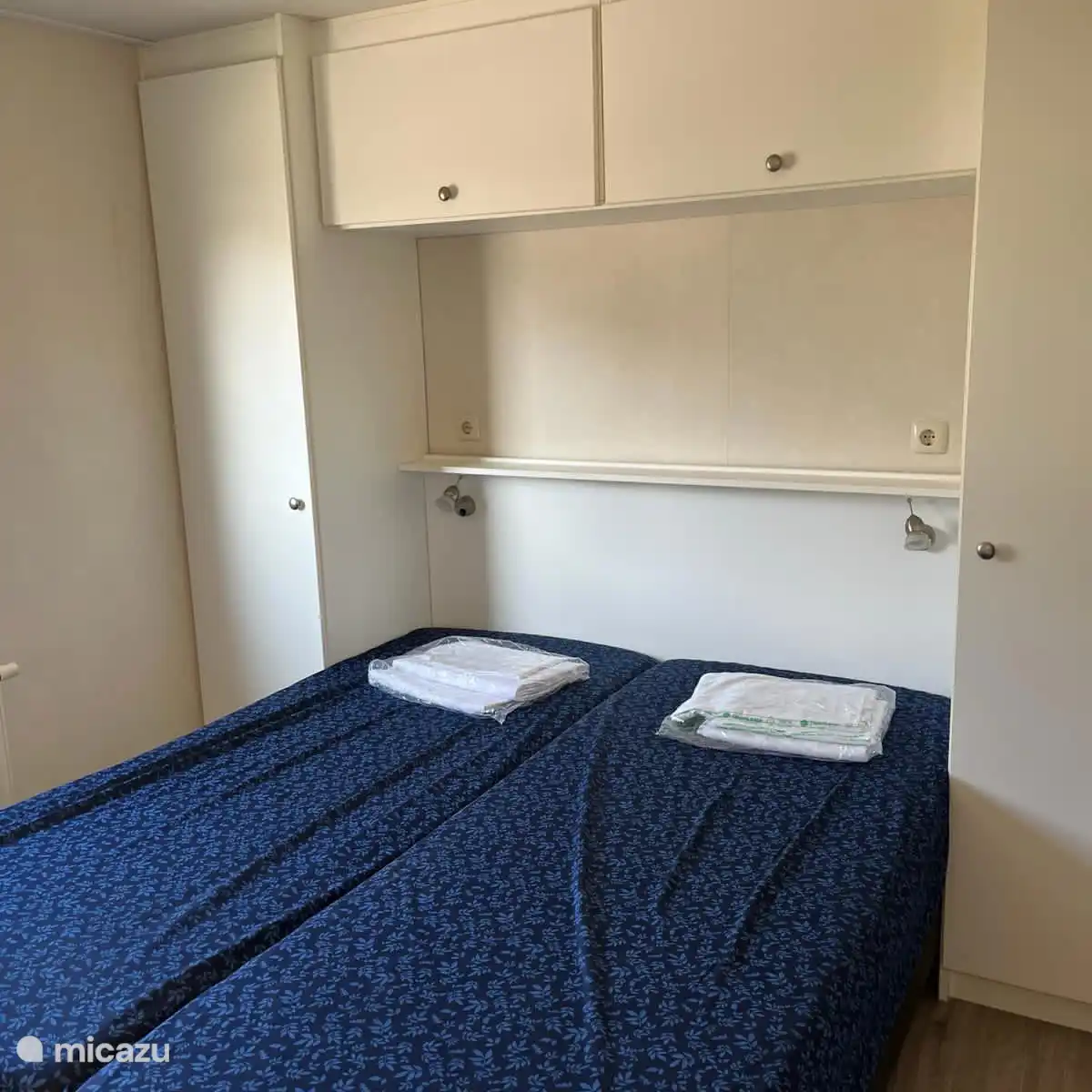 - Een kamer met twee eenpersoonsbedden, een met een stapelbed