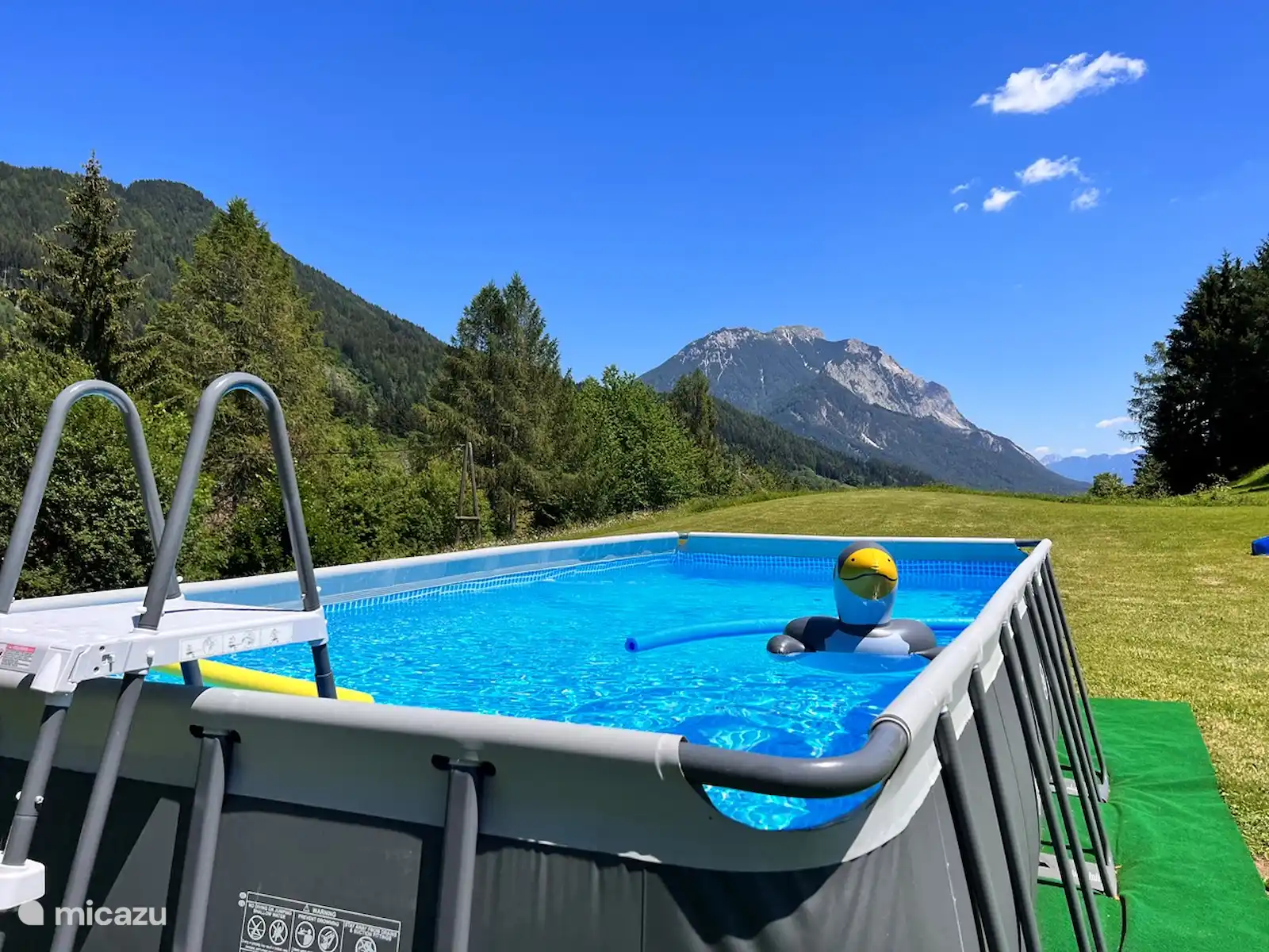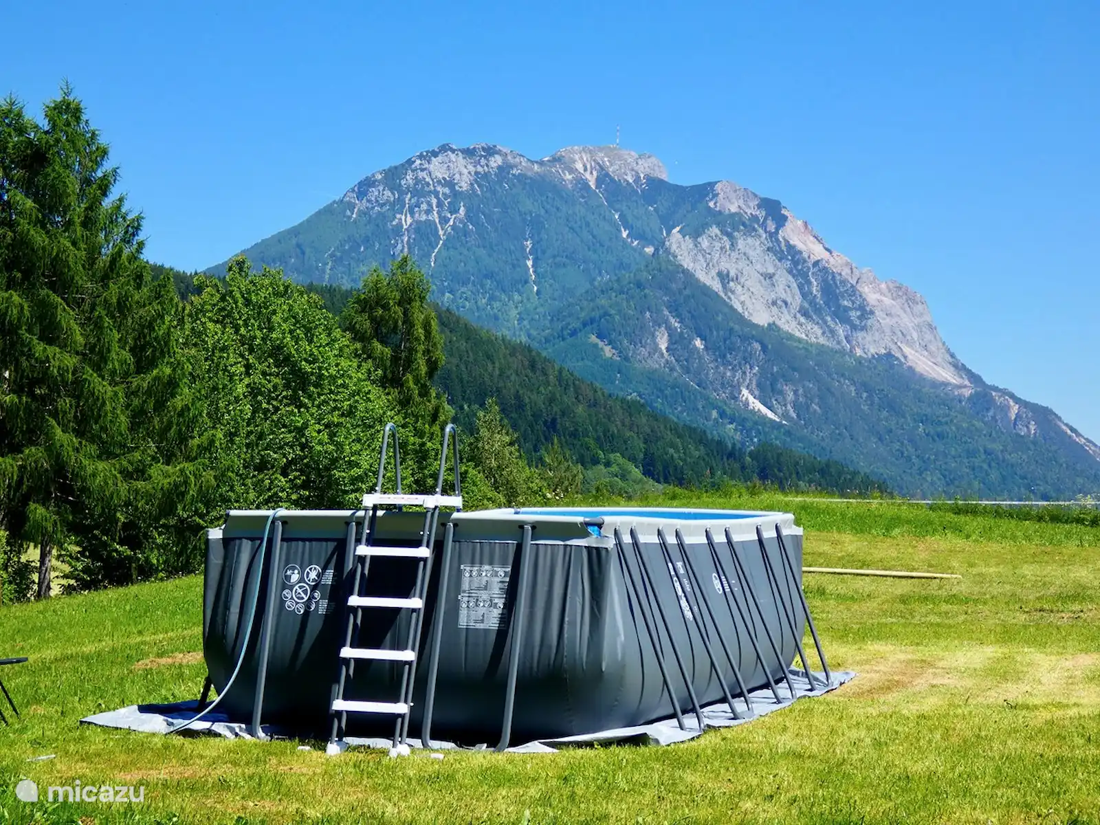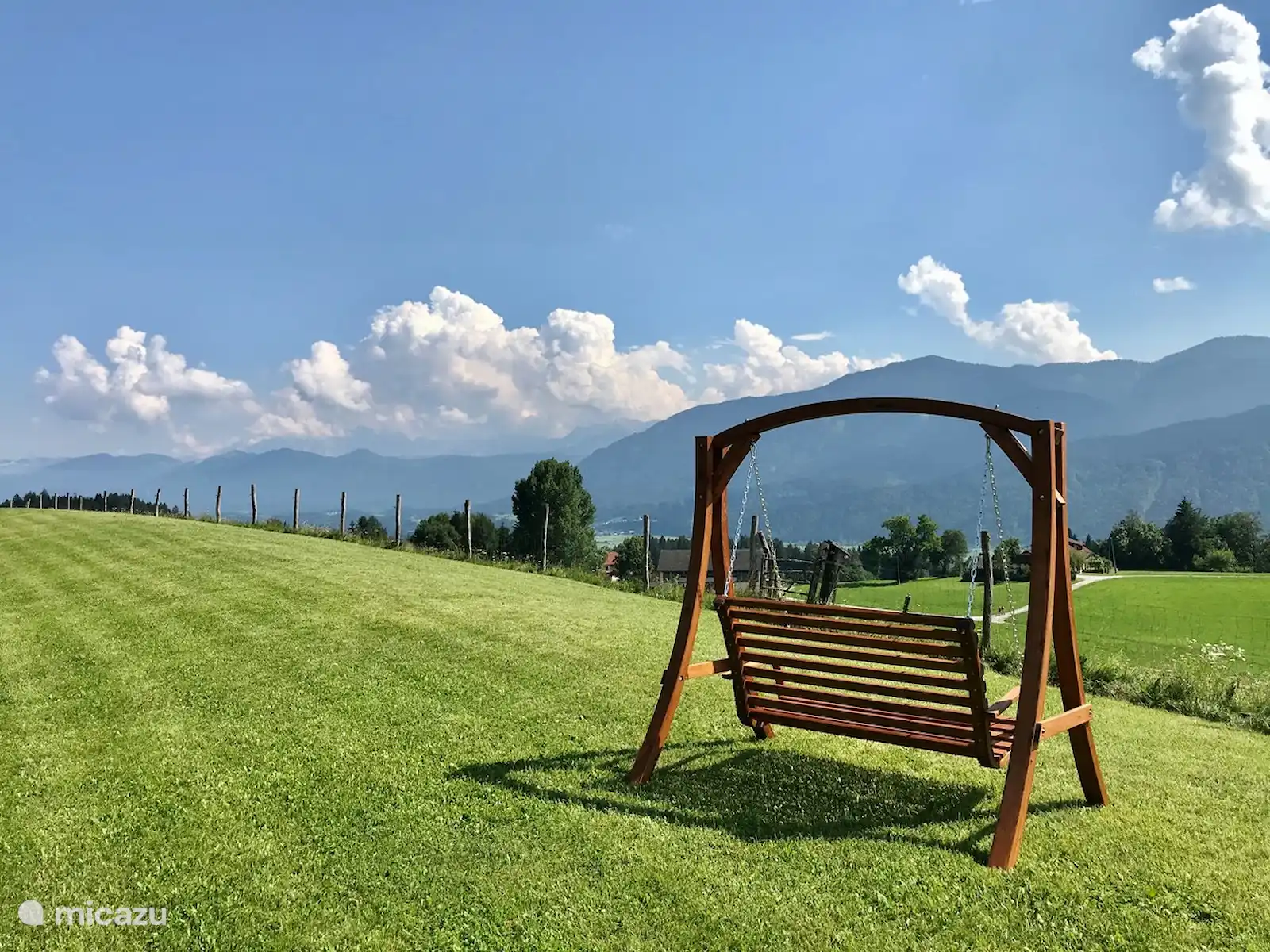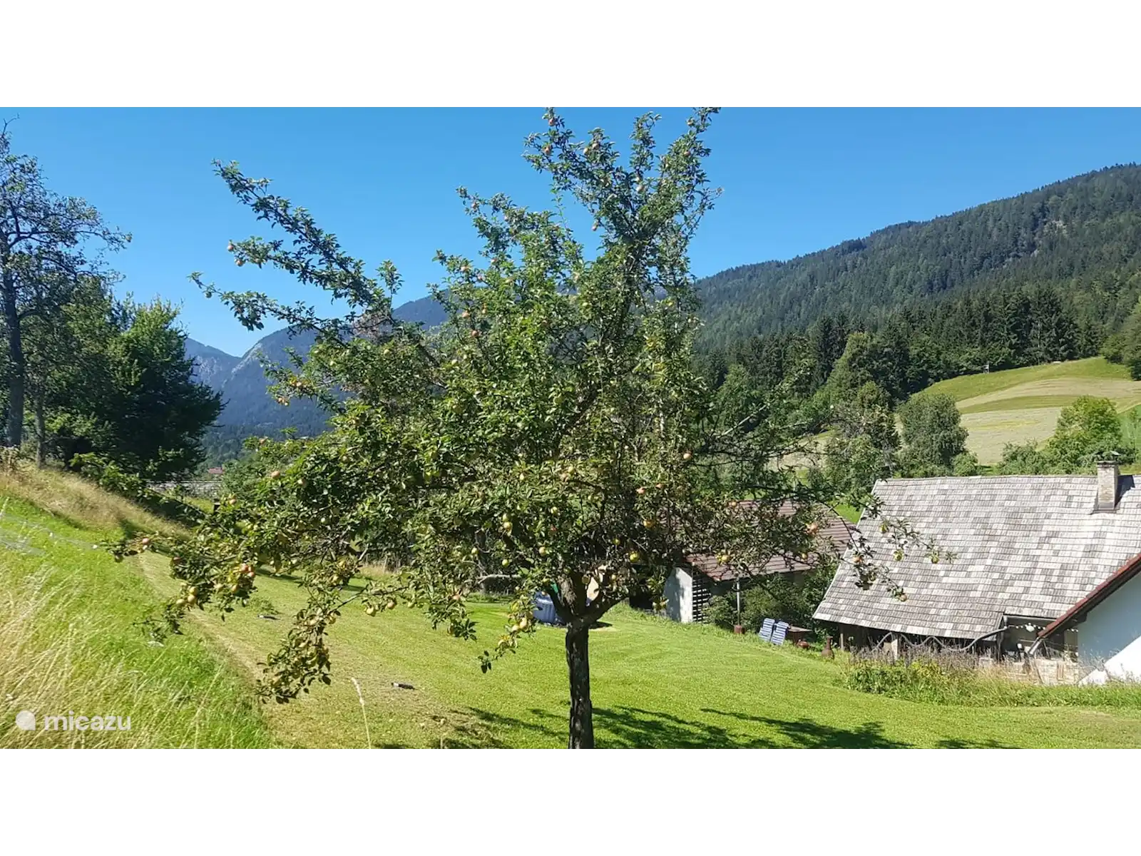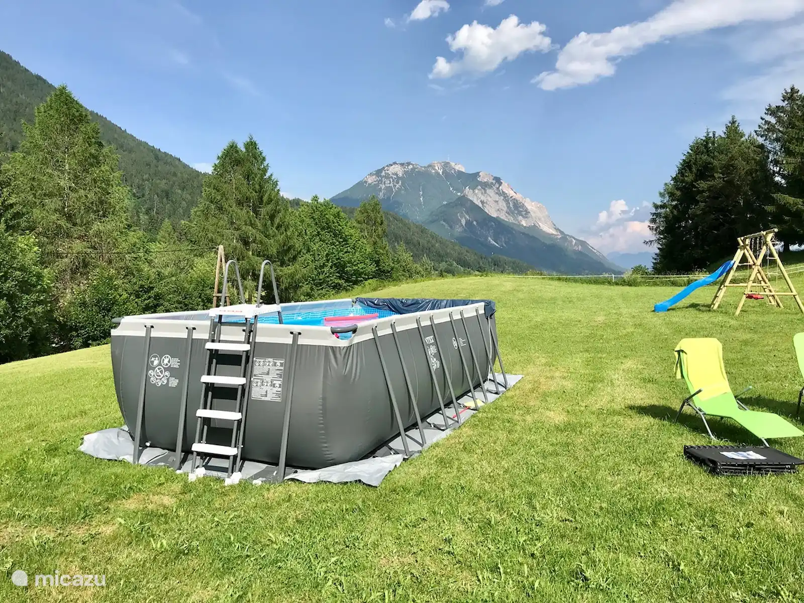 Het huis staat op 7.800 m2 eigen grond. Het hele jaar door zijn er zowel zon-als schaduwplekjes te vinden in de tuin. Centraal staat de prachtige grote lindeboom (Tilia). Ook heeft de tuin diverse fruitbomen. Vanaf het bovenste deel van de tuin heb je een adembenemend uitzicht hebt met 365 graden view over het mooie Gailtal, de Julische Alpen, Slovenië en Italië. 'S avonds naar de zonsondergang kijken vanuit de schommelstoel of daar de dag starten, dat is echt genieten. Je kunt de tuin altijd gebruiken; om te koffiedrinken, te eten bij de picknick tafel, te zonnen in één van de ligstoelen of lekker buiten voetballen of badmintonnen. Ruimte genoeg! Voor de kinderen is er buiten speelgoed aanwezig. Ook het grote opbouwzwembad is voor alle gasten vrij te gebruiken.