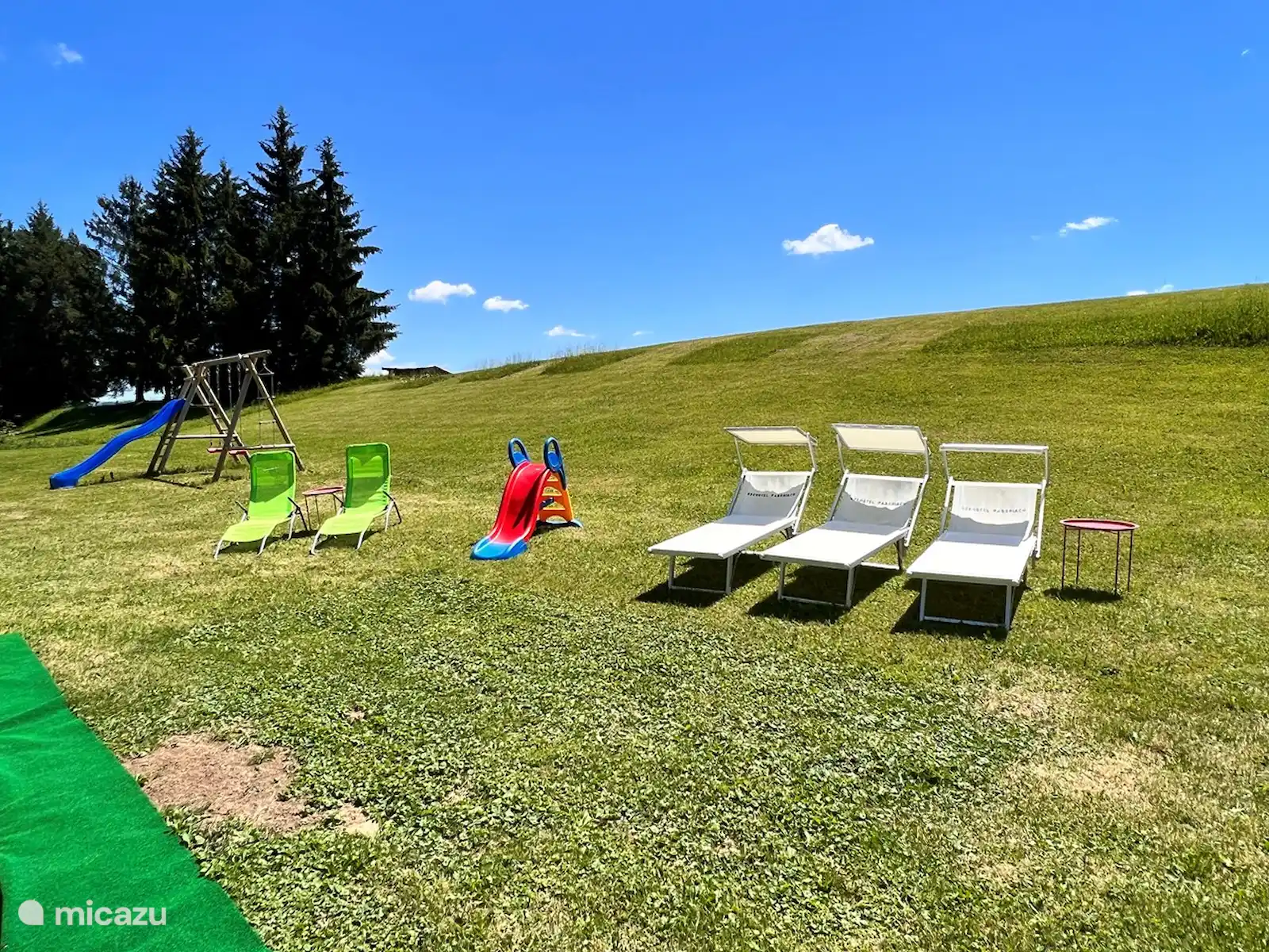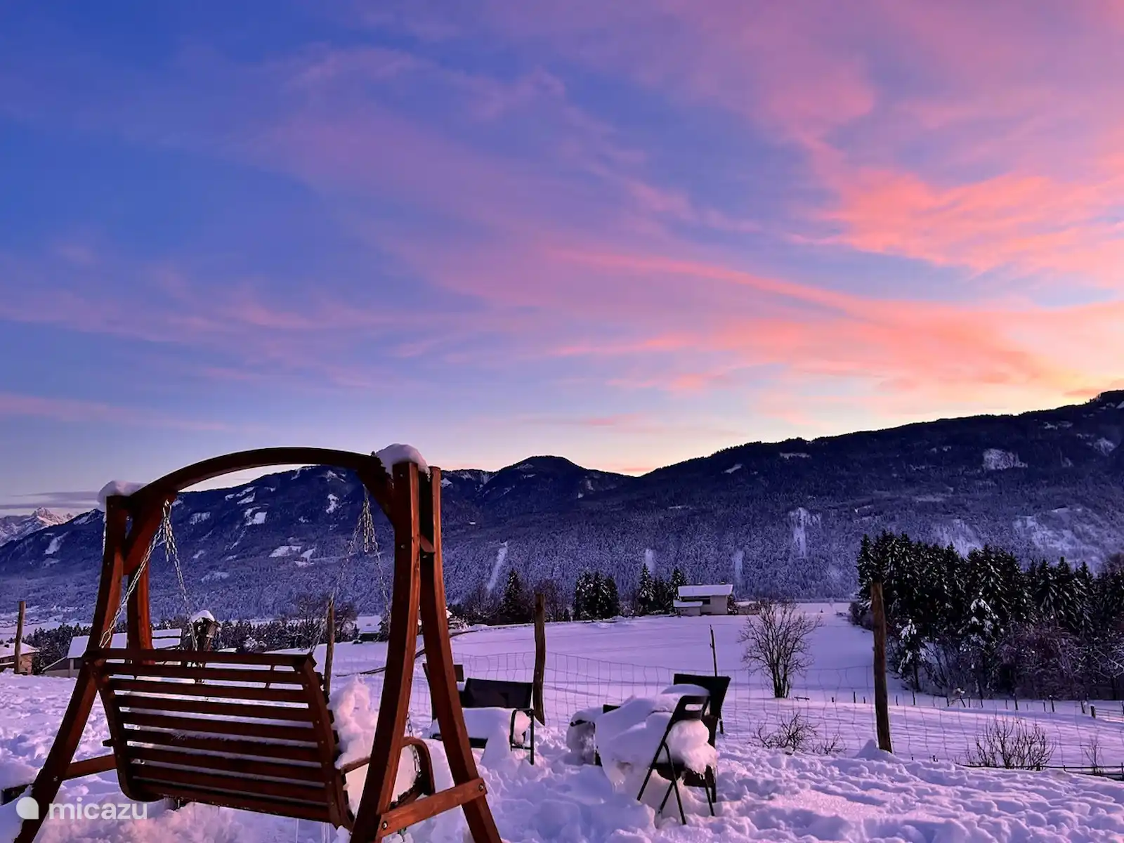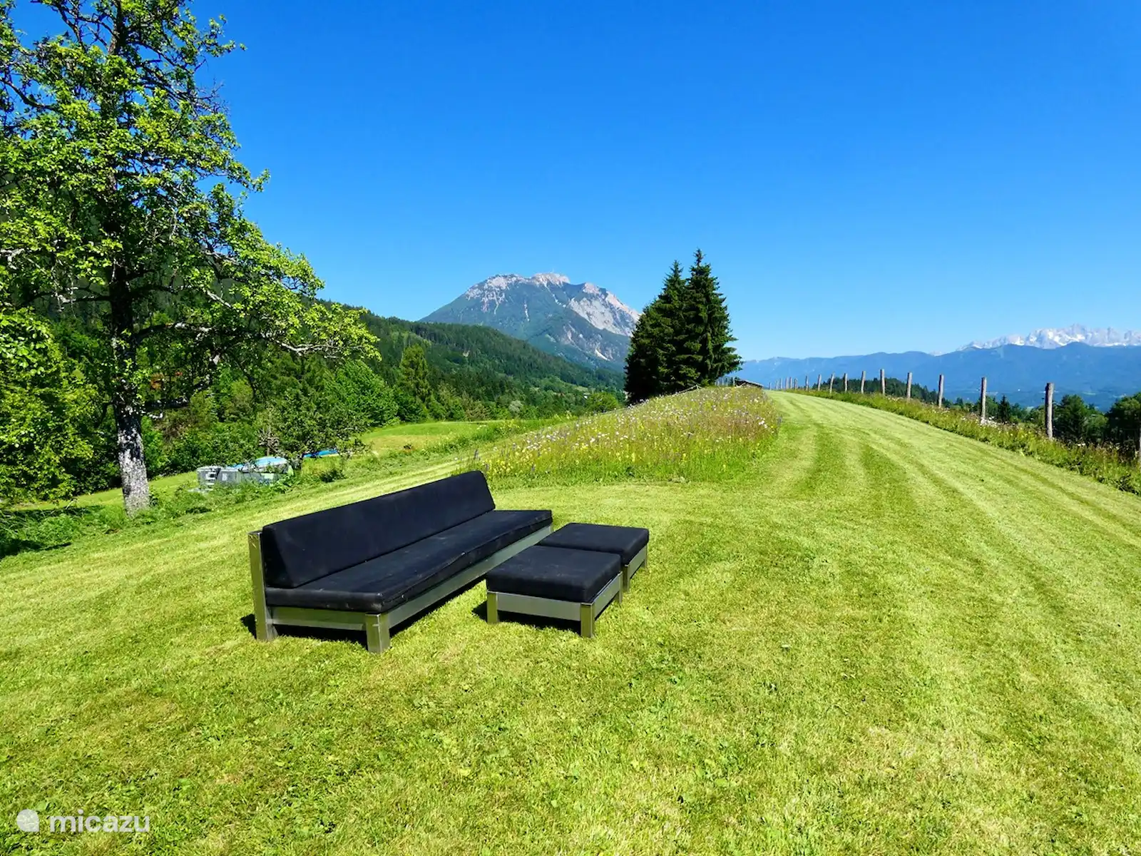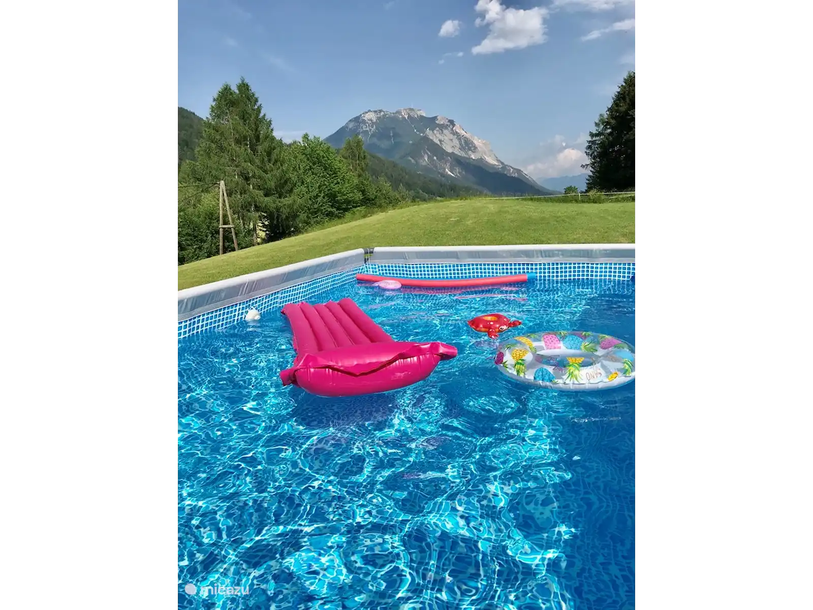 Het huis staat op 7.800 m2 eigen grond. Het hele jaar door zijn er zowel zon-als schaduwplekjes te vinden in de tuin. Centraal staat de prachtige grote lindeboom (Tilia). Ook heeft de tuin diverse fruitbomen. Vanaf het bovenste deel van de tuin heb je een adembenemend uitzicht hebt met 365 graden view over het mooie Gailtal, de Julische Alpen, Slovenië en Italië. 'S avonds naar de zonsondergang kijken vanuit de schommelstoel of daar de dag starten, dat is echt genieten. Je kunt de tuin altijd gebruiken; om te koffiedrinken, te eten bij de picknick tafel, te zonnen in één van de ligstoelen of lekker buiten voetballen of badmintonnen. Ruimte genoeg! Voor de kinderen is er buiten speelgoed aanwezig. Ook het grote opbouwzwembad is voor alle gasten vrij te gebruiken.