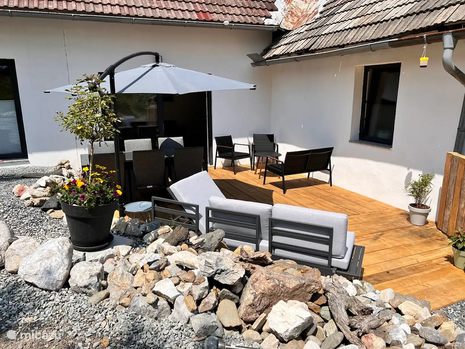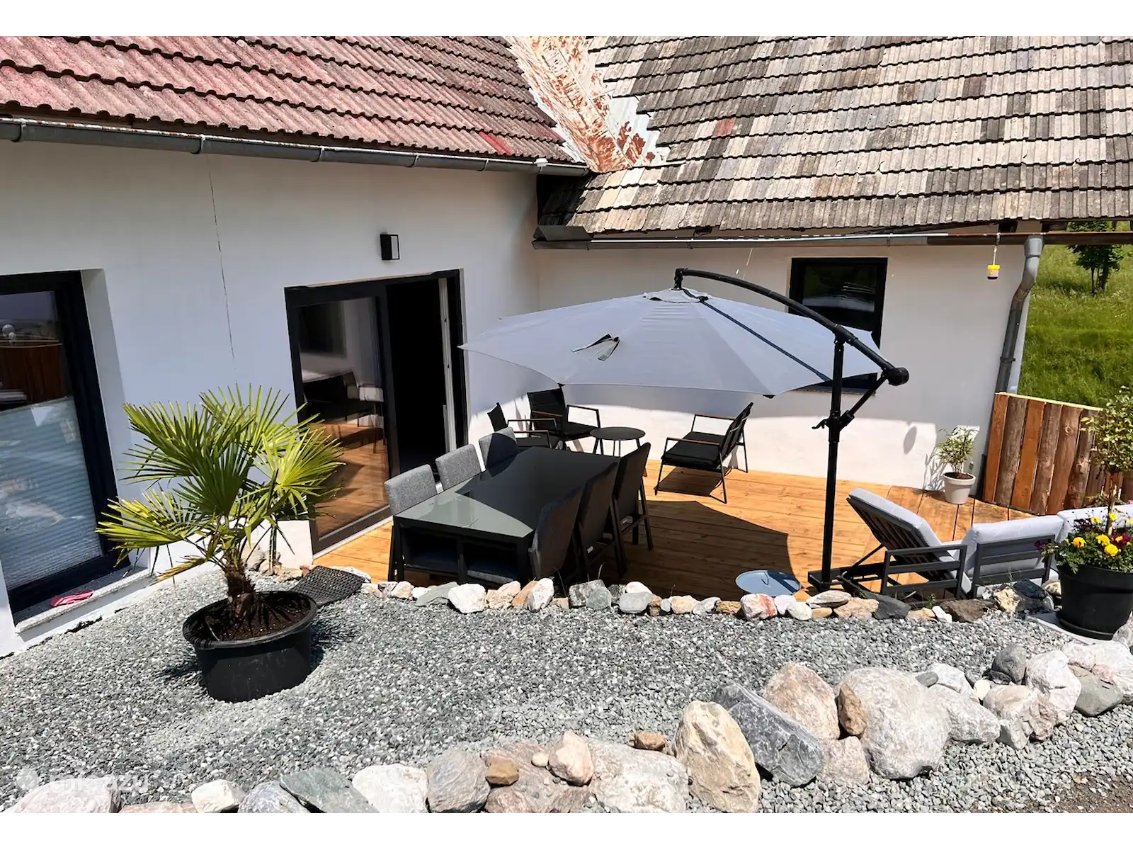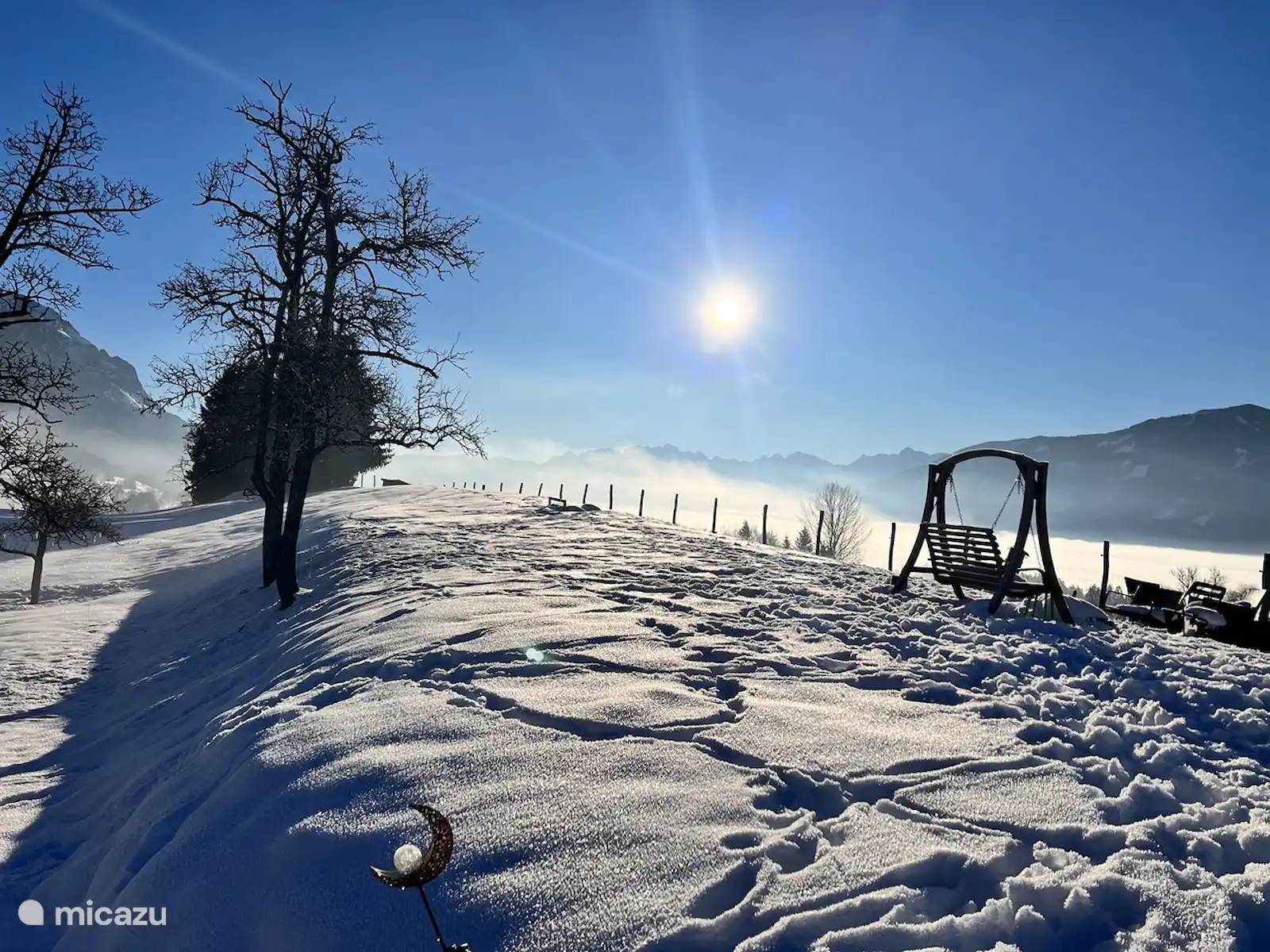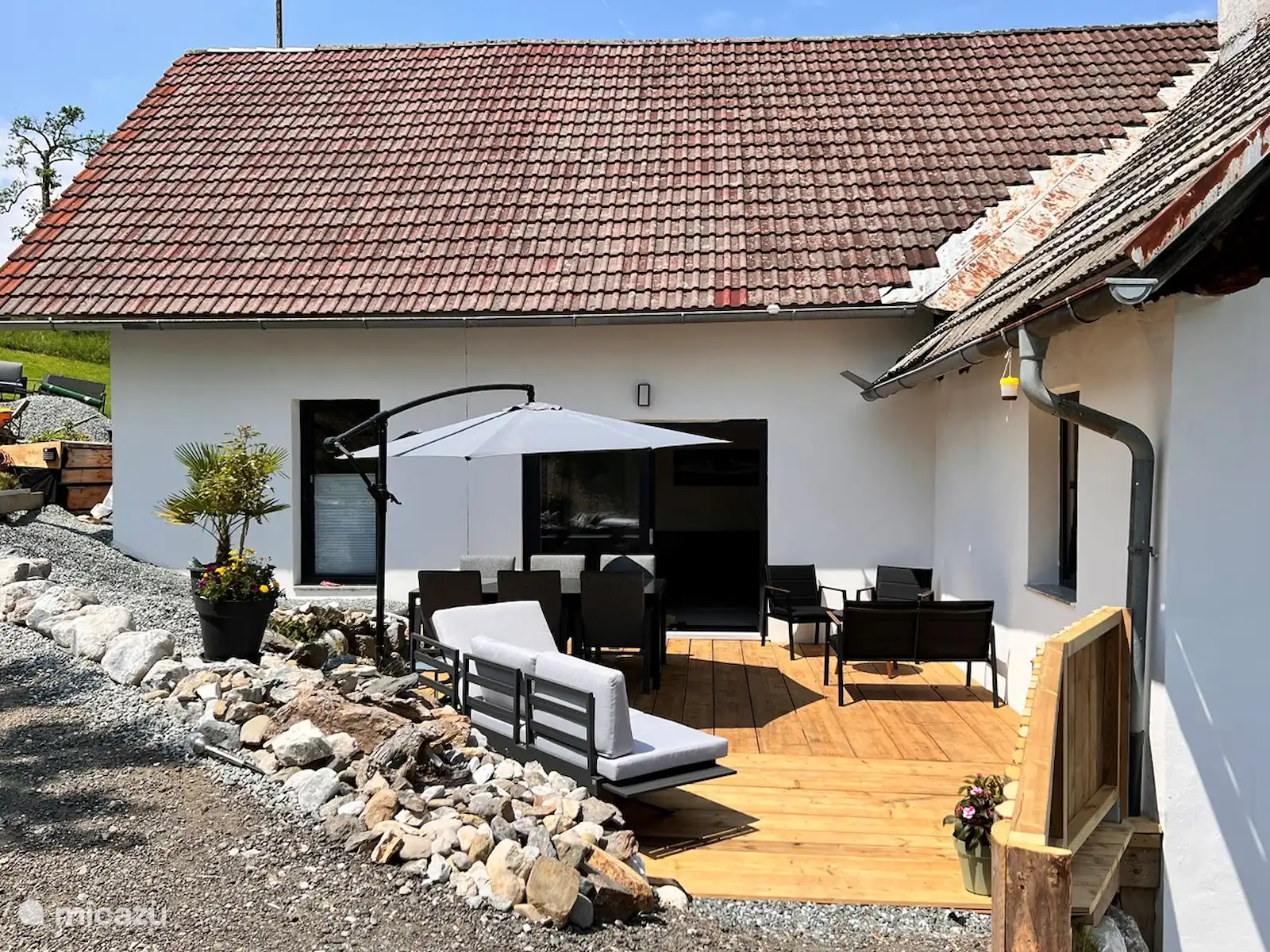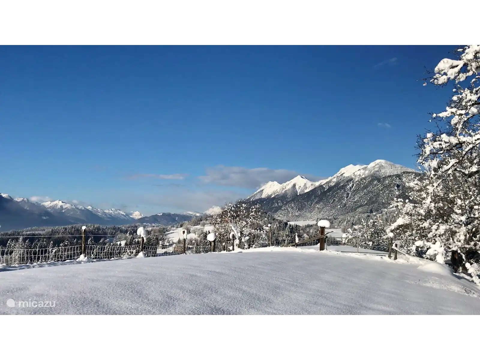 Het huis staat op 7.800 m2 eigen grond. Het hele jaar door zijn er zowel zon-als schaduwplekjes te vinden in de tuin. Centraal staat de prachtige grote lindeboom (Tilia). Ook heeft de tuin diverse fruitbomen. Vanaf het bovenste deel van de tuin heb je een adembenemend uitzicht hebt met 365 graden view over het mooie Gailtal, de Julische Alpen, Slovenië en Italië. 'S avonds naar de zonsondergang kijken vanuit de schommelstoel of daar de dag starten, dat is echt genieten. Je kunt de tuin altijd gebruiken; om te koffiedrinken, te eten bij de picknick tafel, te zonnen in één van de ligstoelen of lekker buiten voetballen of badmintonnen. Ruimte genoeg! Voor de kinderen is er buiten speelgoed aanwezig. Ook het grote opbouwzwembad is voor alle gasten vrij te gebruiken.