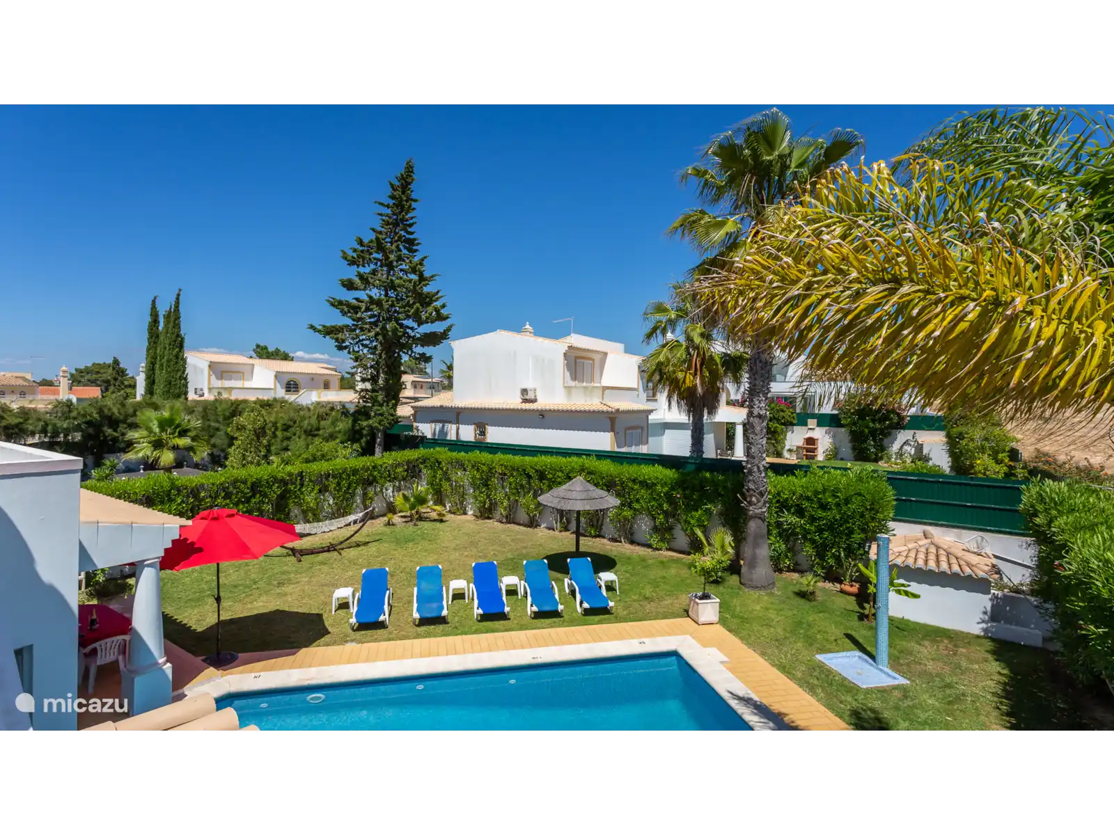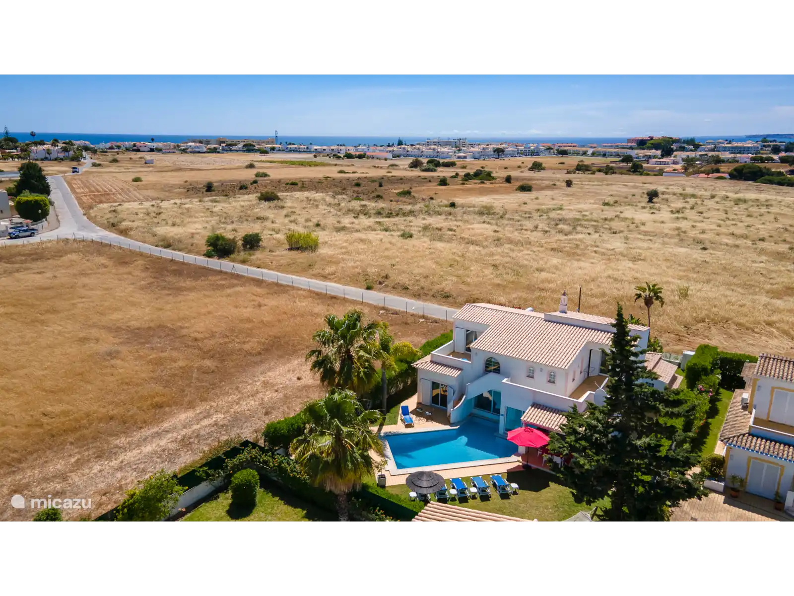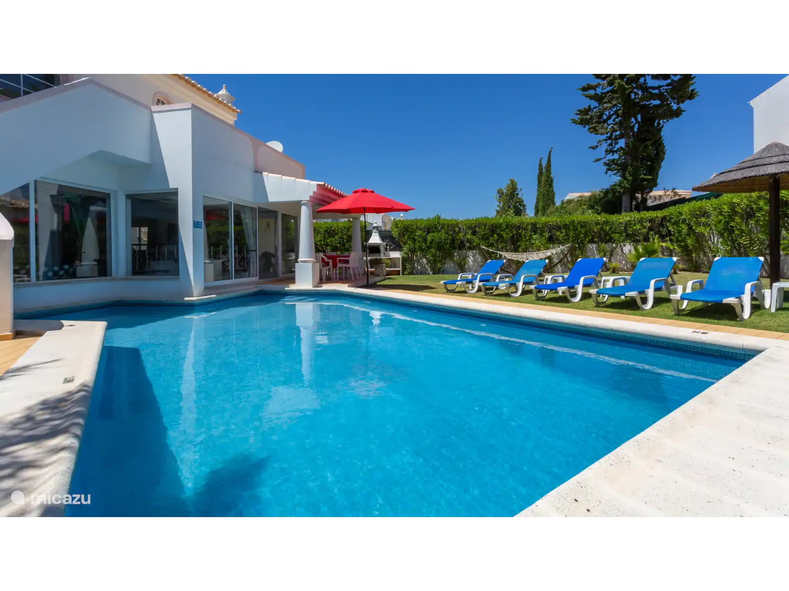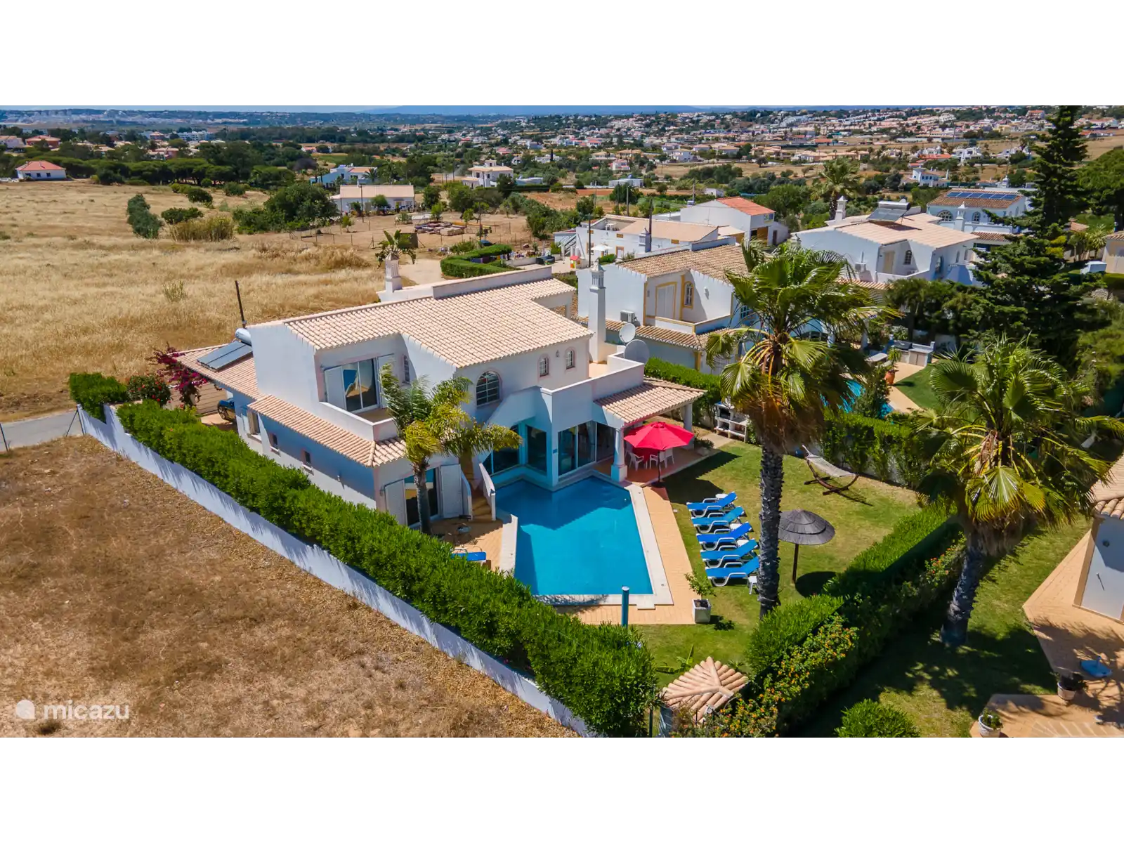 Deze moderne villa is gelegen in de buurt van Galé, wat een prachtig zandstrand en goede restaurants bezit. Er is een carport en een kleine tuin aan de voorkant van het huis. Vanuit de hal komt u via 2 treden in de woon / eetkamer die ruim en licht is wat de kamer zeer aantrekkelijk maakt. Er staan twee zeer comfortabele bamboe sofa's, een open haard en een hoekbar. Er zijn openslaande deuren naar het terras en het zwembad. De slaapkamer op de eerste verdieping heeft een nautisch thema en via een terras met een trapje komt u bij het zwembad. Er is een grasveld en een oleander haag rondom de tuin.