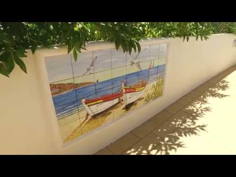 Rond het zwembad staan zonnebedden opgesteld met natuurlijk diverse parasols en een paar bijzettafeltjes. In de hoek bij het zwembad staat nog een extra grote barbecue van roestvrij staal en daar tegenover bevindt zich een grote, typisch Portugese stenen eettafel waarvan het bovenblad is voorzien van de bekende blauw/witte portugese tegels, evenals de bijbehorende lange bank. Ook staan er een aantal extra stoeltjes. Een heerlijke plek om met de hele familie te barbecueen.