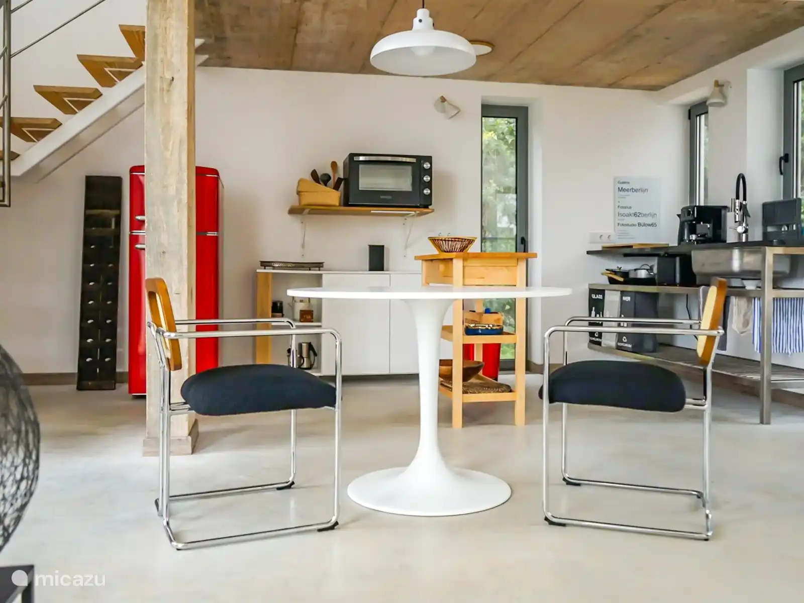 De loft is in een eigen natuurgebied van ruim 10 hectare. ca. 75 M2 groot, biedt op de open verdieping de slaapkamer met een bureau. Een bijzondere woonkamer met uitzichtbank, tevens derde slaapplek en een open keuken. De badkamer heeft een douche, wastafel en toilet.