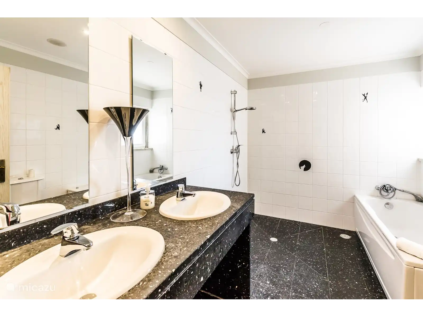 Eerste verdieping: 1 ruime slaapkamer met een tweepersoonsbed + 1 badkamer met bubbelbad en douche, 1 ruime slaapkamer met 2 eenpersoonsbedden + 1 eenpersoonsbed op vloerniveau + badkamer met bubbelbad, 1 ruime slaapkamer met een tweepersoonsbed + badkamer met douchecabine