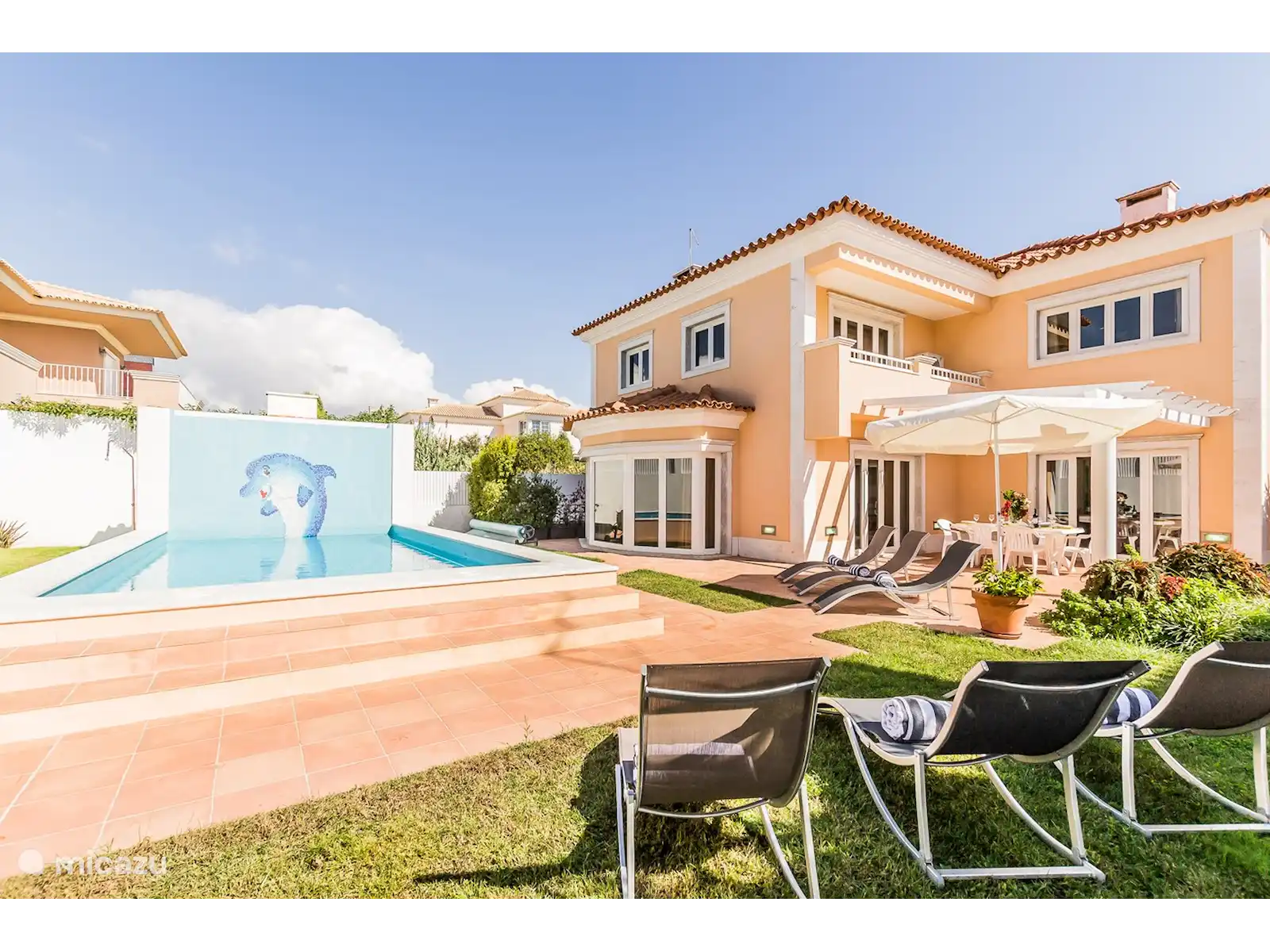 Villa met privezwembad, binnen 800 meter van de zee! Gelegen in Cascais, naast het resort van Quinta da Marinha, het huis ligt op slechts 5 minuten weg van de dichtstbijzijnde stranden en de jachthaven. Binnen 1 KM: Golf, 10 tennisbanen (twee kunstgras en acht in klei), 3 padel rechtbanken, 3 squashbanen / racketball rechtbanken, sauna, fitnessruimte, een overdekt zwembad, restaurants en de Quinta da Marinha Equestrian Centre.
