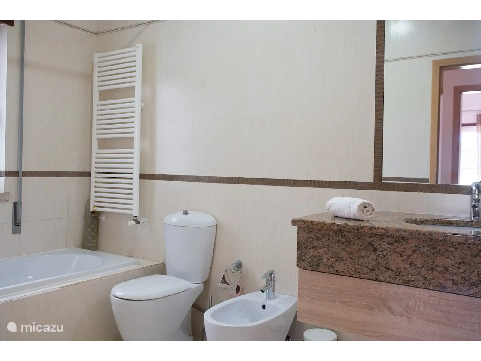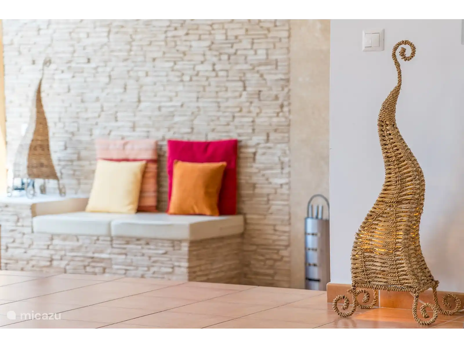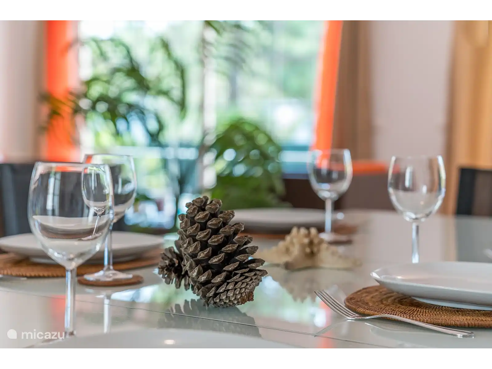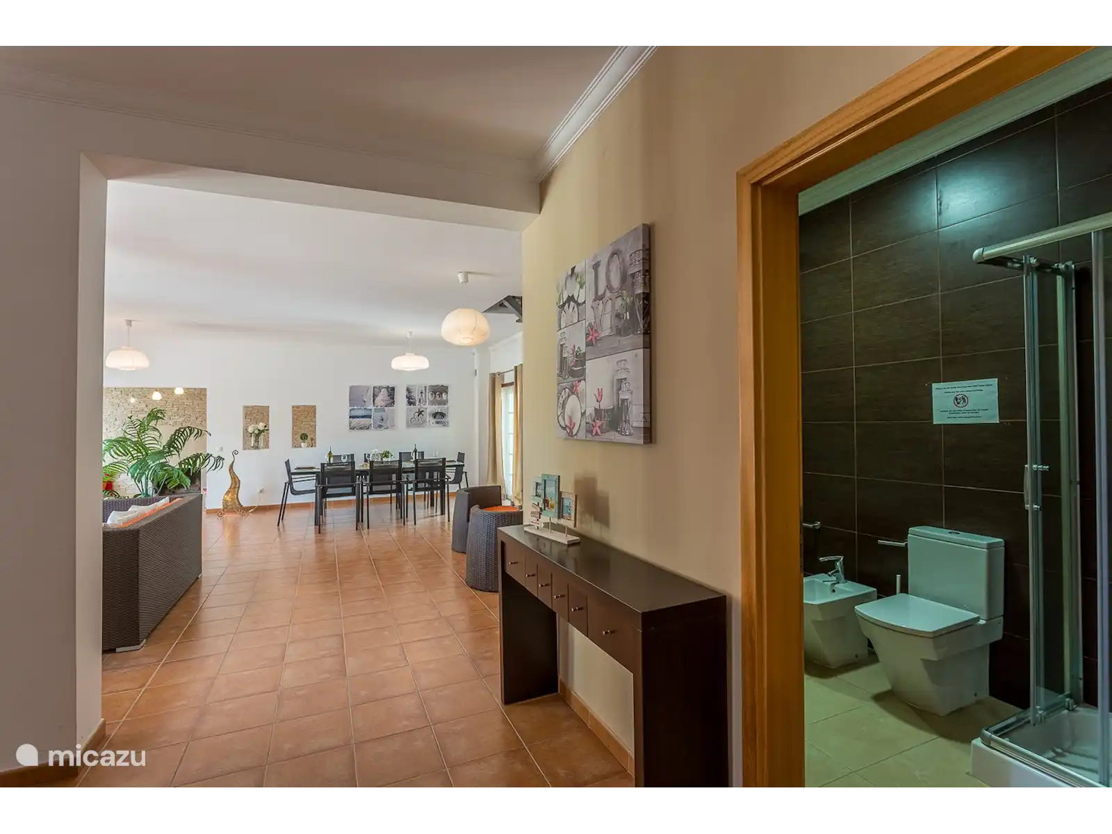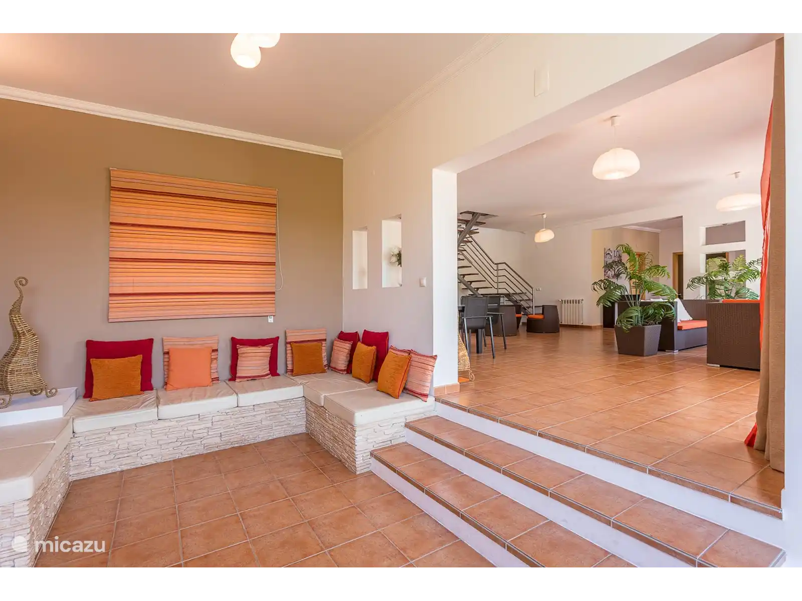 Op de begane grond is er een open woonruimte met eettafel en stoelen. Daarnaast is er een tv kamer met een openhaard. De keuken is volledig uitgerust en het heeft een balkon met uitzicht over het zwembad. Beneden is er tevens een douche beschikbaar.