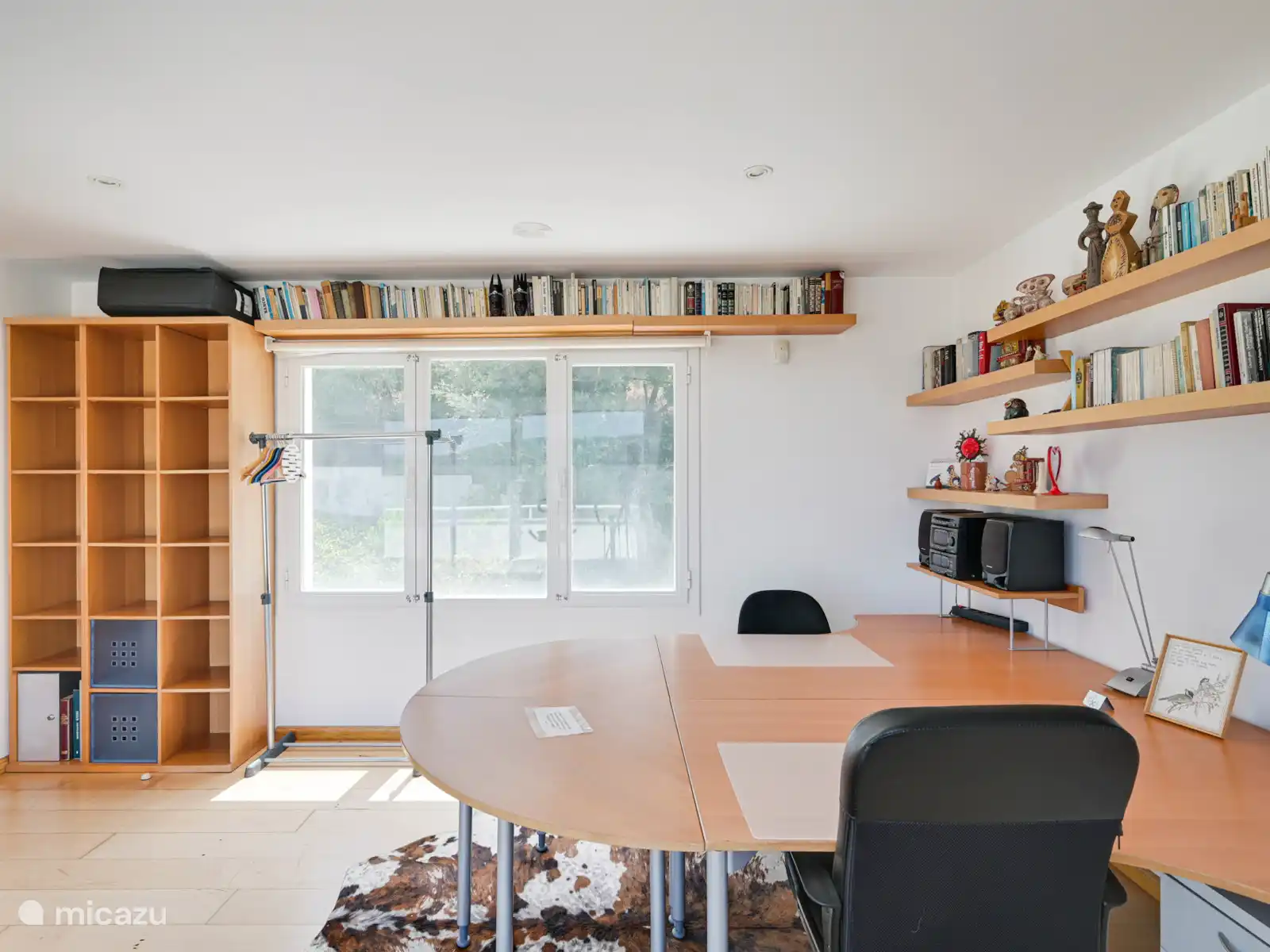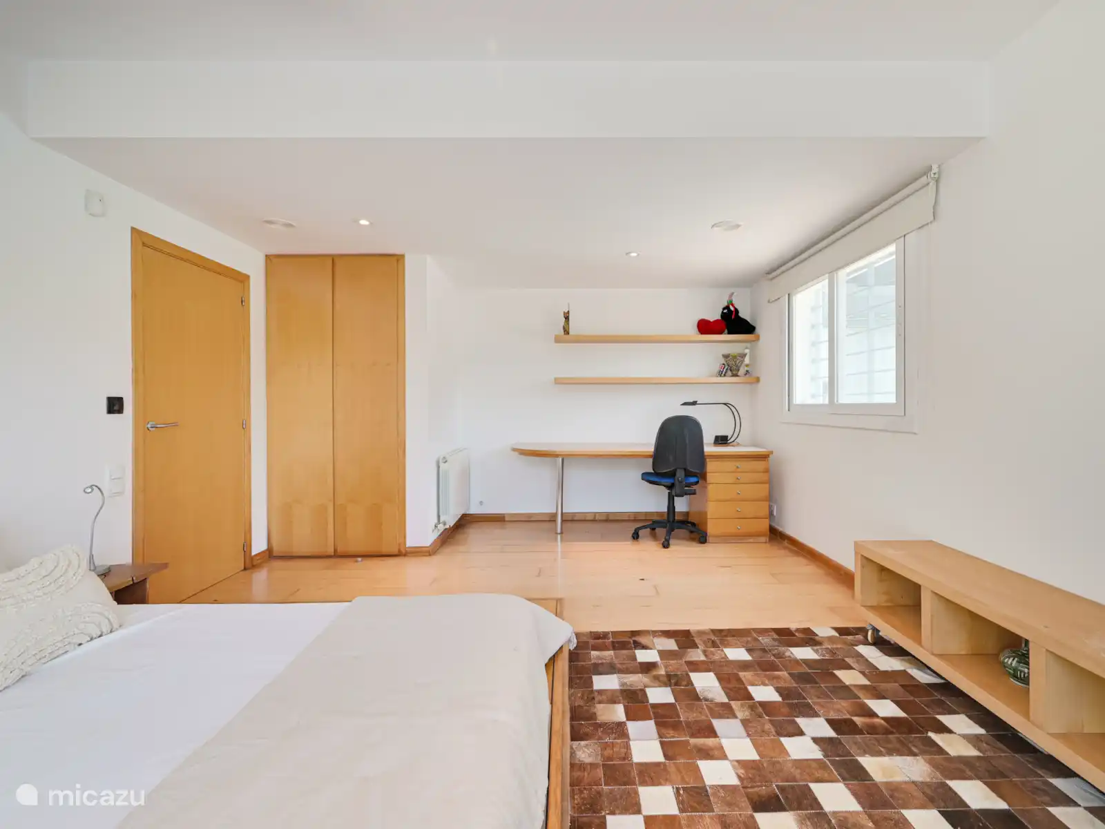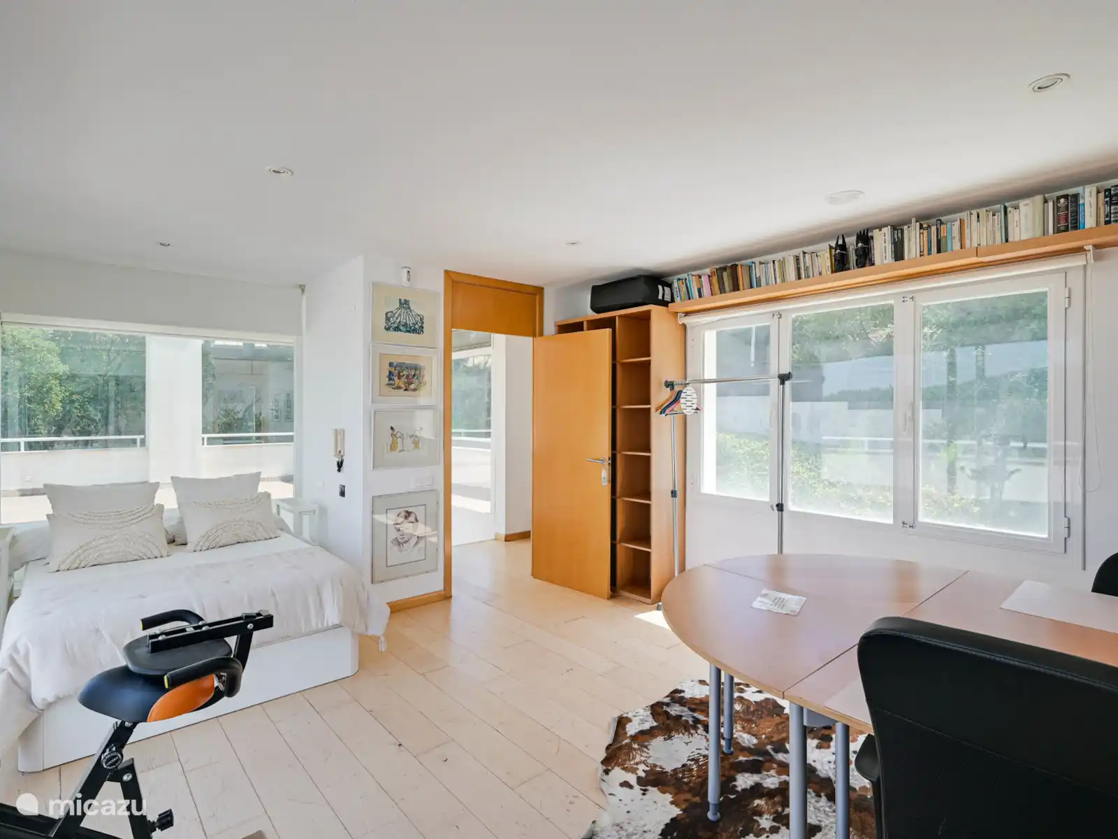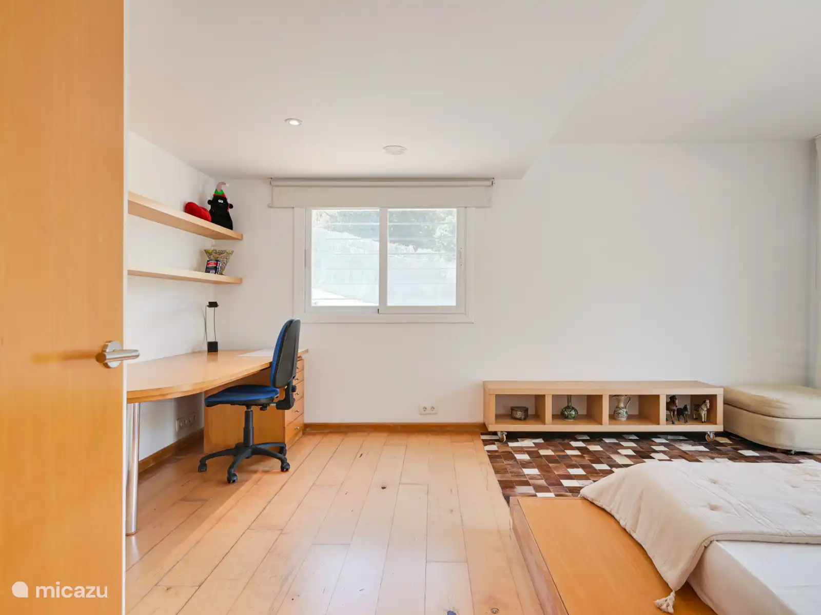 Op de bovenverdieping is een ruimte die functioneert als kantoor/slaapkamer met een tweepersoonsbed, toegang tot een ander terras en een eigen badkamer, ideaal als privé- of extra rustruimte.