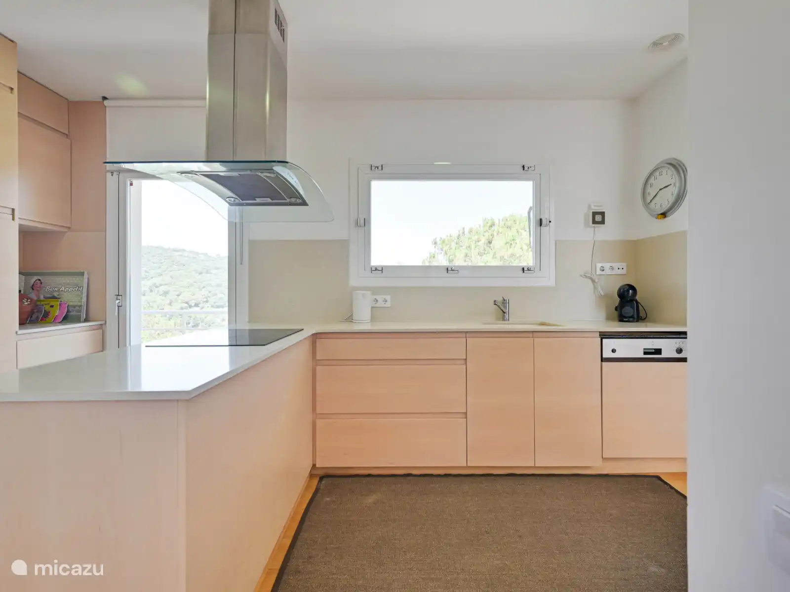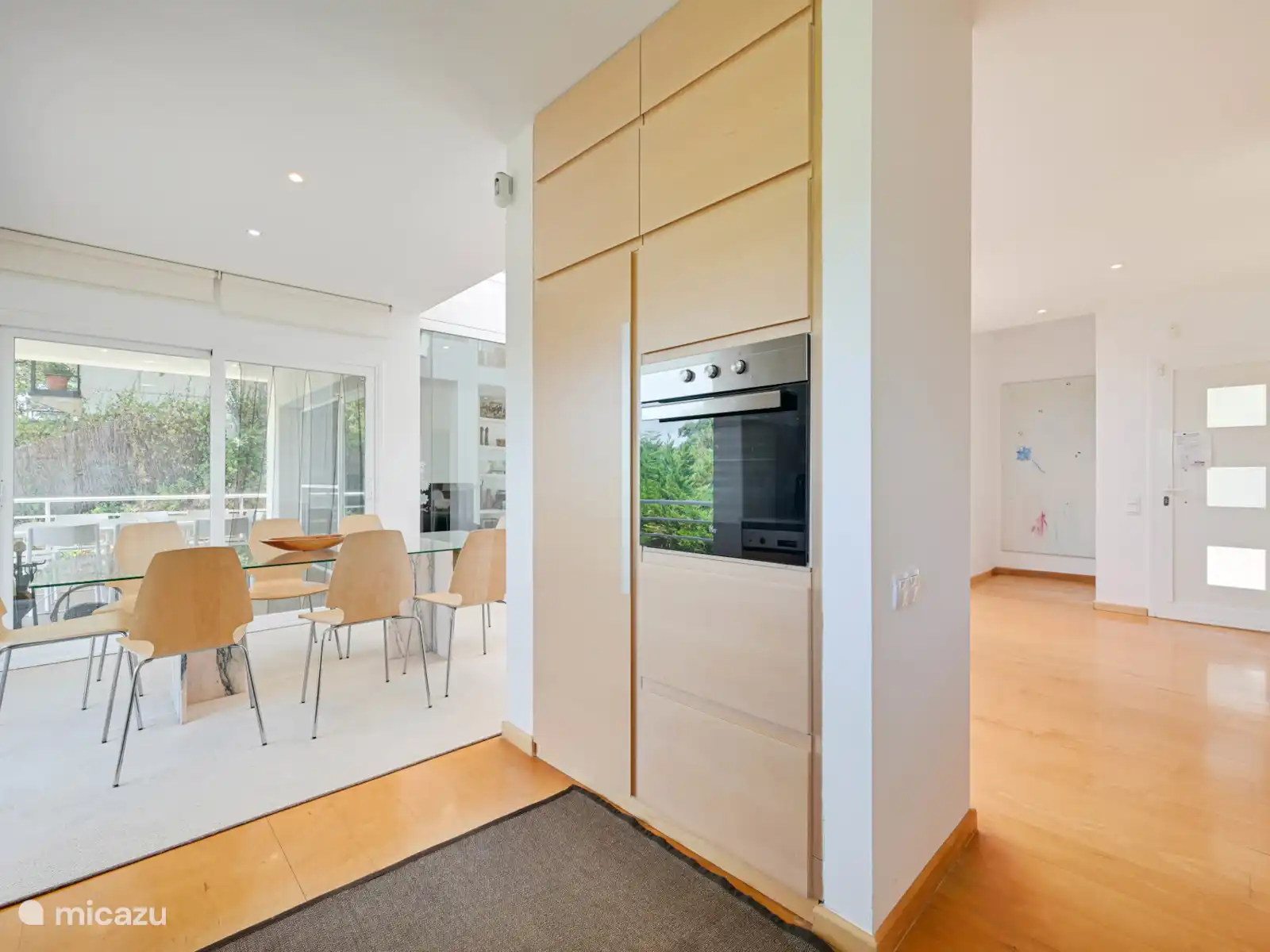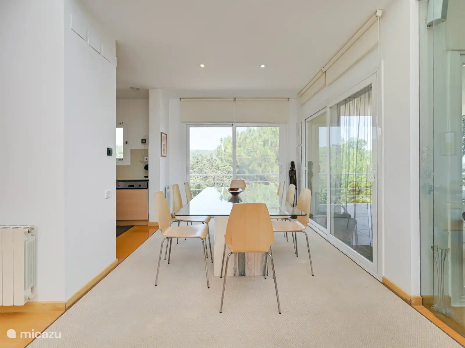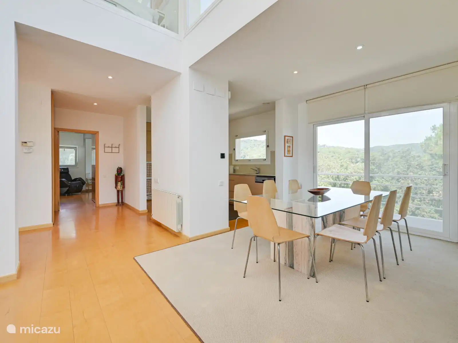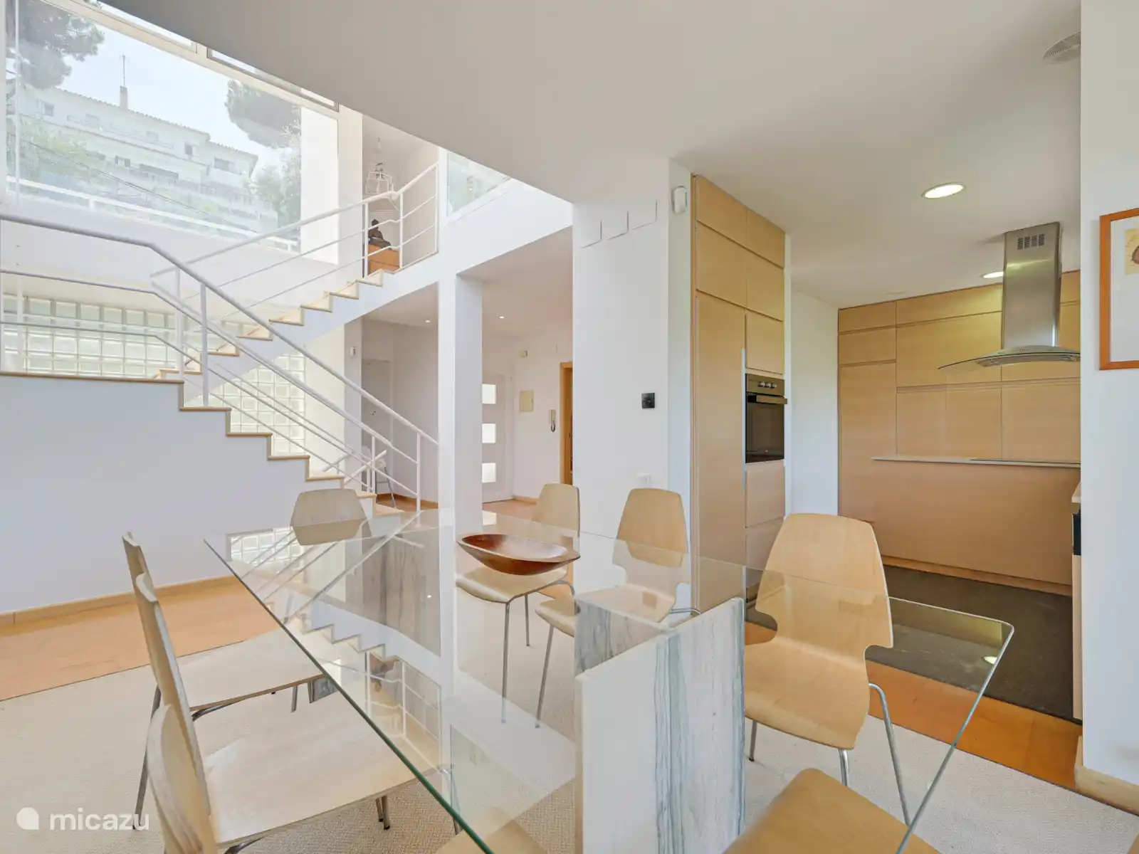 Op de begane grond bevindt zich de keuken-eetkamer met grote ramen die de ruimte vullen met natuurlijk licht. Vanaf hier bereik je een terras met buitentafel en barbecue, ideaal voor maaltijden in de buitenlucht.