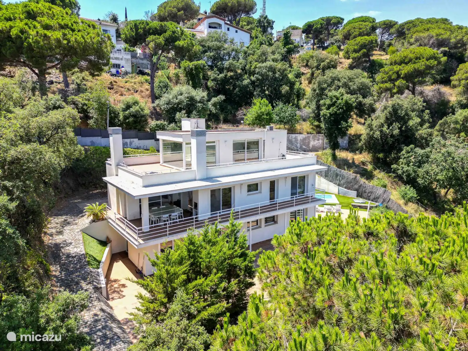Een verdieping lager zijn drie dubbele slaapkamers, allemaal met toegang tot het terras en het zwembadgedeelte, evenals twee volledige badkamers.