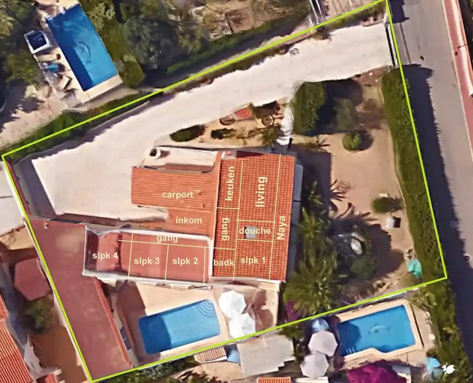 Alleenstaande villa op omheind terrein van 1000 m² met grote oprit, tuin, grote volledige ingerichte buitenkeuken (kookvuur/koelkast-vriezer/vaatwasser/barbecue/koffiezet) en privé-zwembad (8x4) met inlooptrap en omliggend terras,  badkamer, douchekamer, keuken, woonkamer en grote eetruimte met zicht op de tuin.