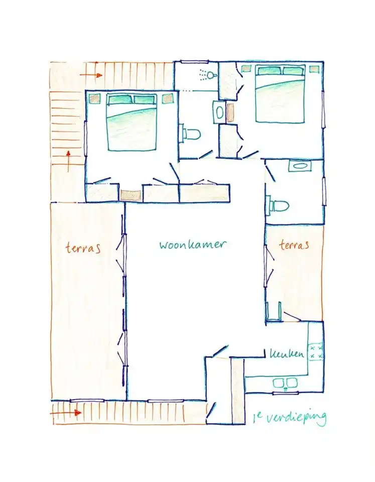 - Op de 1e etage bevindt zich de woonkamer, keuken, 2 slaapkamers, 2 badkamers (een met wastafel, douche en toilet en een met wastafel, toilet en droger). Daarnaast twee overdekte terrassen (noemt men hier naya’s).