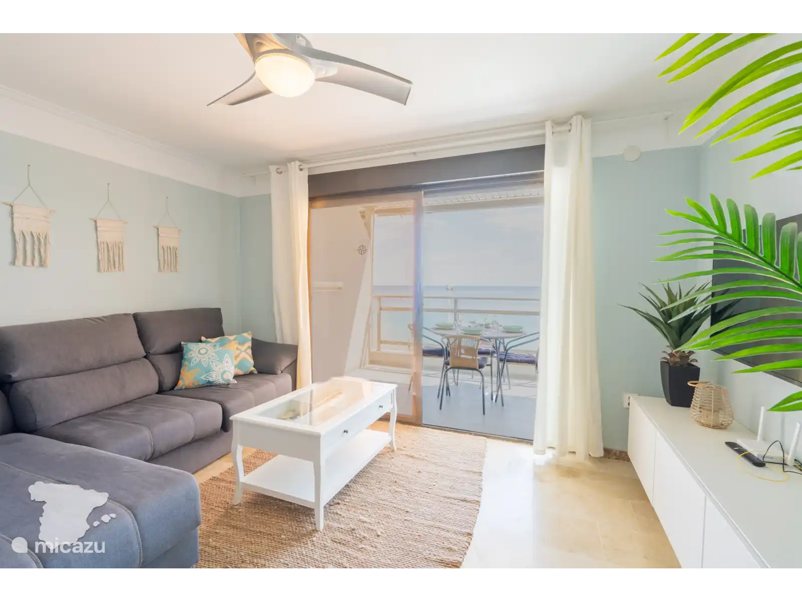 Ontspan in de gezellige woonkamer, ingericht met een comfortabele bank, een eettafel om te genieten van maaltijden, gratis WiFi, een tv voor entertainment en een plafondventilator. Bovendien kunt u vanuit uw woonkamerraam genieten van een adembenemend uitzicht op zee. Stap het balkon op, waar u kunt genieten van uw ochtendkoffie of buiten aan tafel kunt dineren voor vier personen terwijl u geniet van het schilderachtige uitzicht op zee.