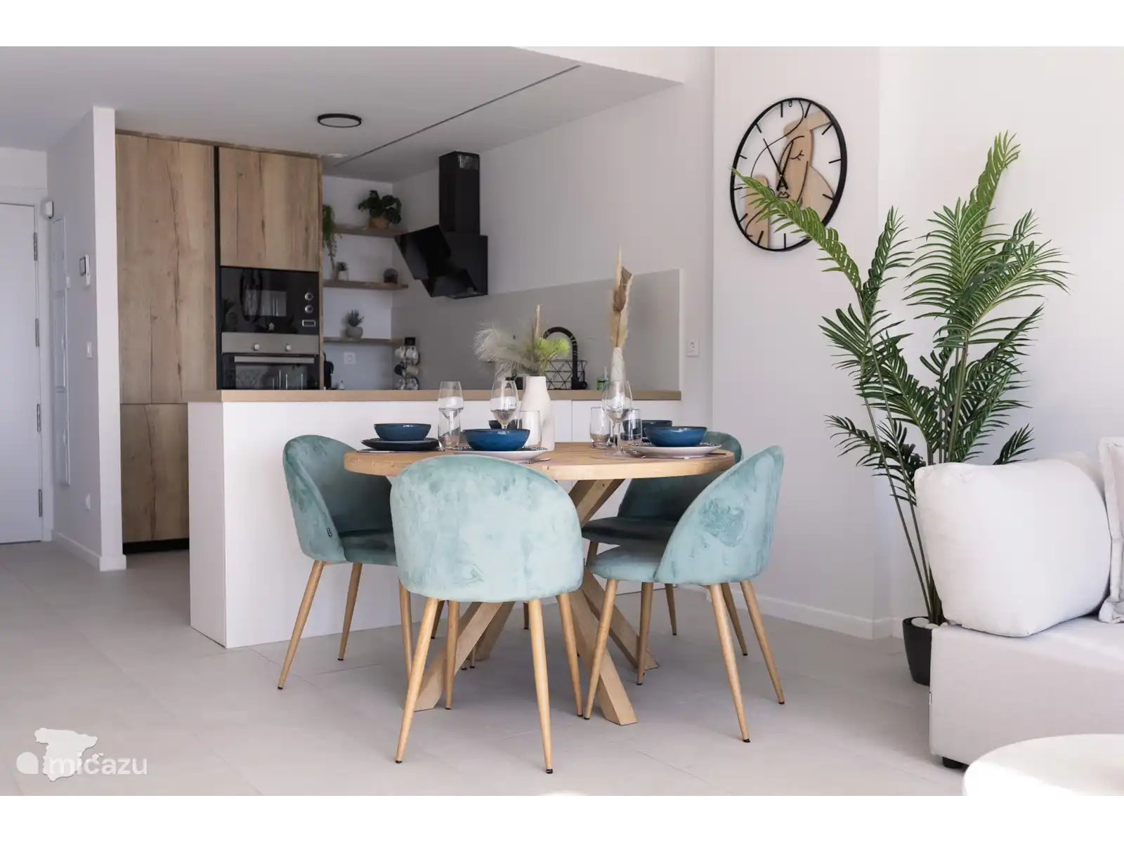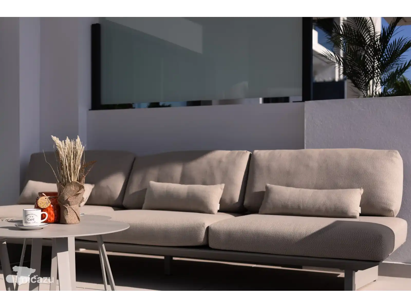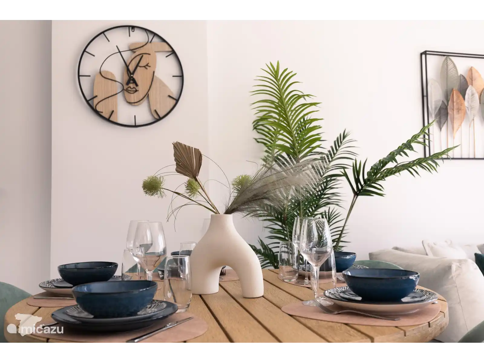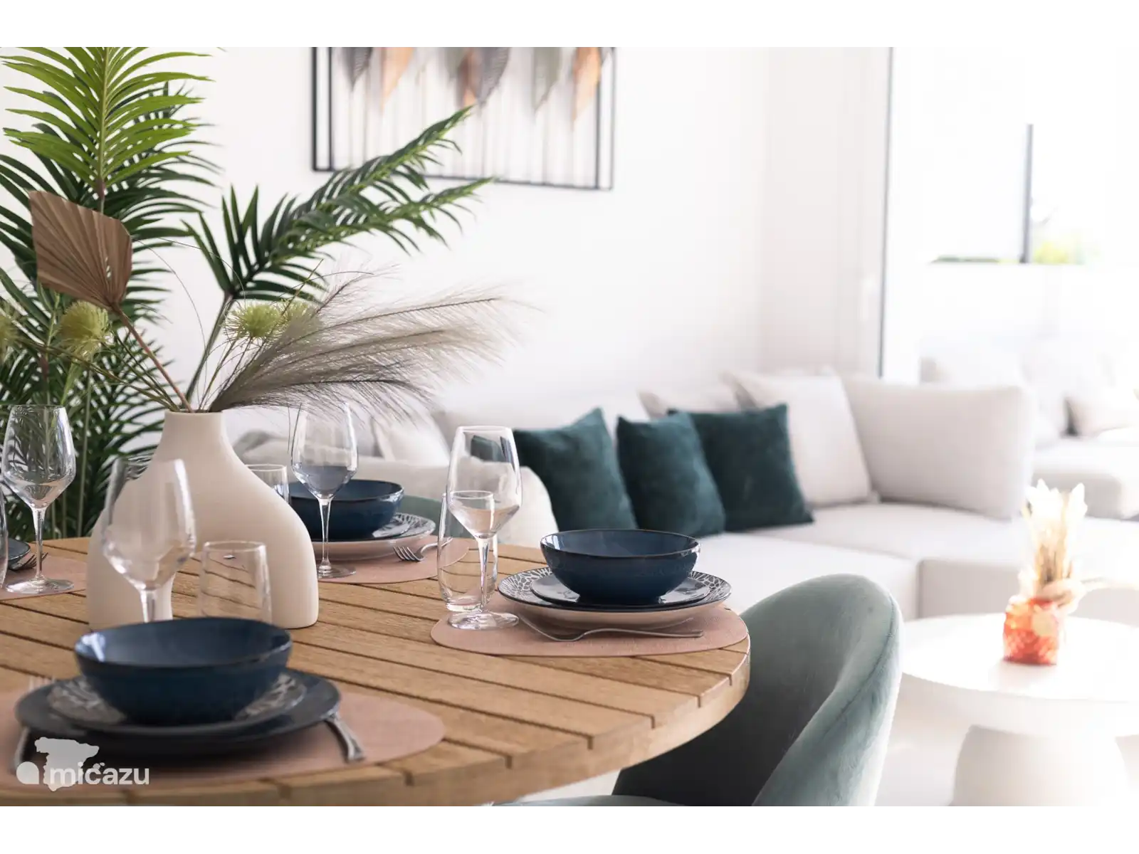 De eethoek, handig gelegen naast de keuken, loopt moeiteloos over in de gezellige loungeruimte, waar een zachte bank en een smart-tv de perfecte setting bieden om te ontspannen. Vanaf hier stapt u door naar het ruime balkon van 28 m², met een overdekte eethoek en een stijlvolle loungeset. Het is de ideale plek om te genieten van uw ochtendkoffie terwijl de zon opkomt of om 's avonds te ontspannen met een drankje terwijl u naar de mediterrane zonsondergang kijkt.