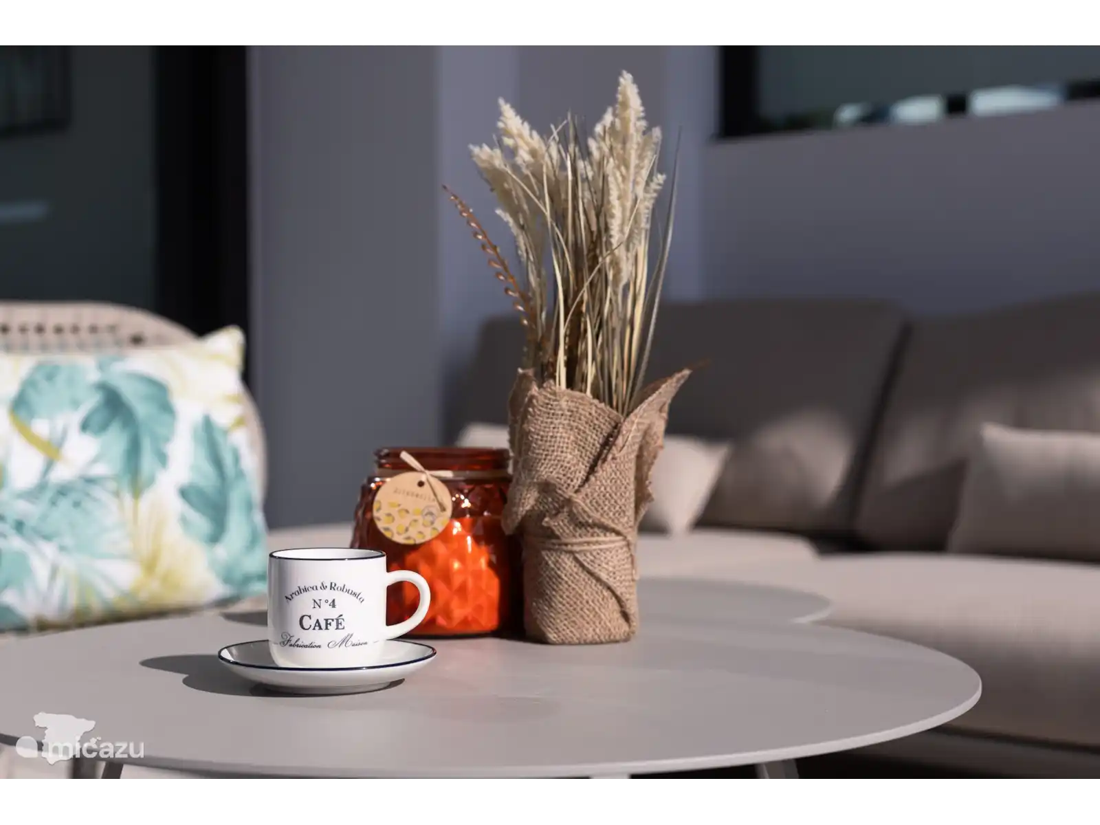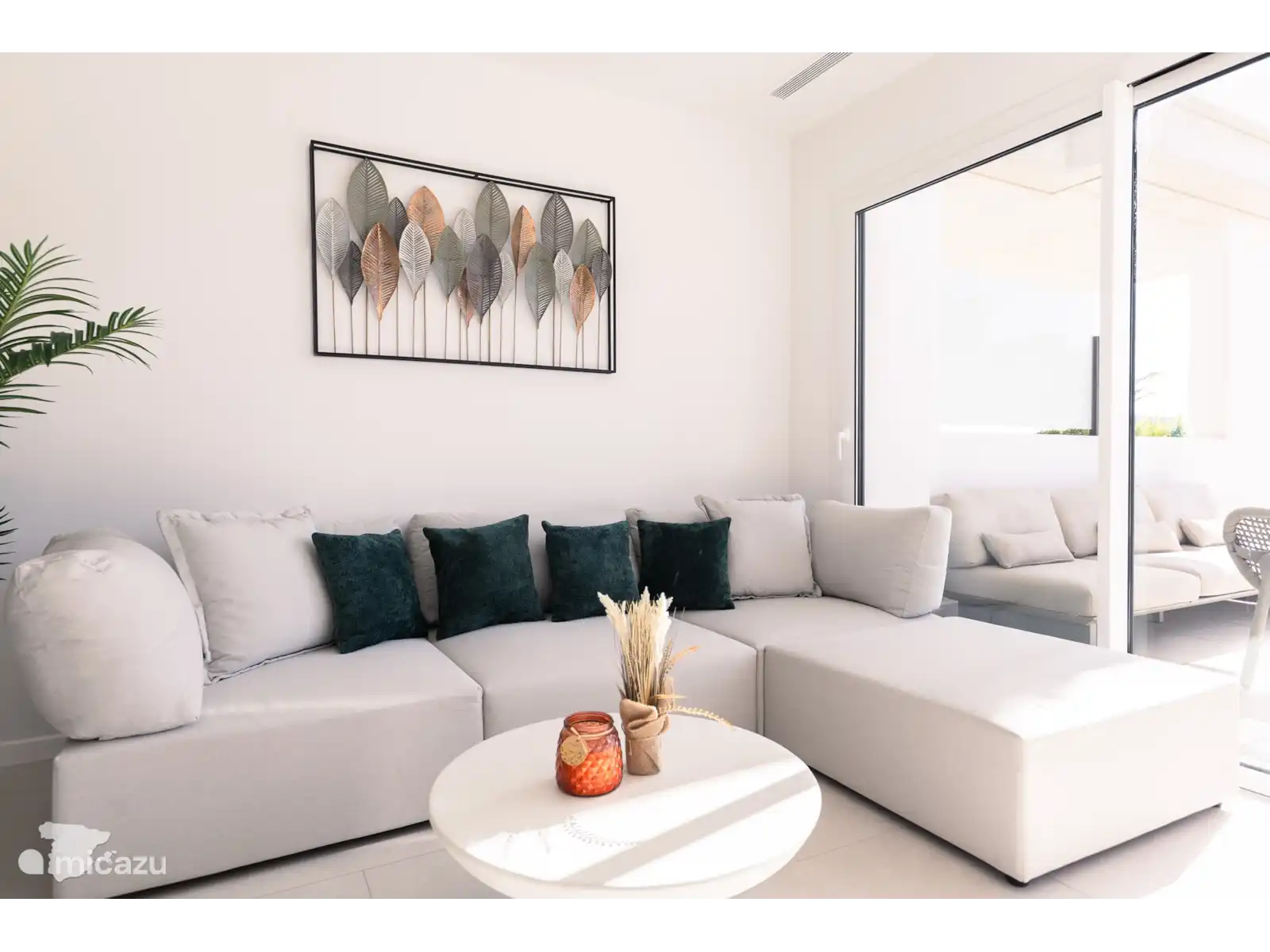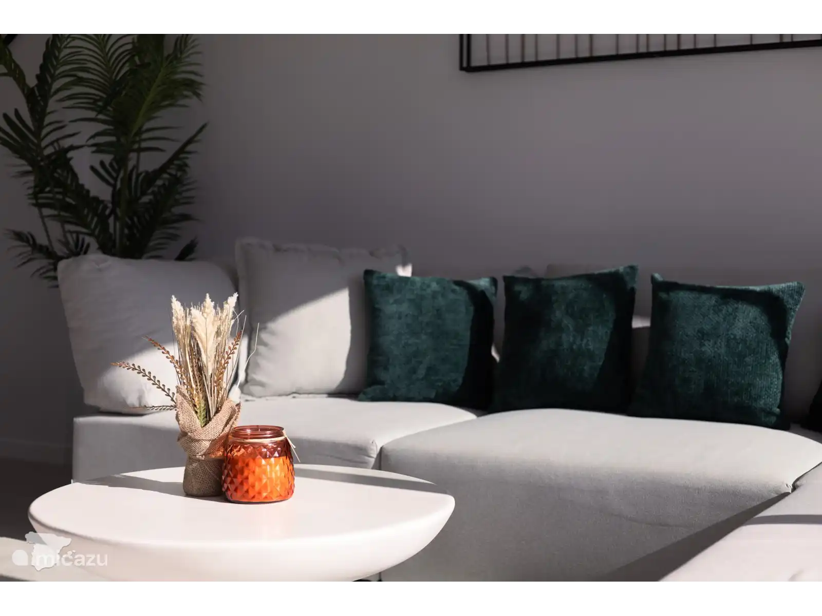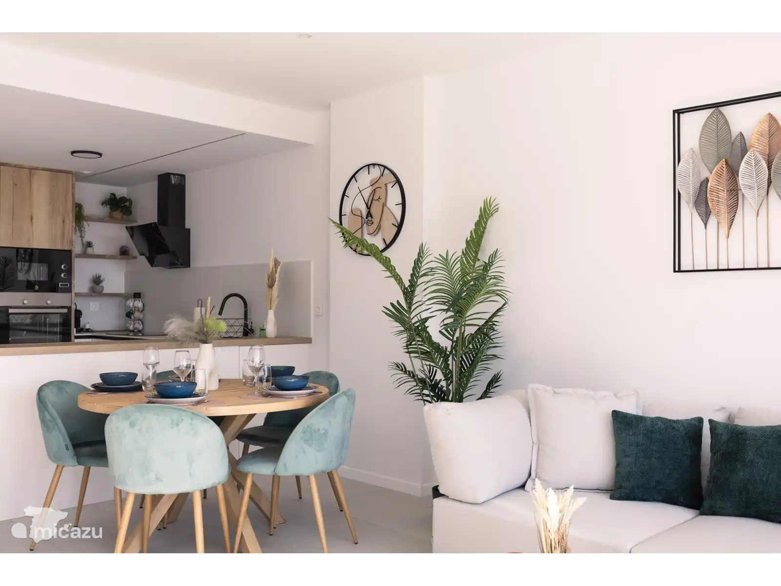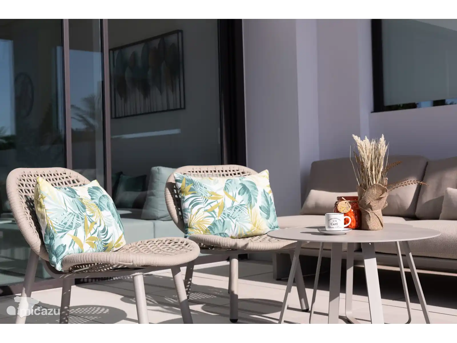De eethoek, handig gelegen naast de keuken, loopt moeiteloos over in de gezellige loungeruimte, waar een zachte bank en een smart-tv de perfecte setting bieden om te ontspannen. Vanaf hier stapt u door naar het ruime balkon van 28 m², met een overdekte eethoek en een stijlvolle loungeset. Het is de ideale plek om te genieten van uw ochtendkoffie terwijl de zon opkomt of om 's avonds te ontspannen met een drankje terwijl u naar de mediterrane zonsondergang kijkt.