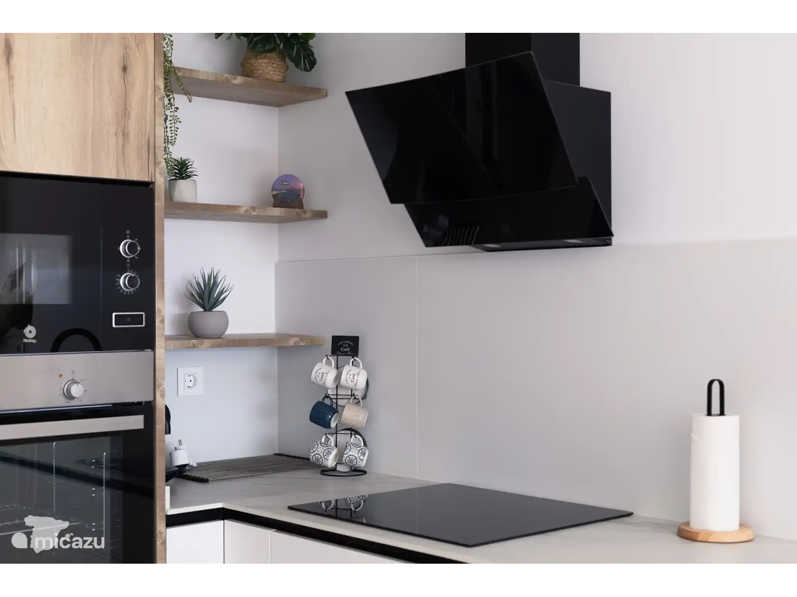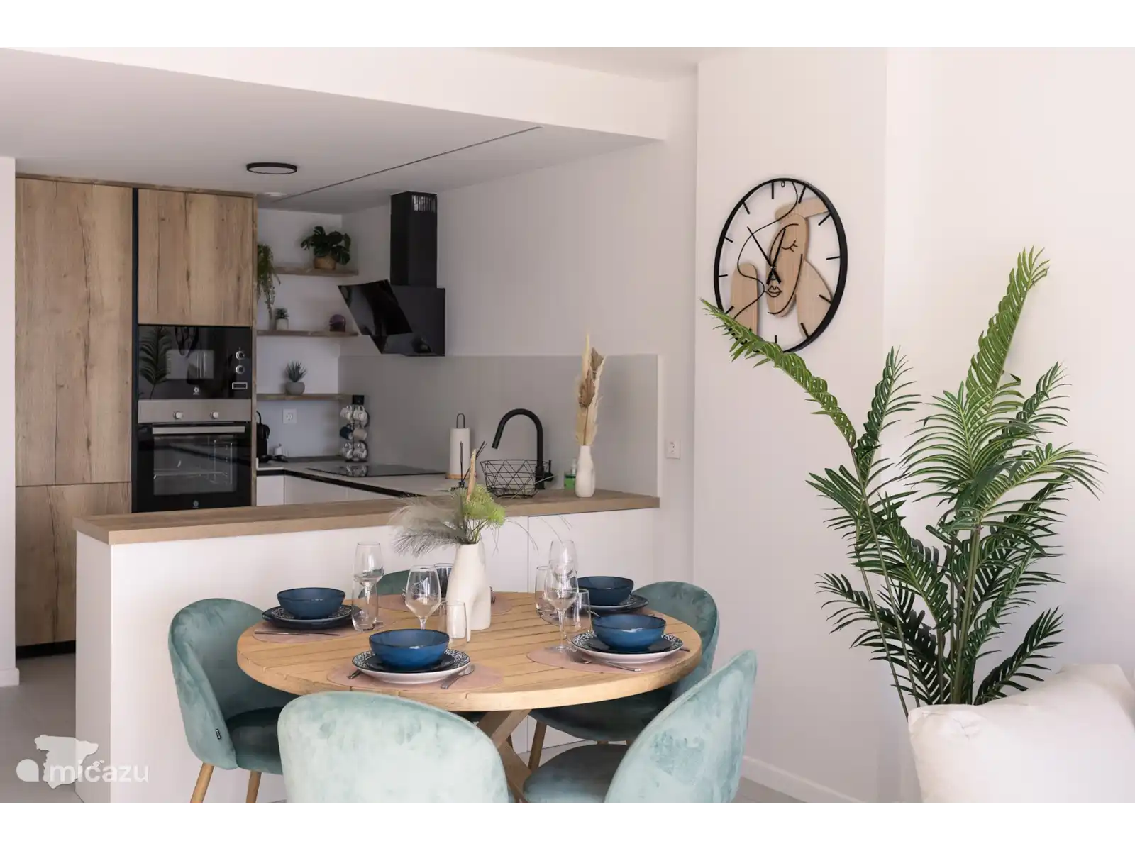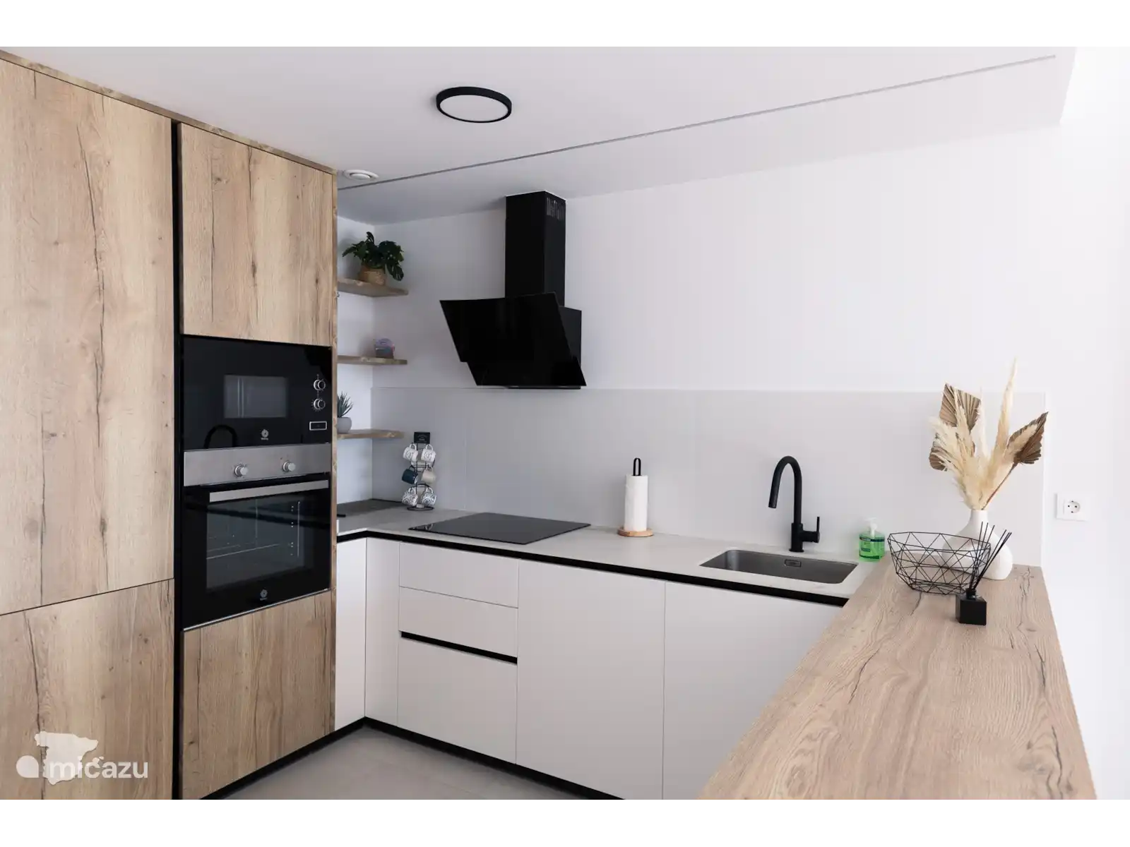 Bij binnenkomst stapt u in een lichte en gastvrije open woon- en eetruimte, uitgerust met geïntegreerde airconditioning voor een comfortabel verblijf. Aan uw rechterhand vindt u een volledig uitgeruste keuken die klaar staat om uw culinaire creaties te ondersteunen. De keuken is voorzien van alle benodigdheden: een koelkast, vriezer, oven, magnetron, inductie kookplaat, koffiezetapparaat, waterkoker en broodrooster.