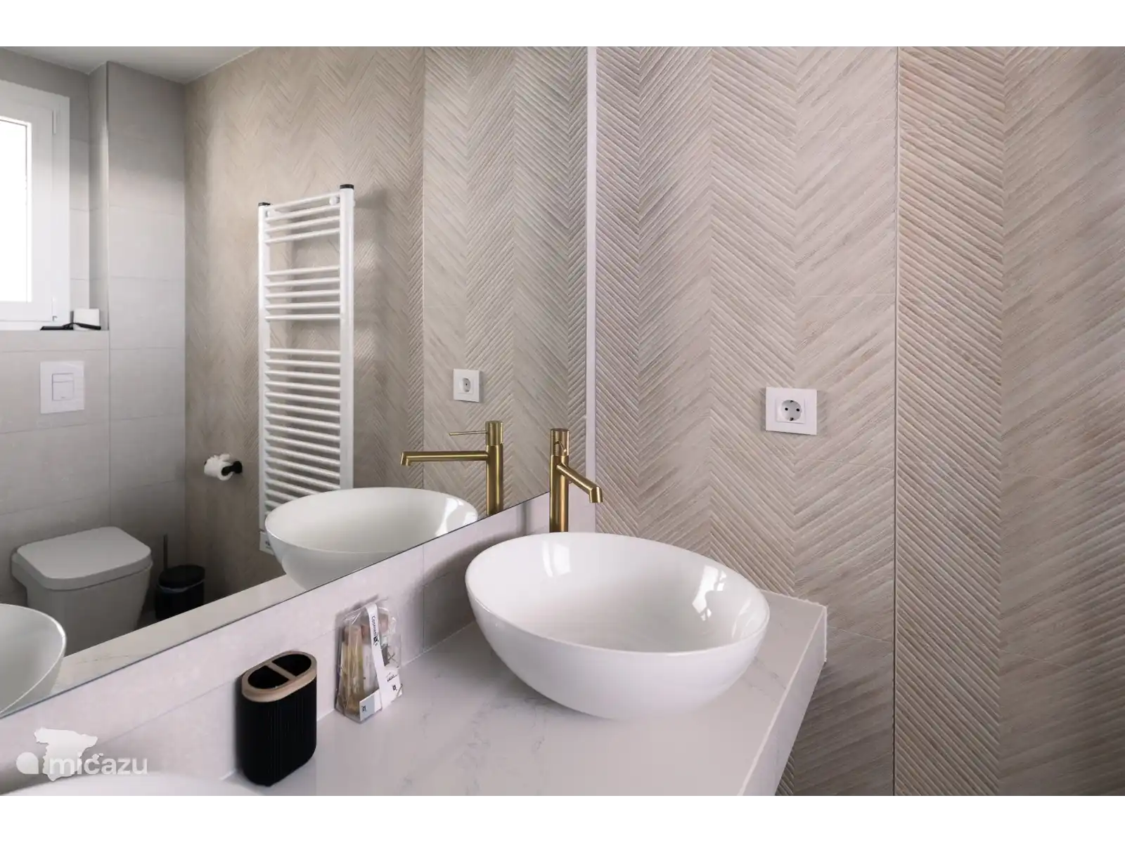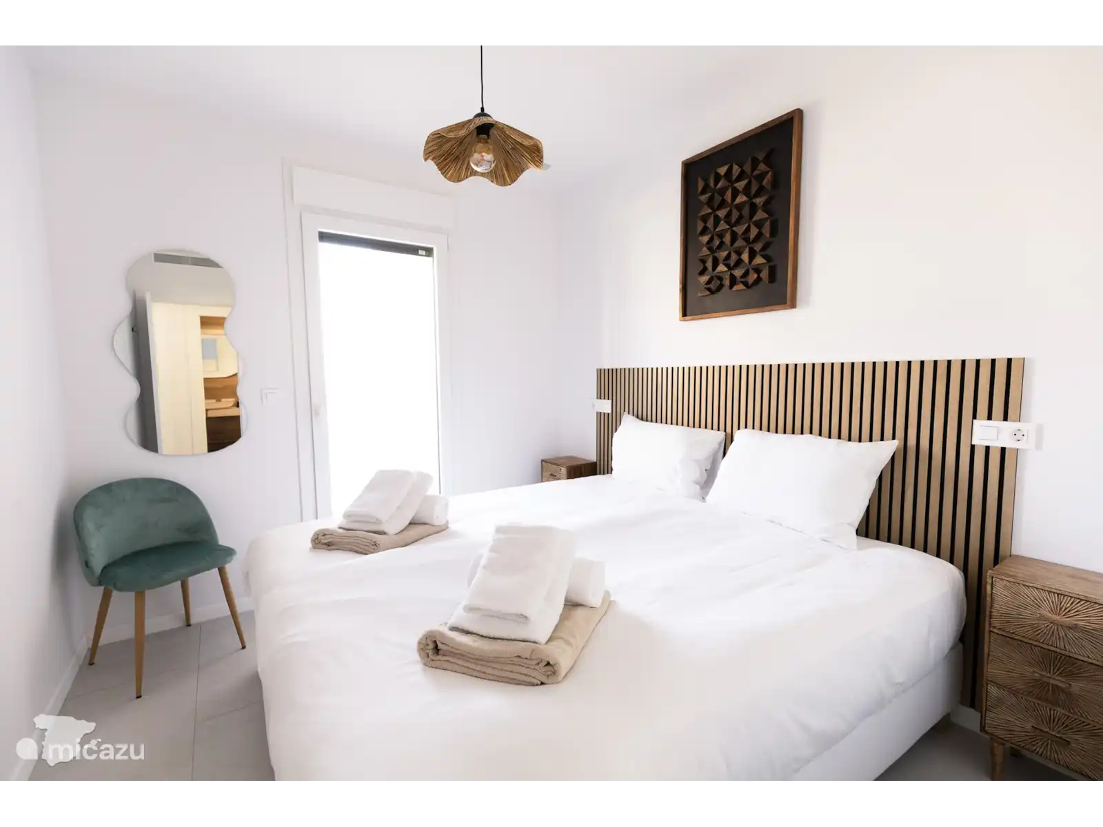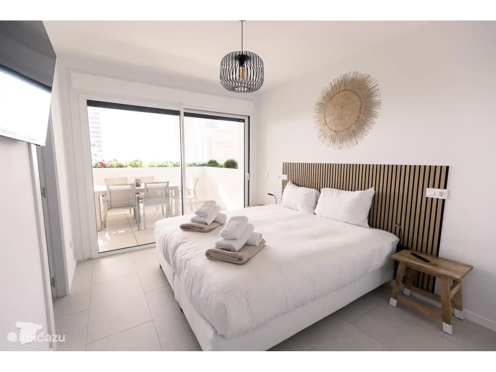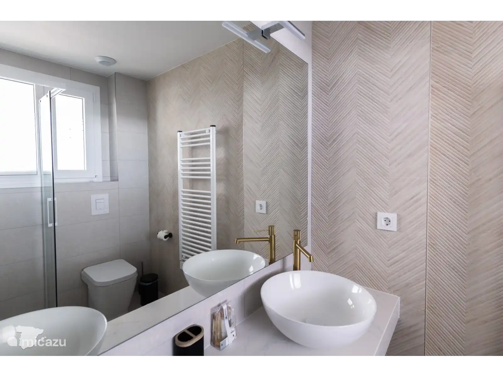 Binnen biedt het appartement drie goed ingerichte slaapkamers met airconditioning en twee moderne badkamers. De master suite dient als een oase van rust, met een comfortabel tweepersoonsbed, voldoende kastruimte, een smart-tv en een prachtig uitzicht op zee. De ensuite badkamer is voorzien van dubbele wastafels, een luxe douche en een toilet. De tweede en derde slaapkamer hebben beide twee eenpersoonsbedden en kastruimte. Een aparte badkamer verderop in de gang biedt extra gemak, met een douche, wastafel en toilet. Voor extra praktisch gemak is er ook een bijkeuken met een wasmachine.